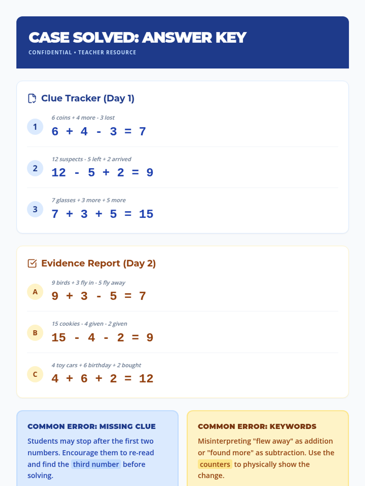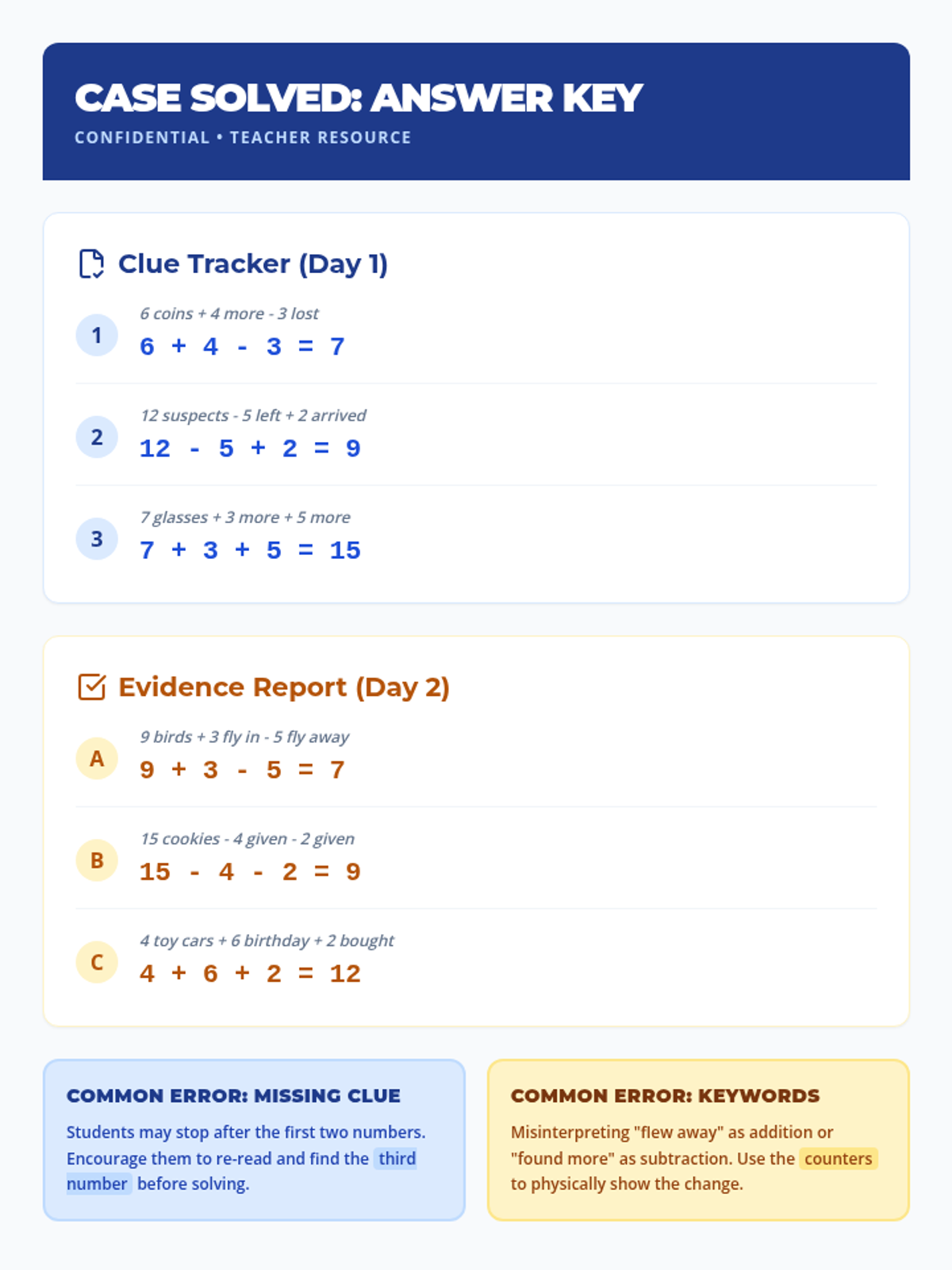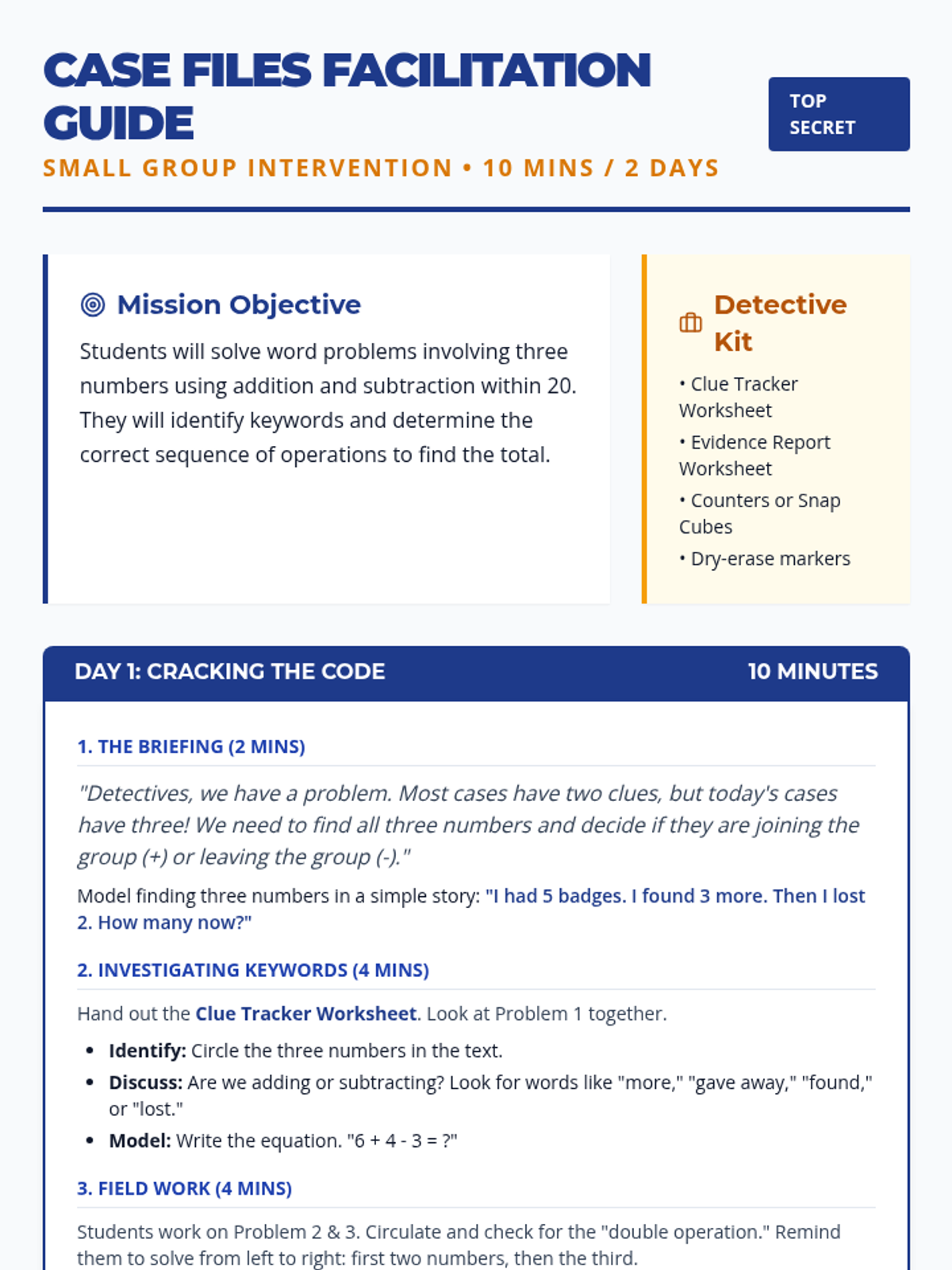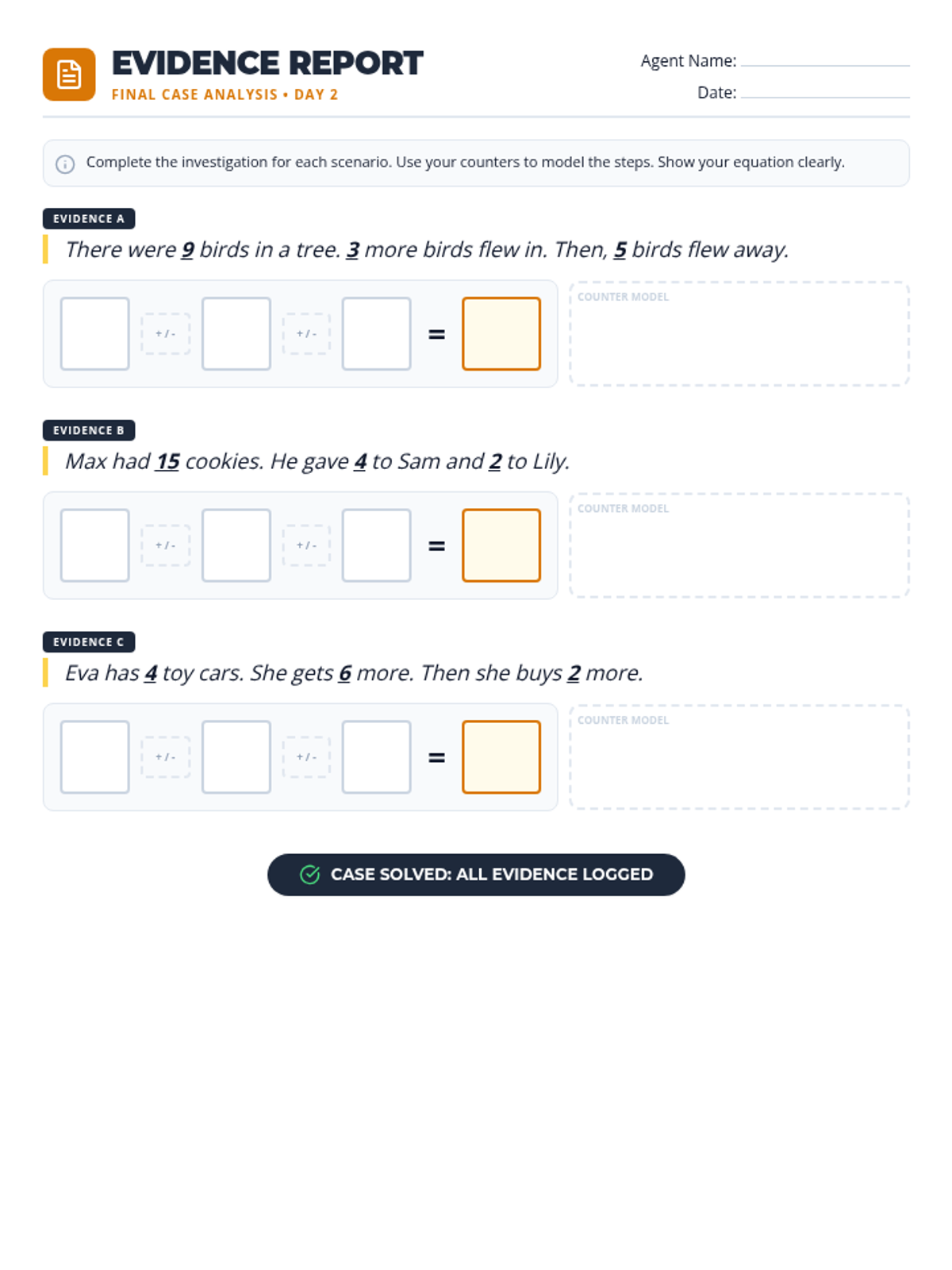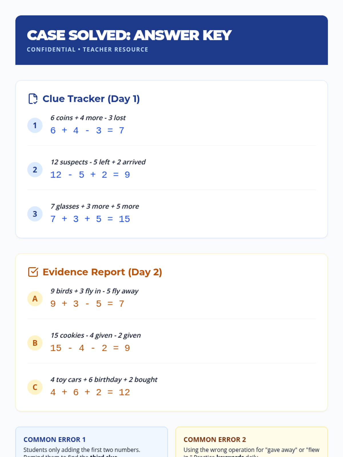 A lesson focused on breaking down and solving multi-step word problems using addition and subtraction through a detective-themed lens.
