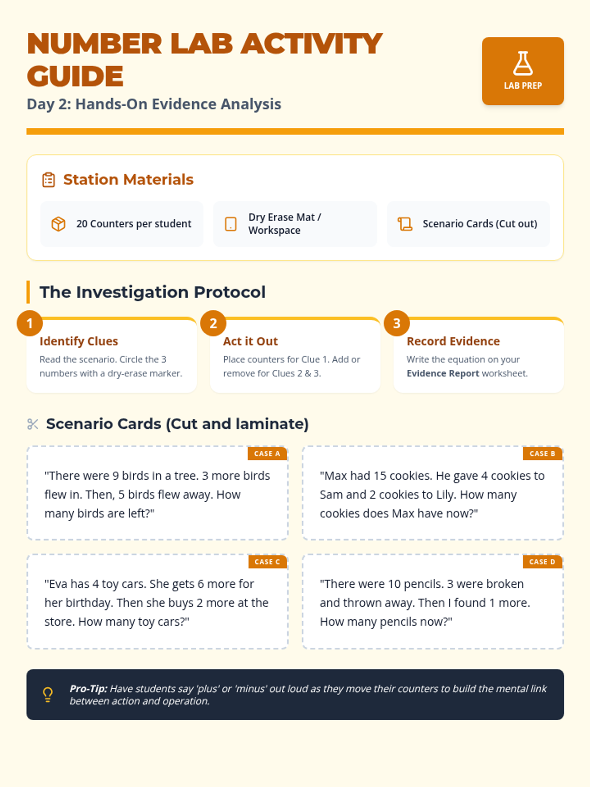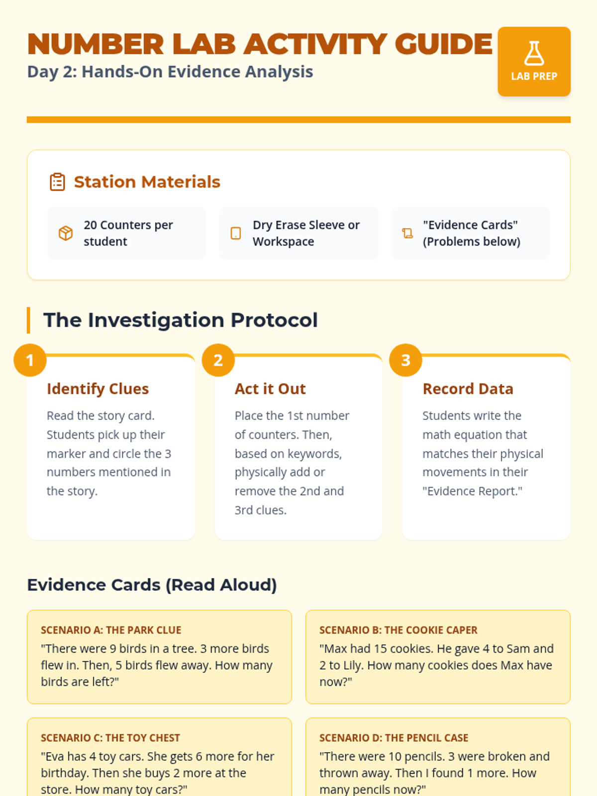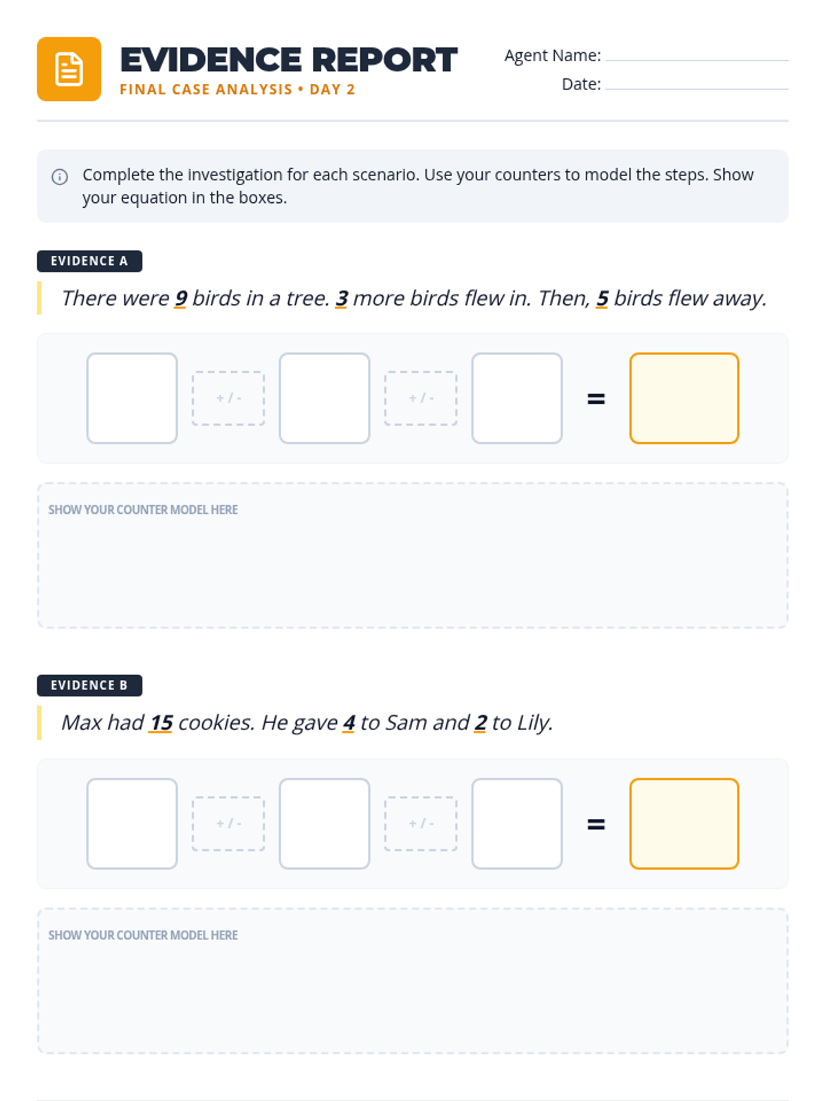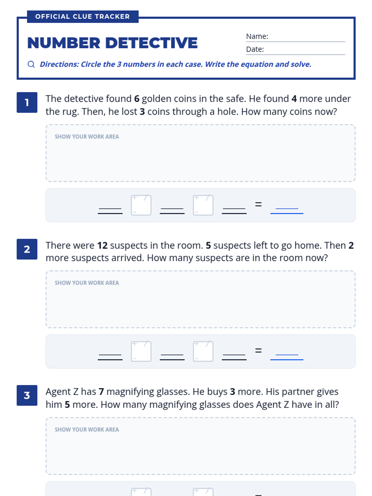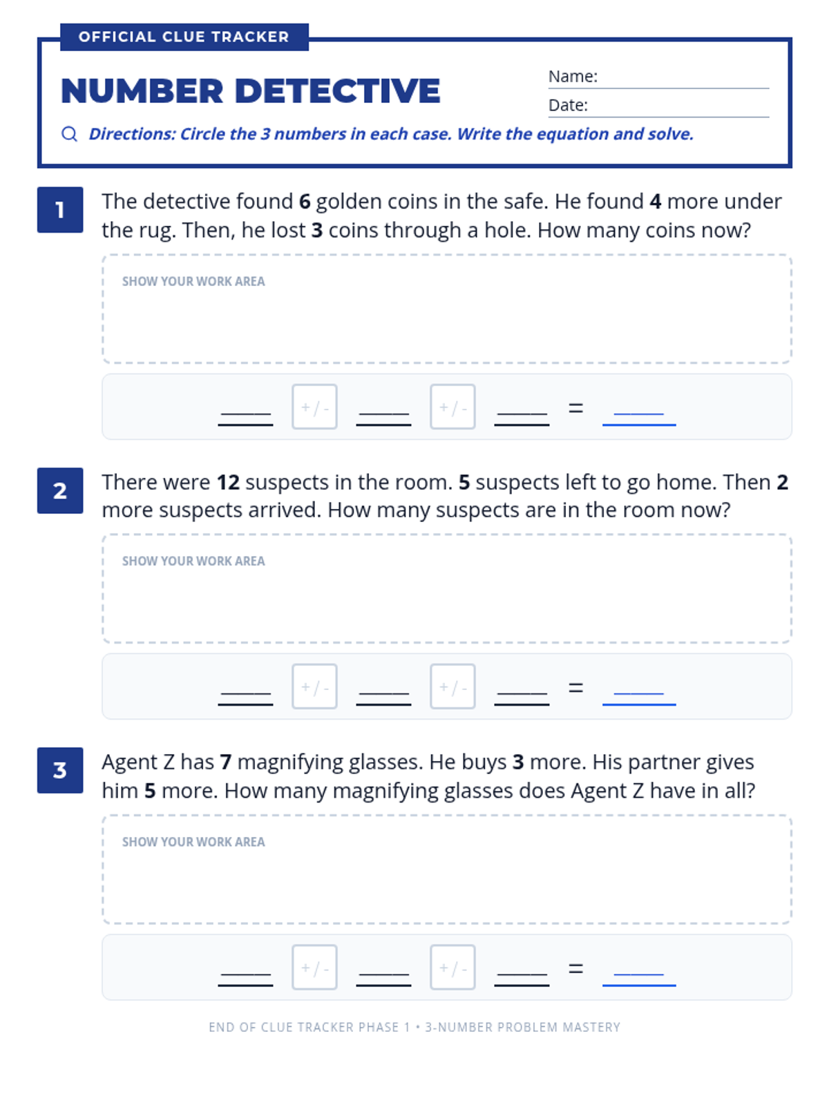 A lesson focused on breaking down and solving multi-step word problems using addition and subtraction through a detective-themed lens.
