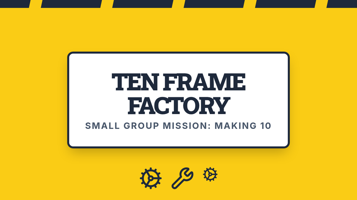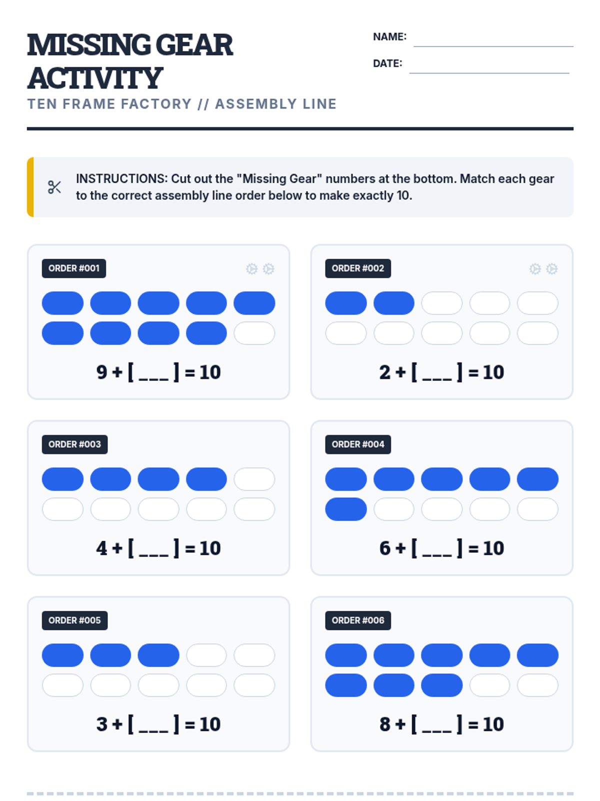 Focuses on visual identification of missing addends using ten-frames in a factory setting.