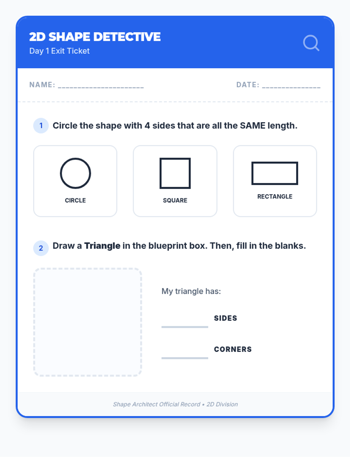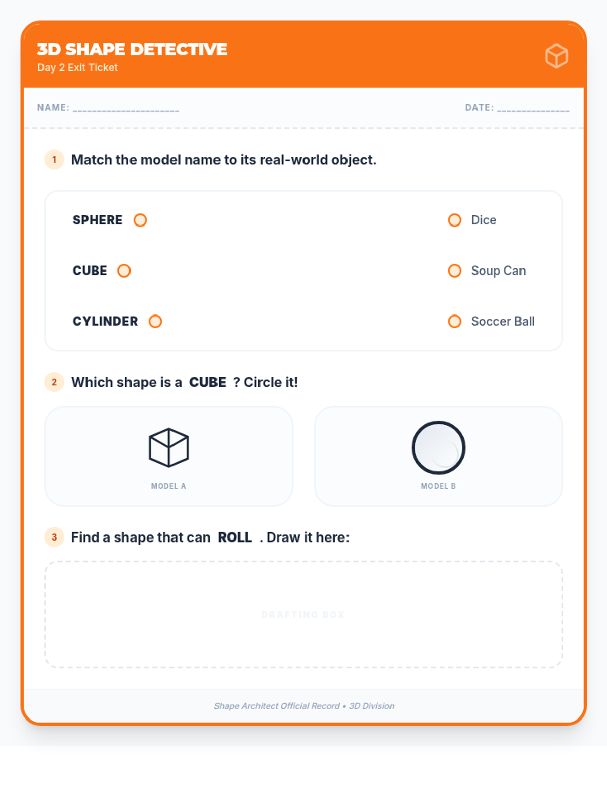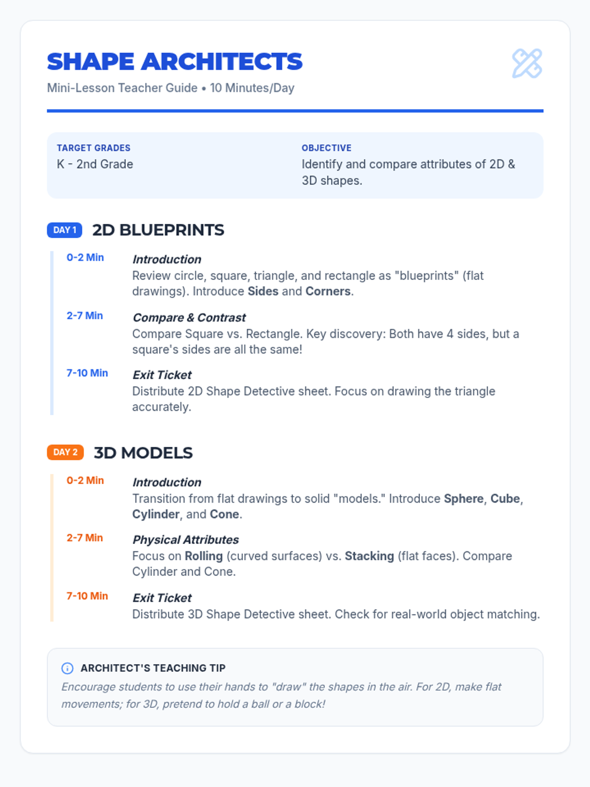 A two-day mini-lesson sequence focused on identifying, describing, and comparing 2D and 3D shapes through the lens of a "Shape Architect". Day 1 covers flat shapes (circles, squares, triangles, rectangles), while Day 2 explores solid shapes (spheres, cubes, cylinders, cones).