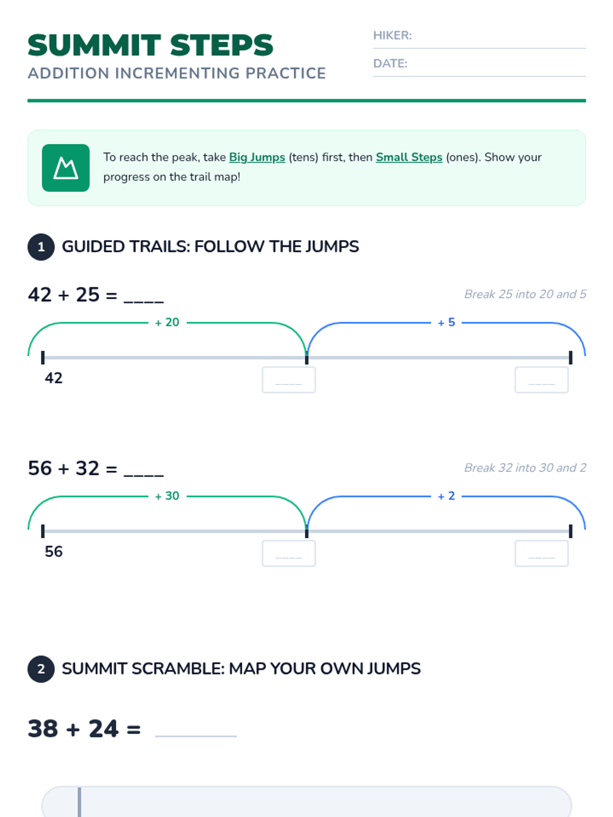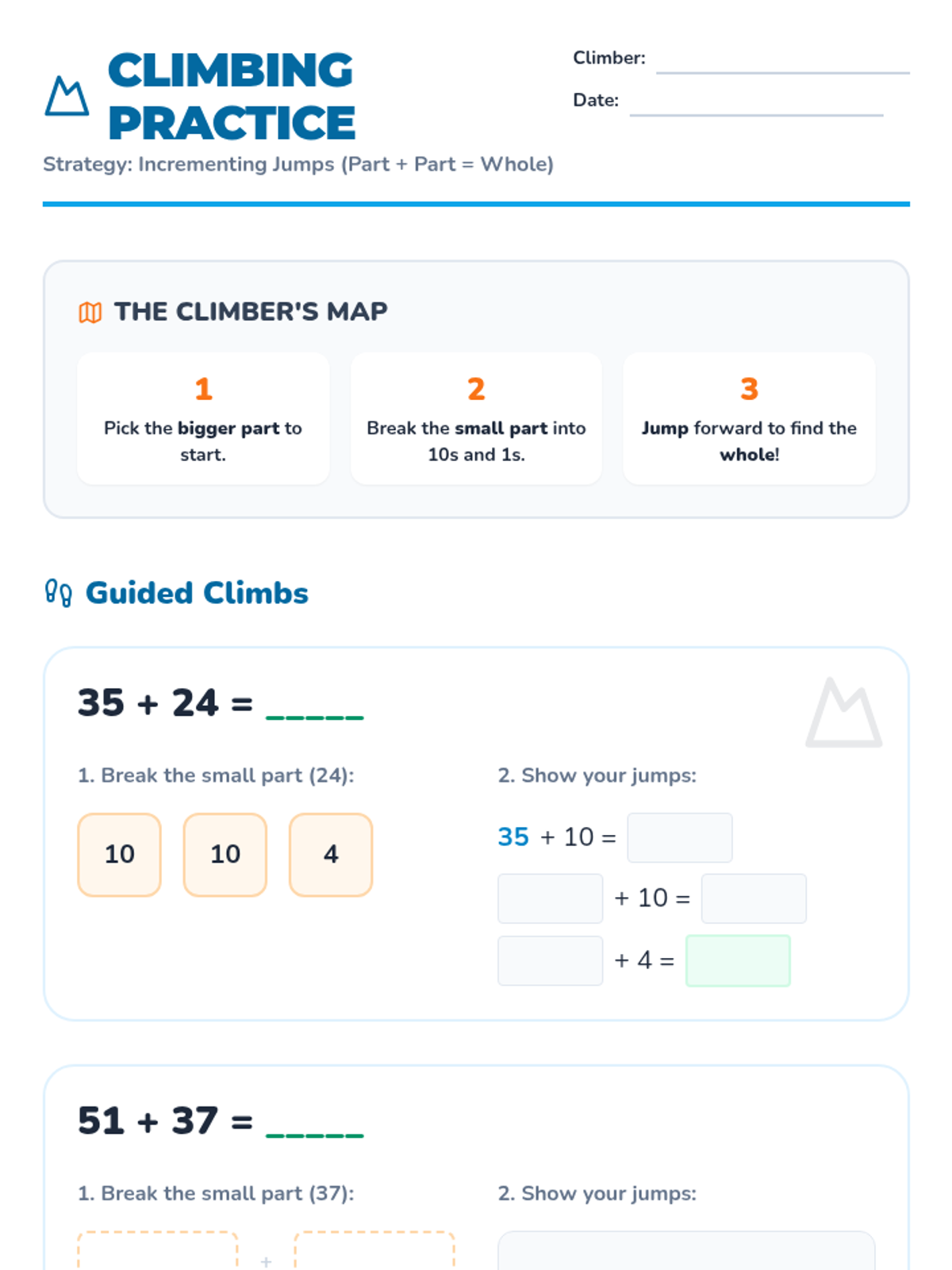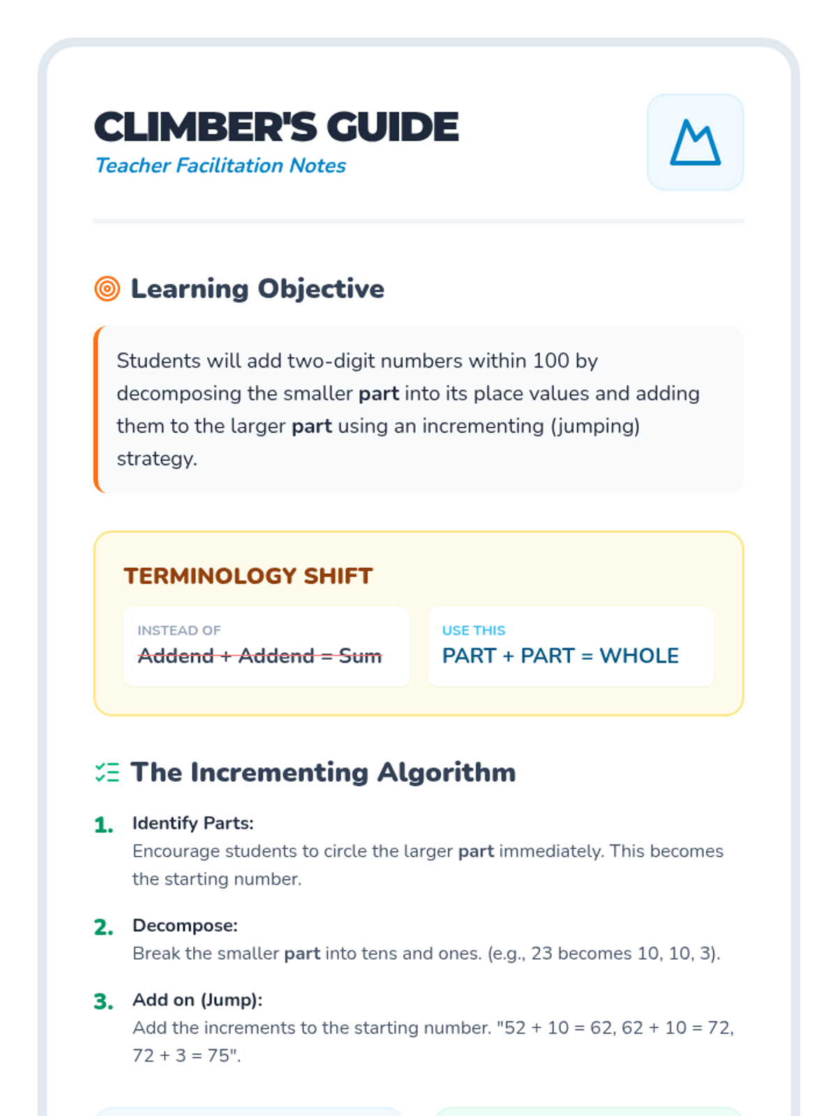 A lesson on addition within 100 using the incrementing algorithm. Students learn to break down the smaller part into its place values and add them step-by-step to the larger part using a "mountain jumping" visual theme.