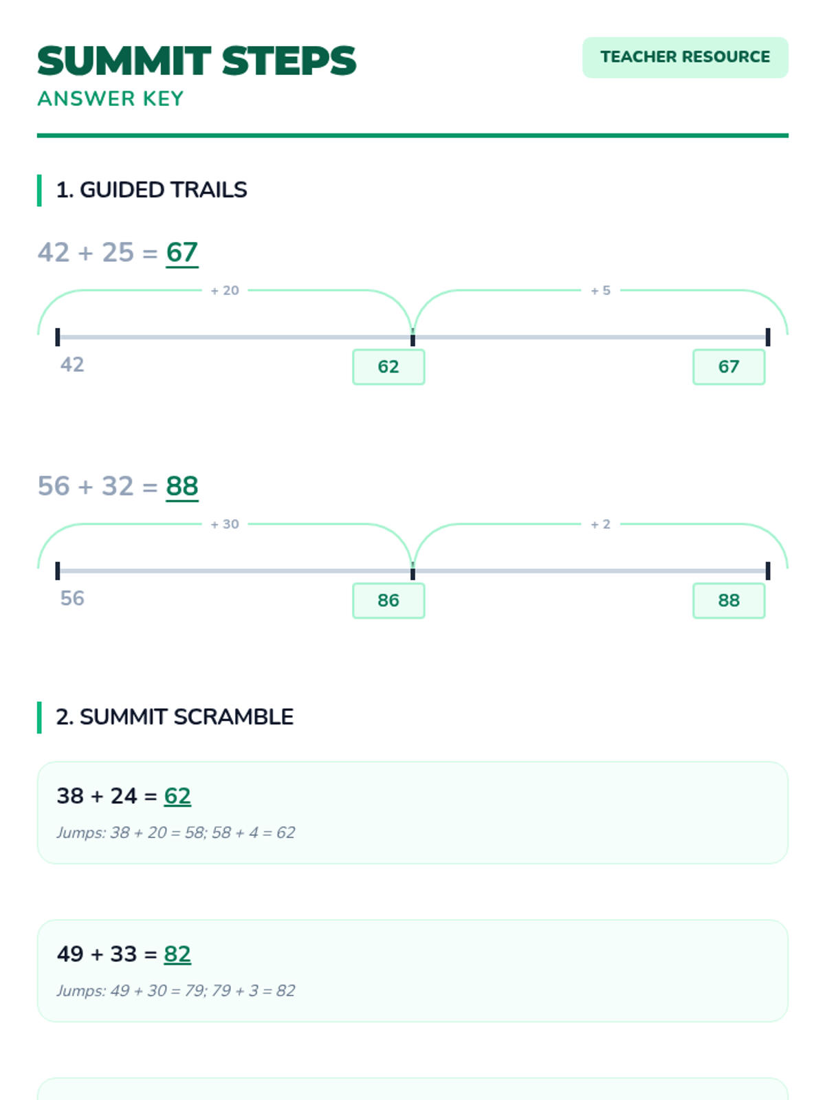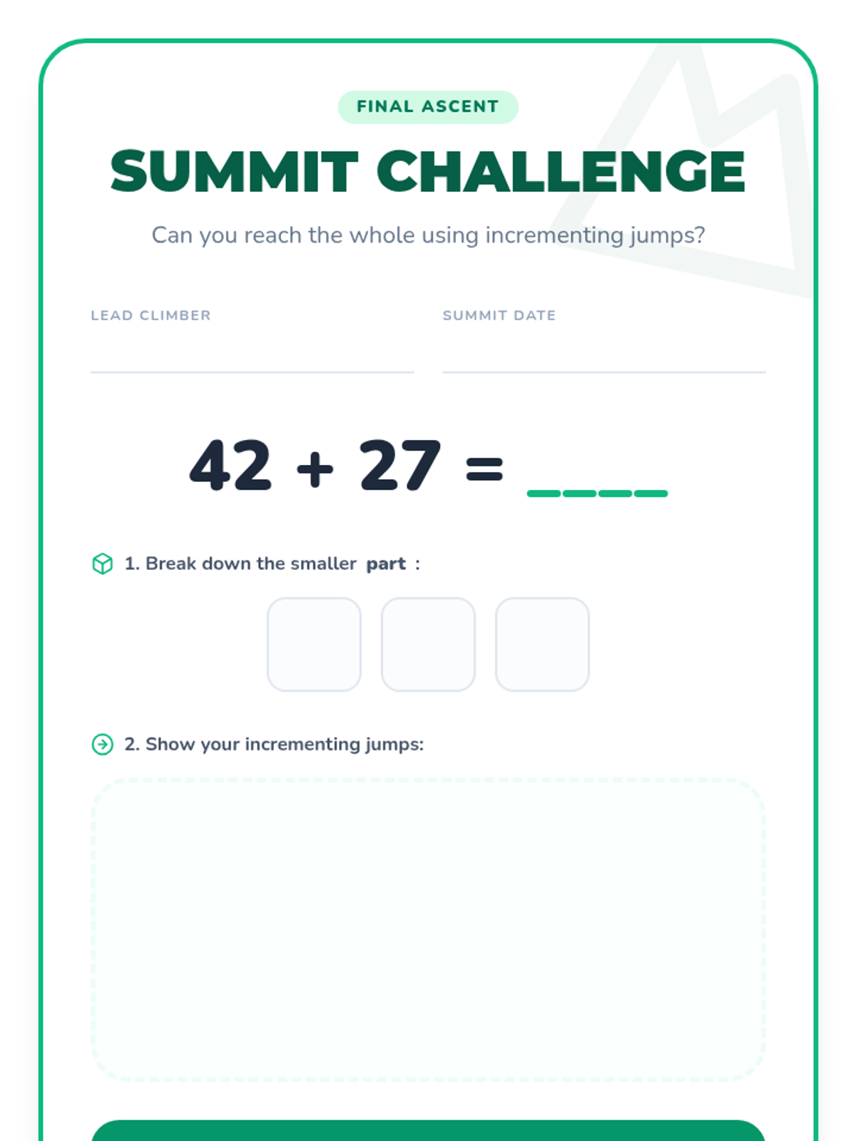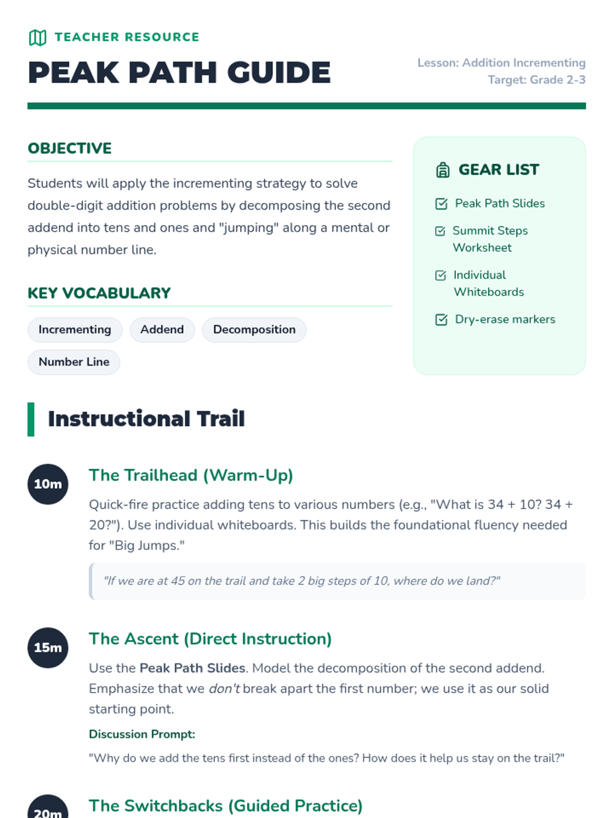 A lesson on addition within 100 using the incrementing algorithm. Students learn to break down the smaller part into its place values and add them step-by-step to the larger part using a "mountain jumping" visual theme.