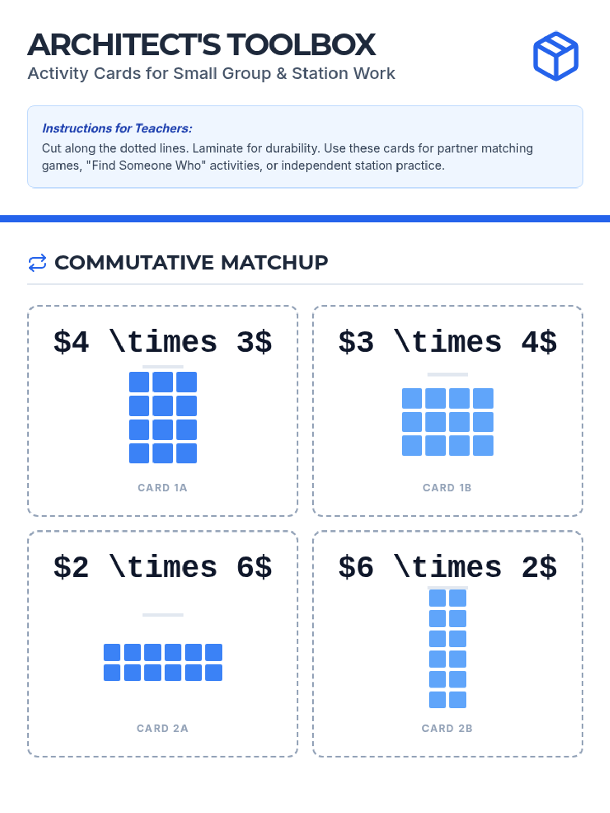 Students reinforce the commutative property by translating equal groups into arrays and vice versa.
