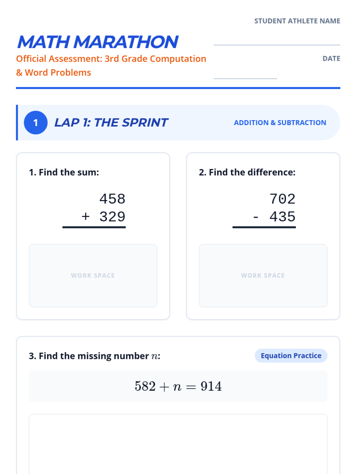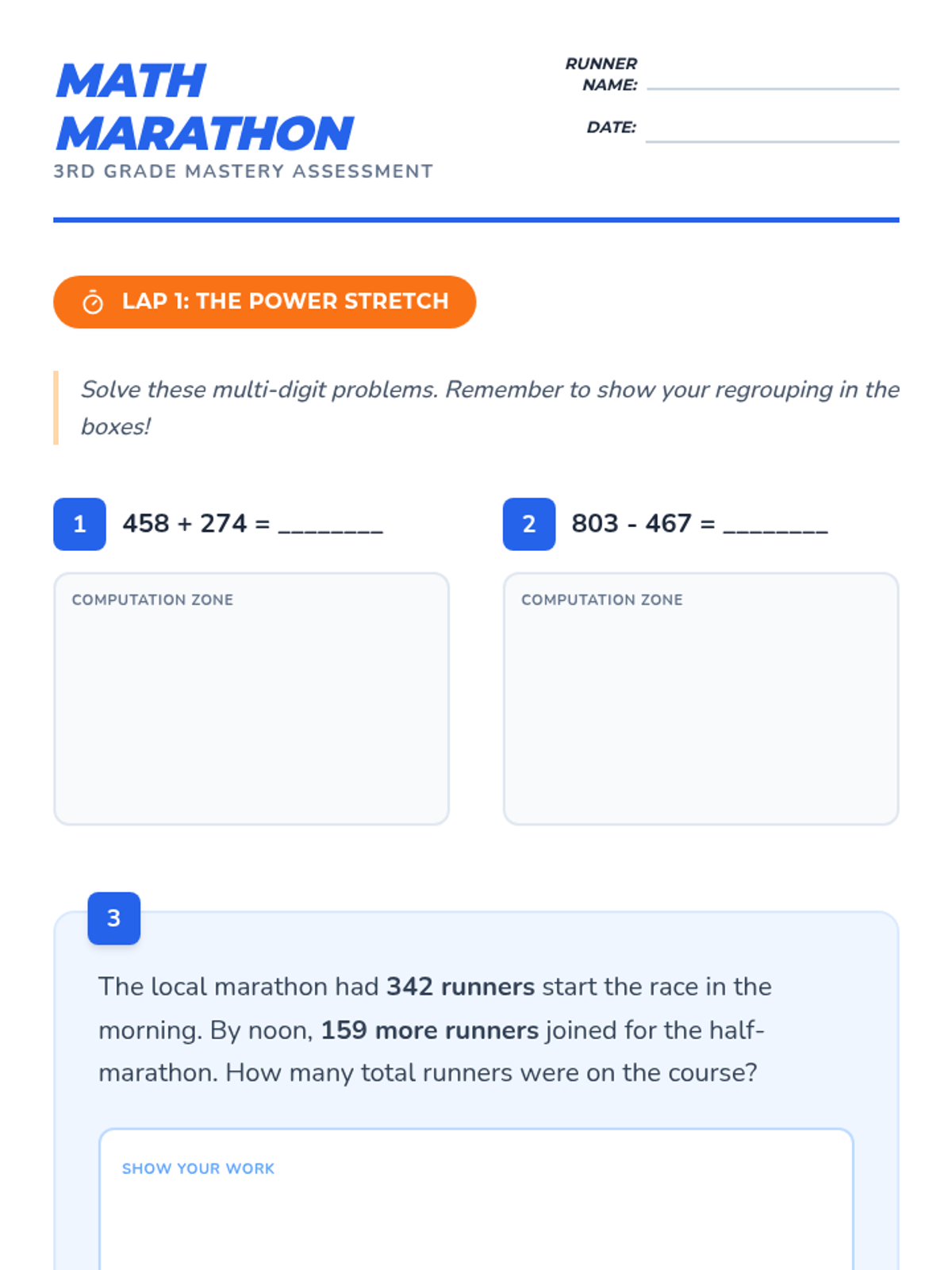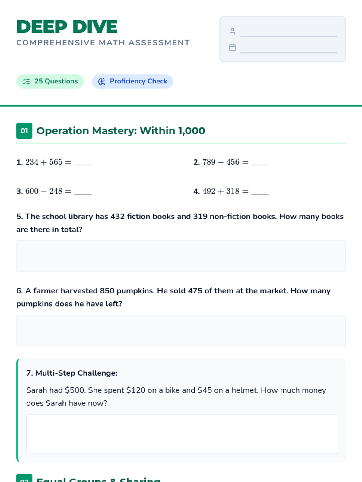 A comprehensive 3rd-grade math assessment and review focusing on computation skills and multi-step word problems within 1,000 and basic multiplication/division.