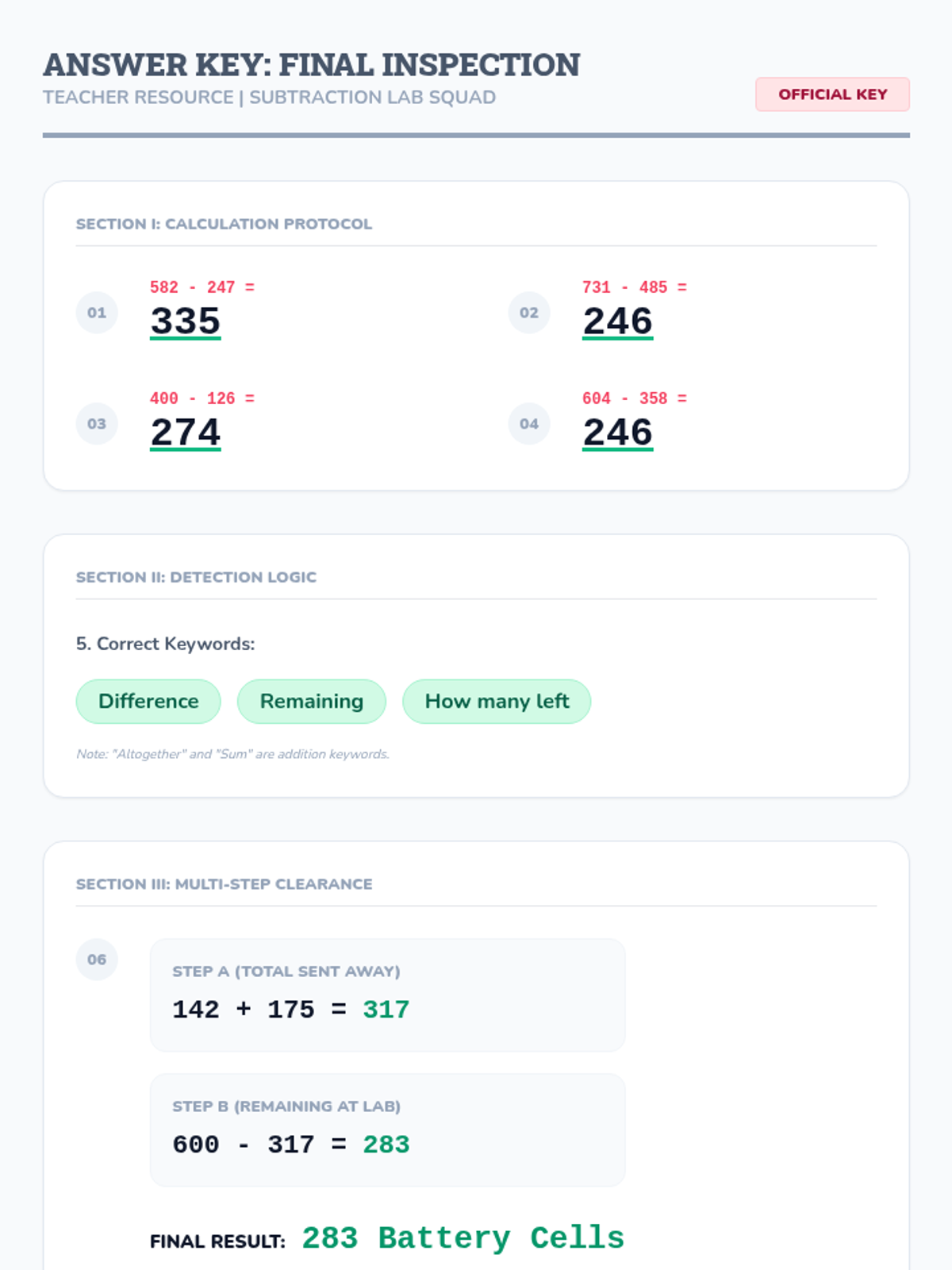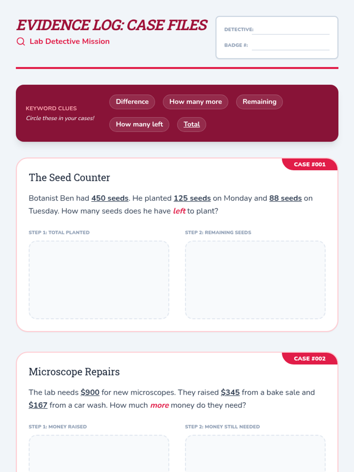 Students apply their subtraction skills to solve complex, multi-step word problems. The lesson focuses on identifying keywords and creating 'evidence logs' to organize mathematical steps.