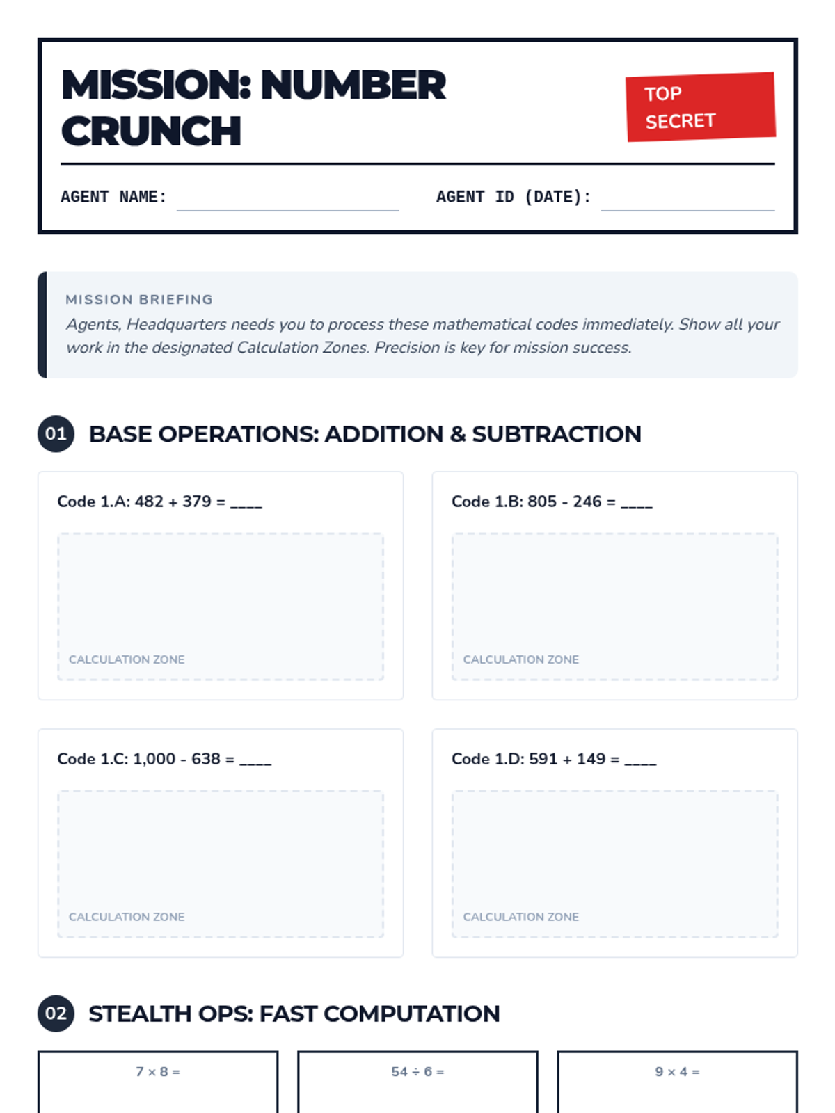 A comprehensive 3rd-grade math assessment designed as a secret agent mission, covering multi-digit addition and subtraction, multiplication, division, and complex word problems.