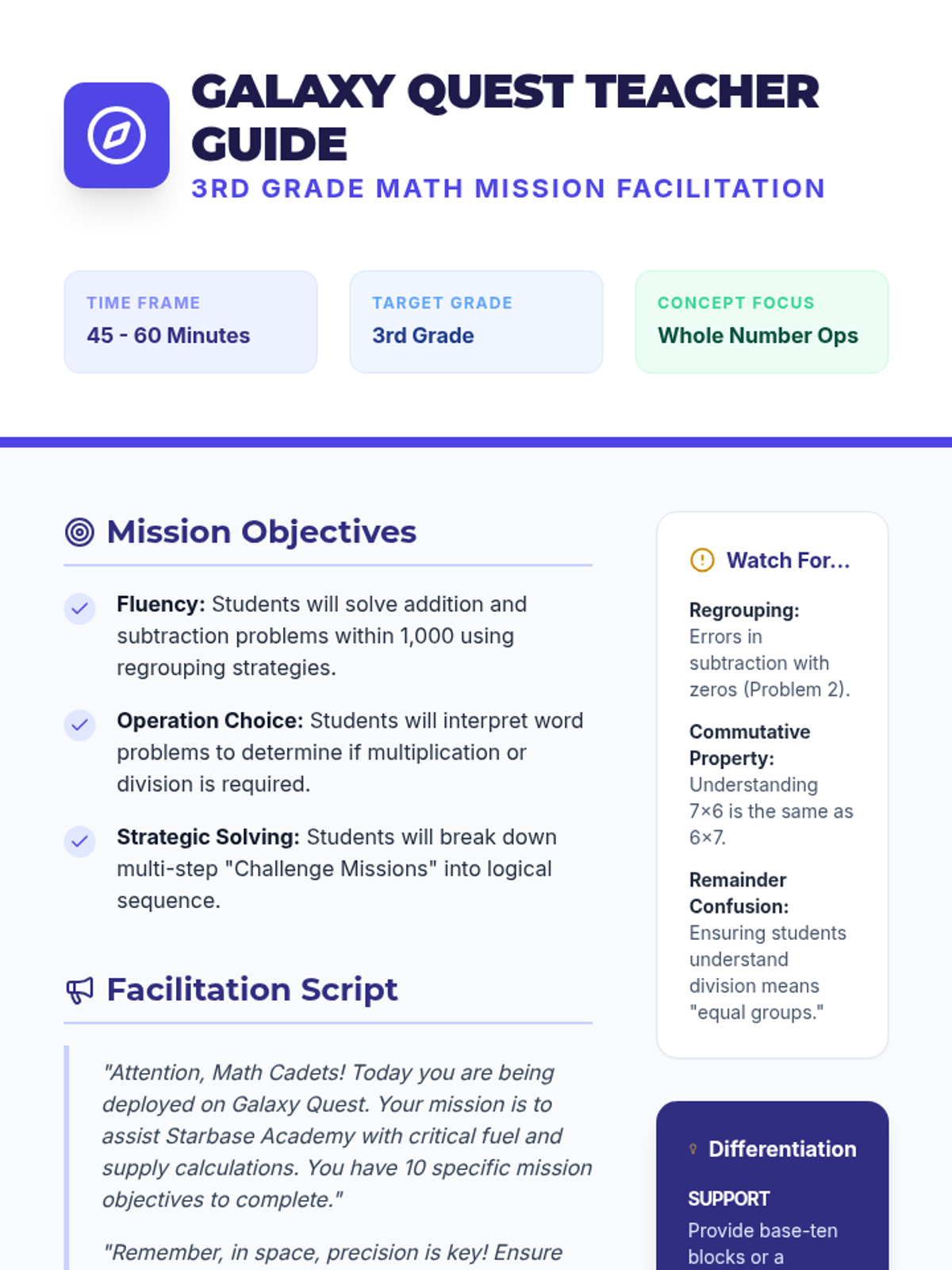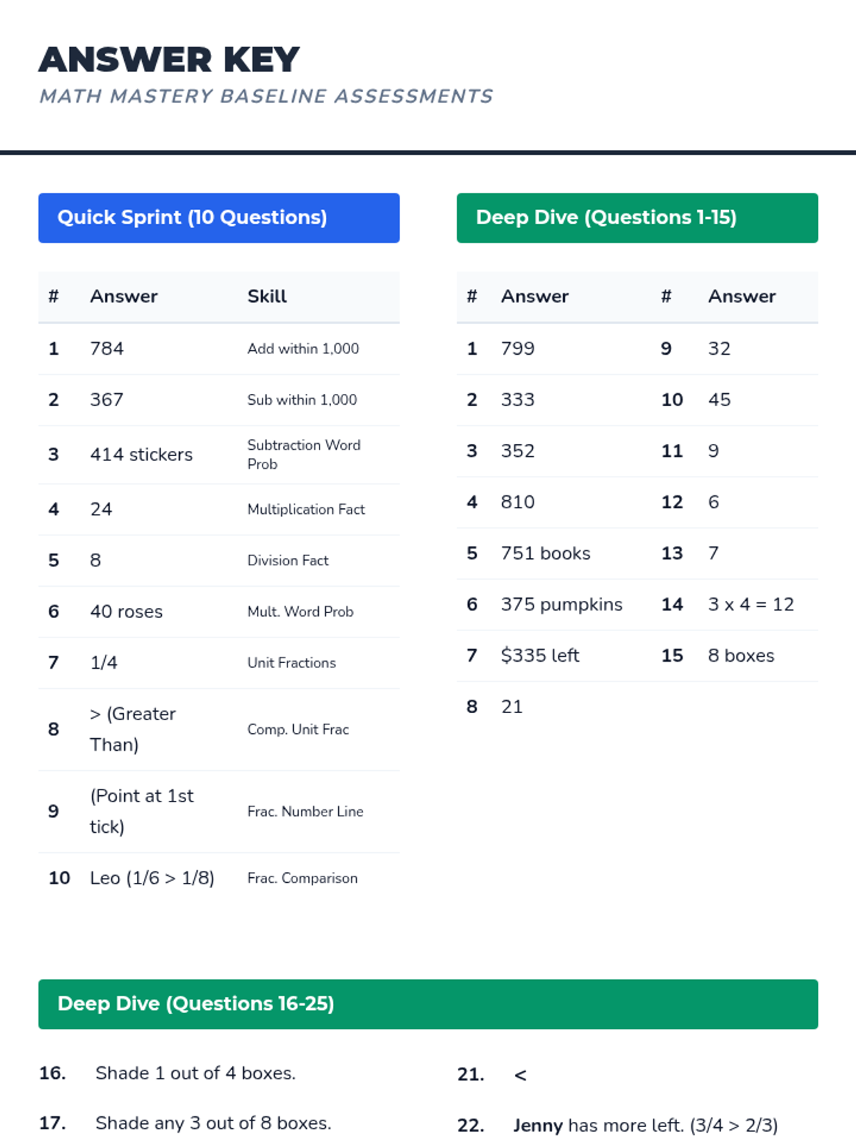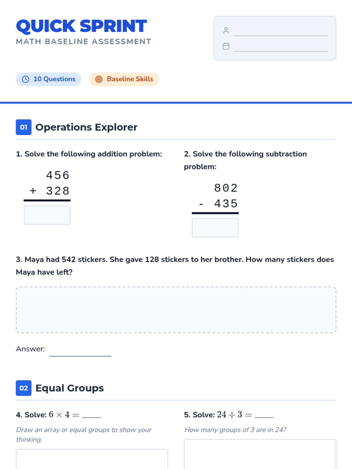 A diagnostic lesson designed to evaluate 3rd-grade mathematical proficiency through two levels of assessment: a quick 10-question sprint and a comprehensive 25-question deep dive.