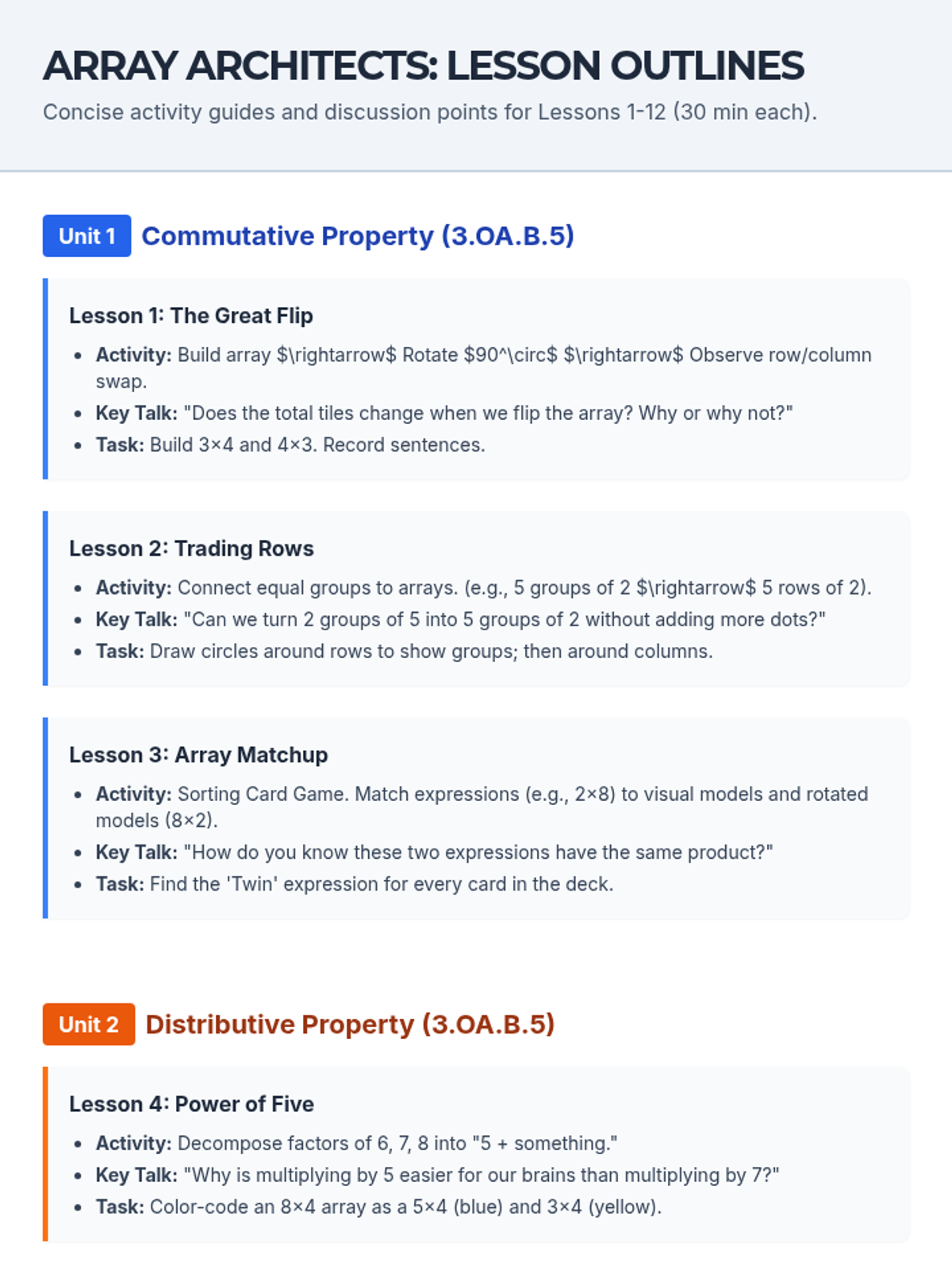 Students explore the commutative property of multiplication using arrays and physical tiles to understand that order does not change the total.
