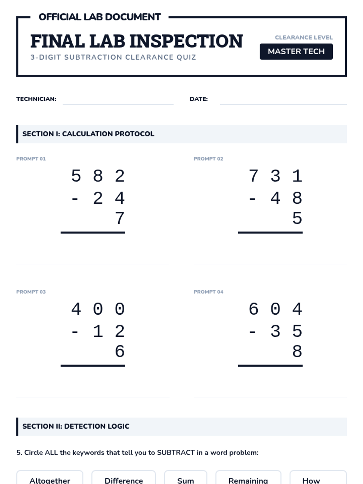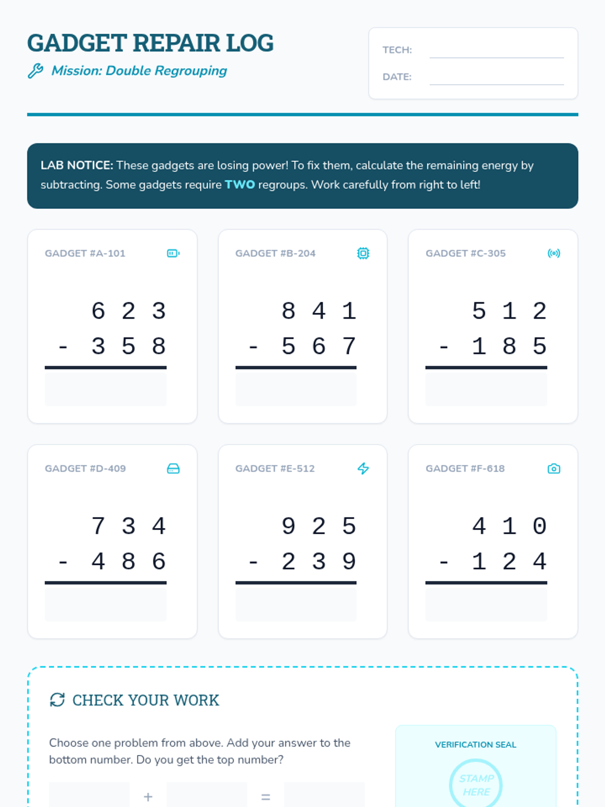 Focuses on the fundamentals of 3-digit subtraction with a single instance of regrouping (either tens or ones). Students learn the conceptual "Great Trade" strategy and apply it to basic lab blueprint problems.