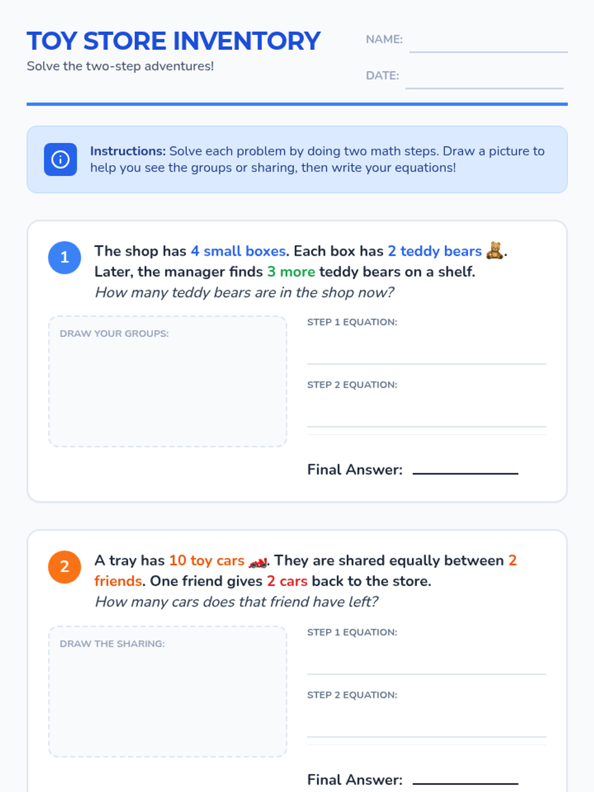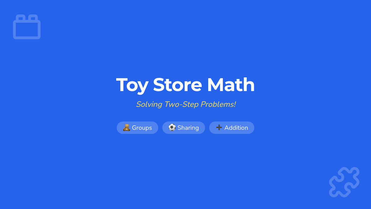 A fun, toy-themed lesson introducing second graders to two-step word problems using equal groups and sharing (foundations of multiplication and division). Students will use visual representations to solve problems involving toys in a shop inventory.