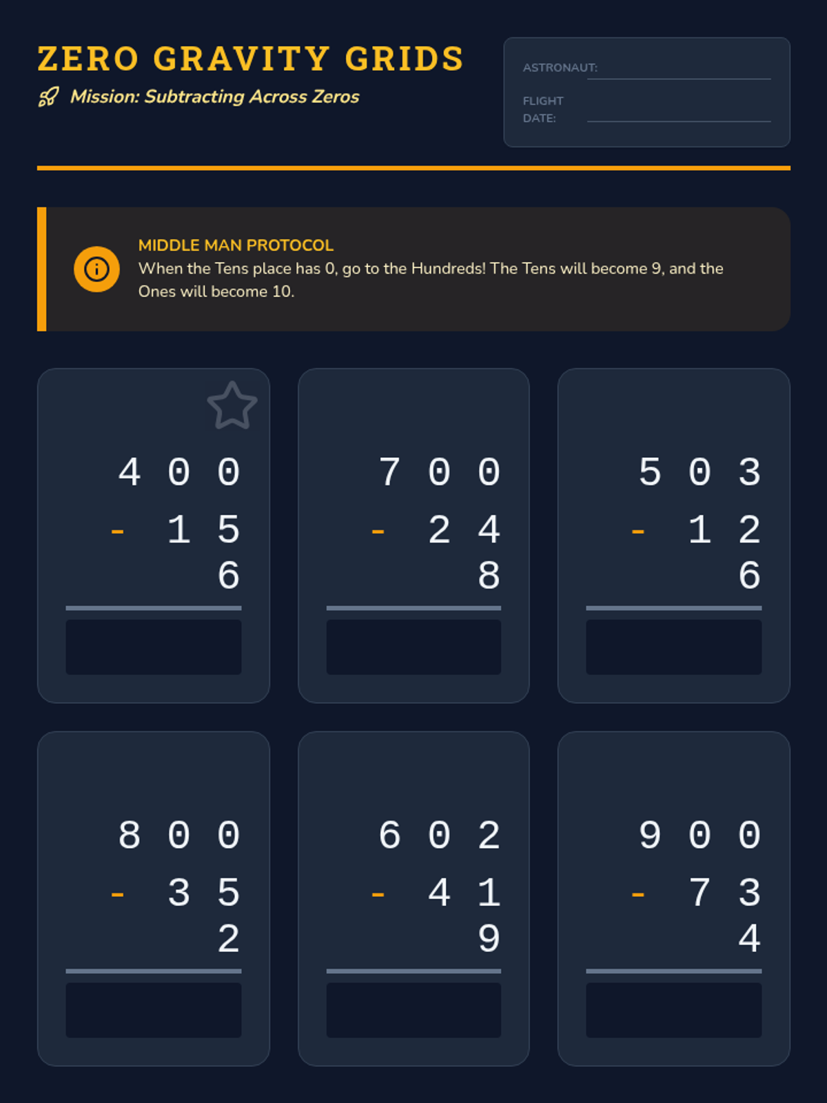 Addresses the specific challenge of regrouping when the minuend contains one or more zeros. Students learn the 'Middle Man' strategy to pass value from the hundreds place through the tens to the ones.