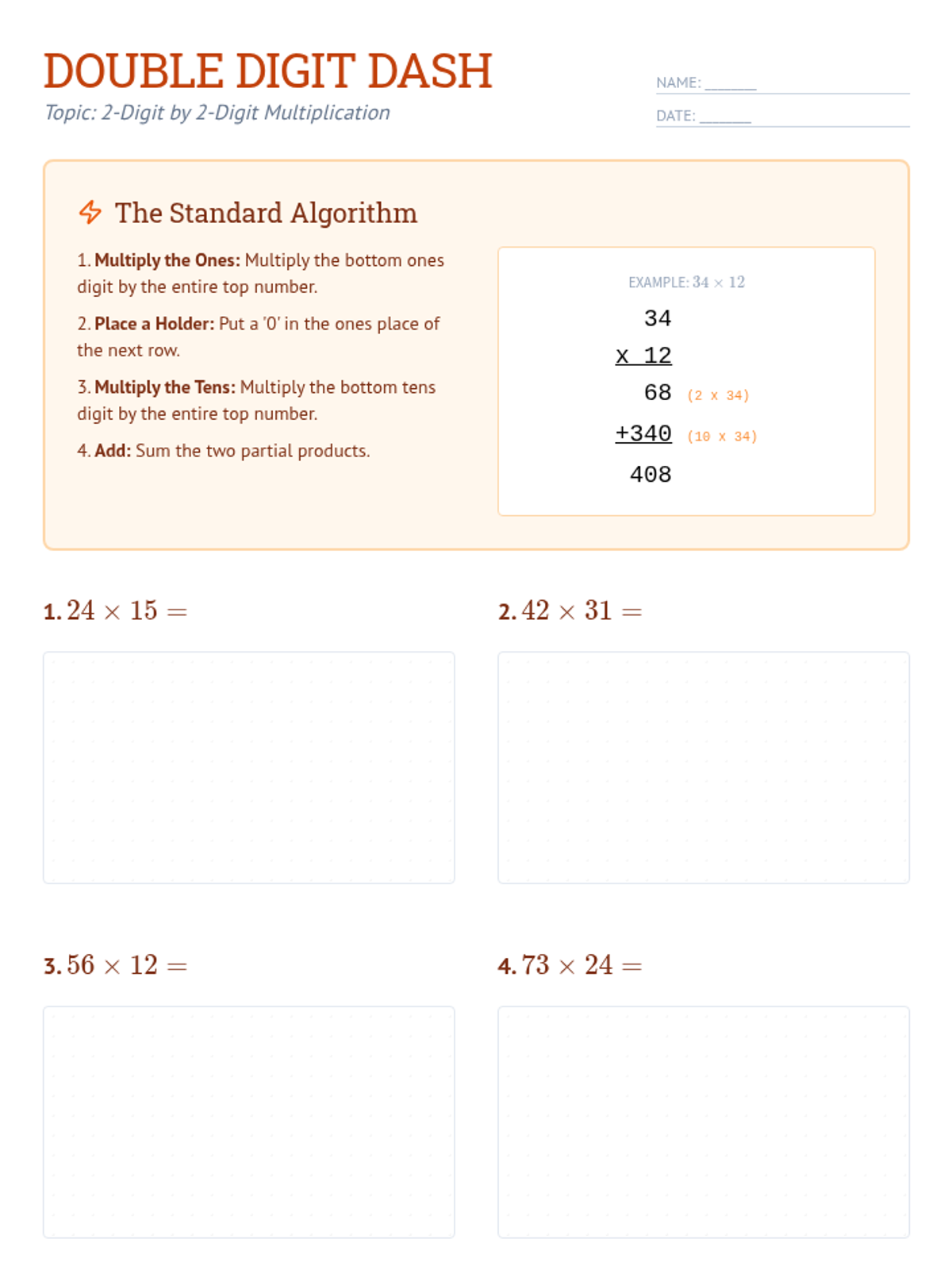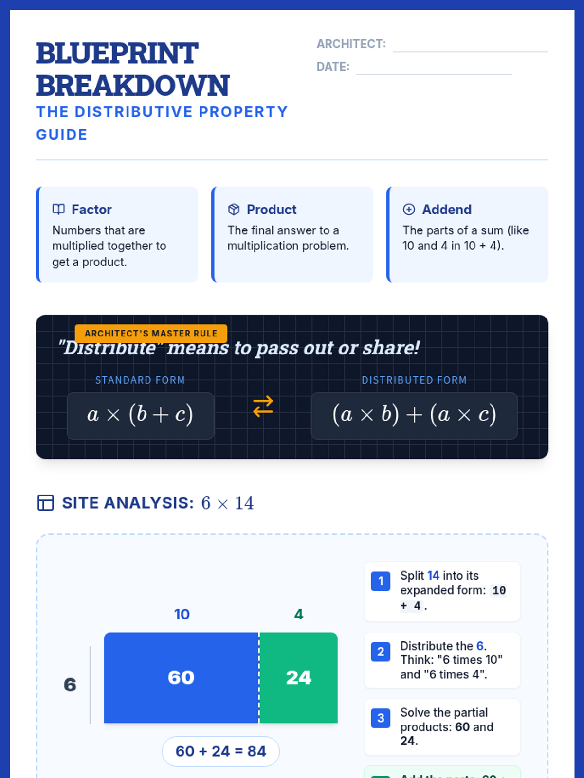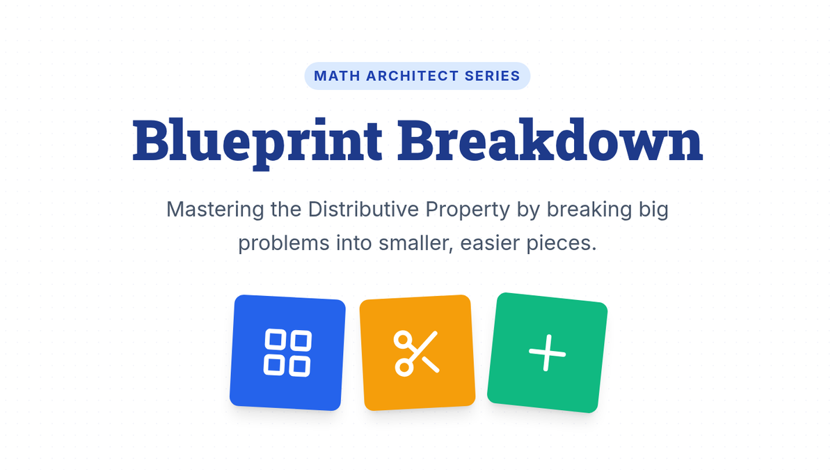 A foundational lesson on the distributive property for 3rd-5th graders, using area models and the 'breaking apart' strategy to simplify complex multiplication.