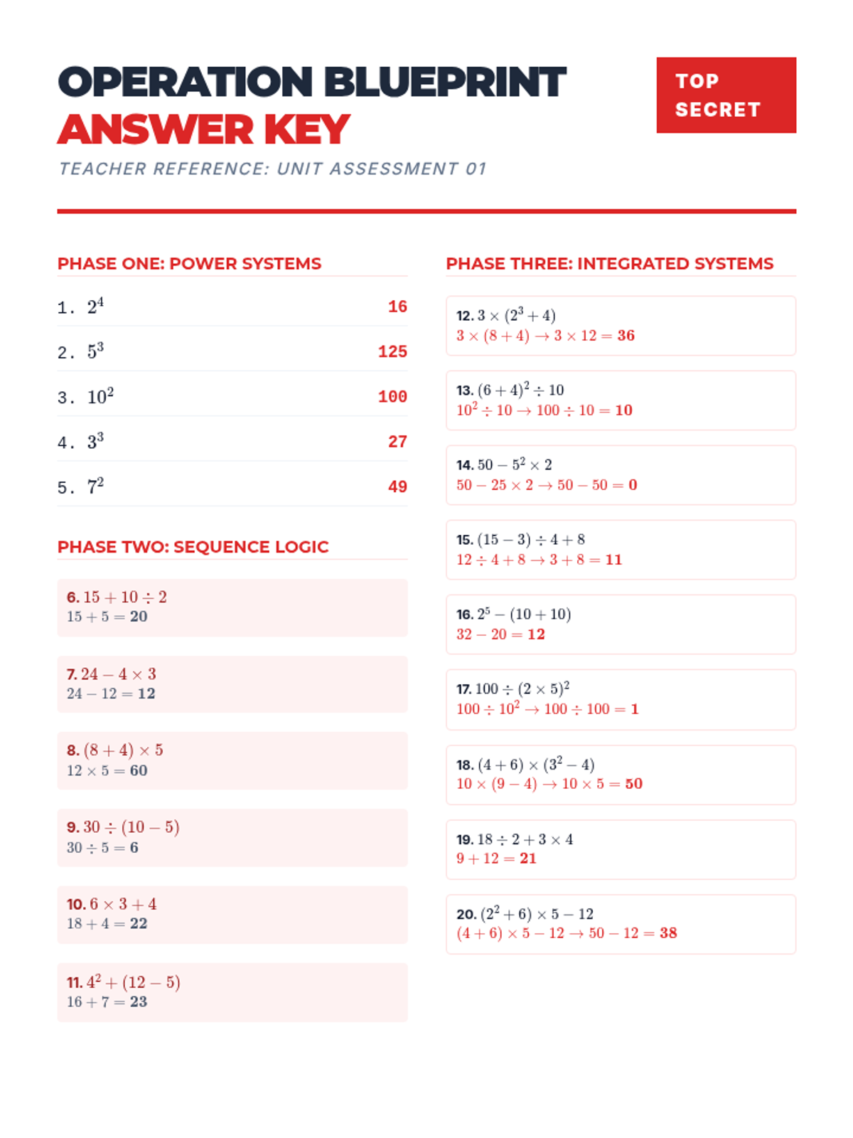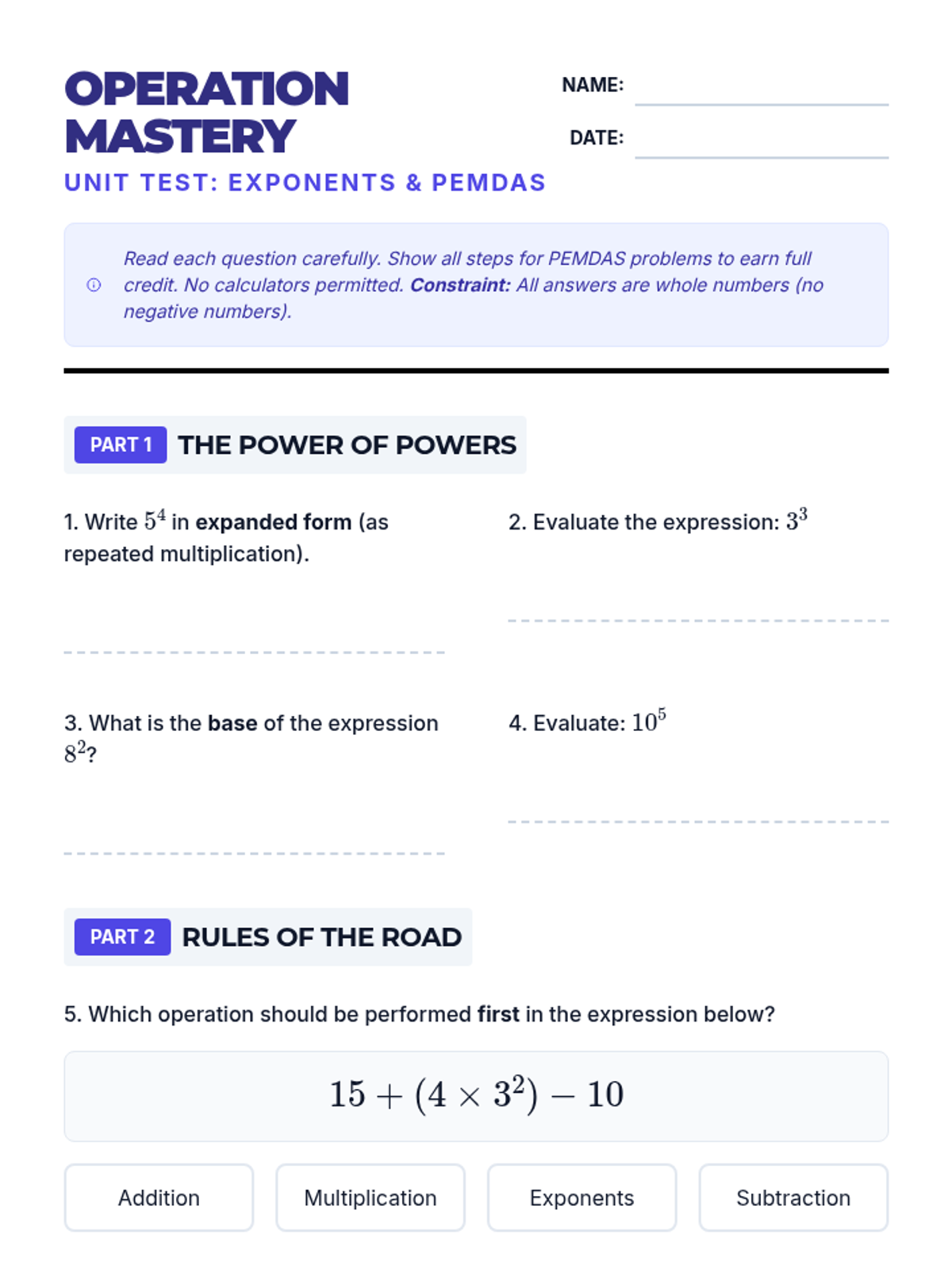A comprehensive unit assessment on exponents and the order of operations, designed for a 60-minute testing block with no negative numbers. Includes practice on identifying steps and evaluating complex expressions.