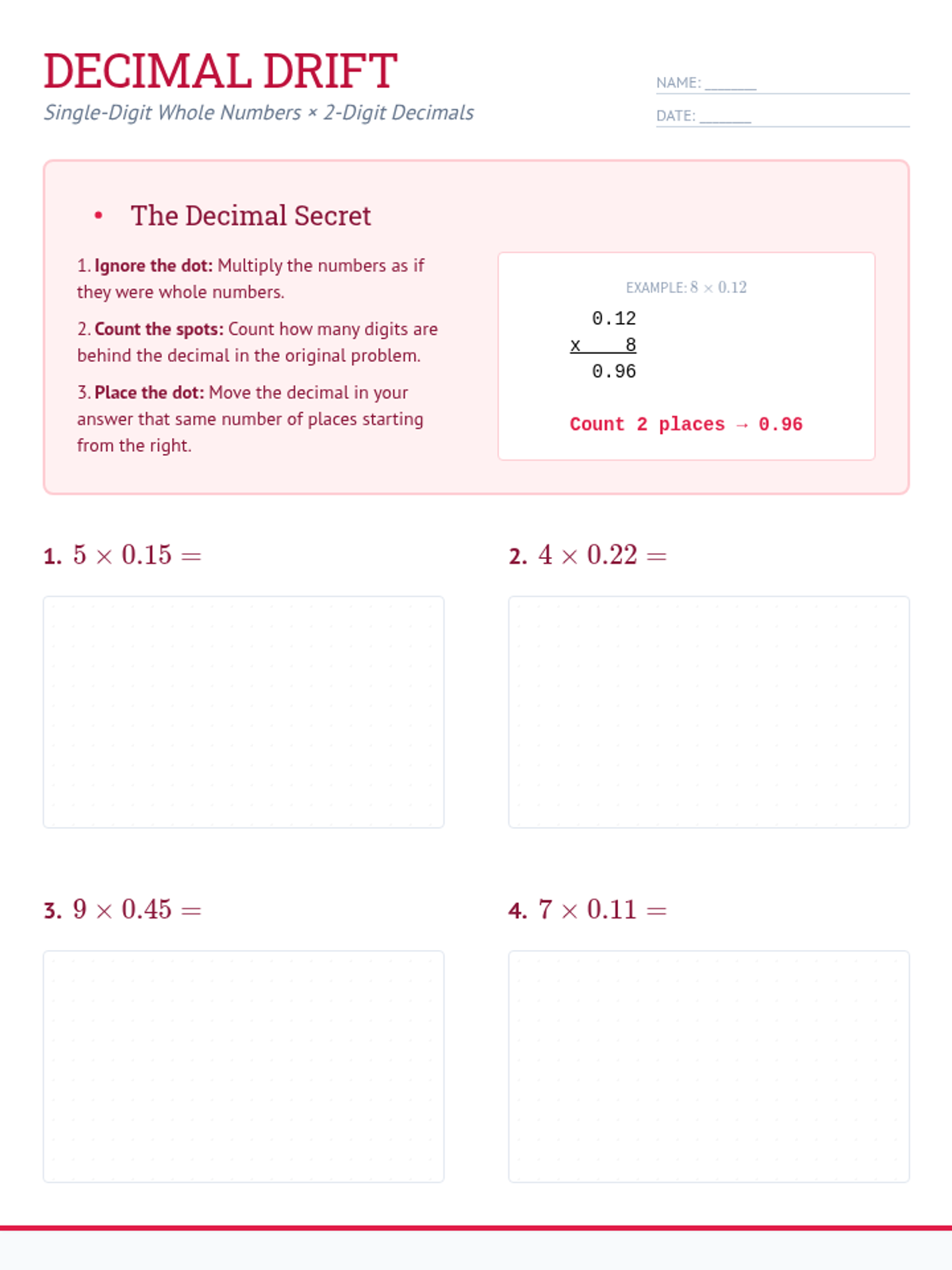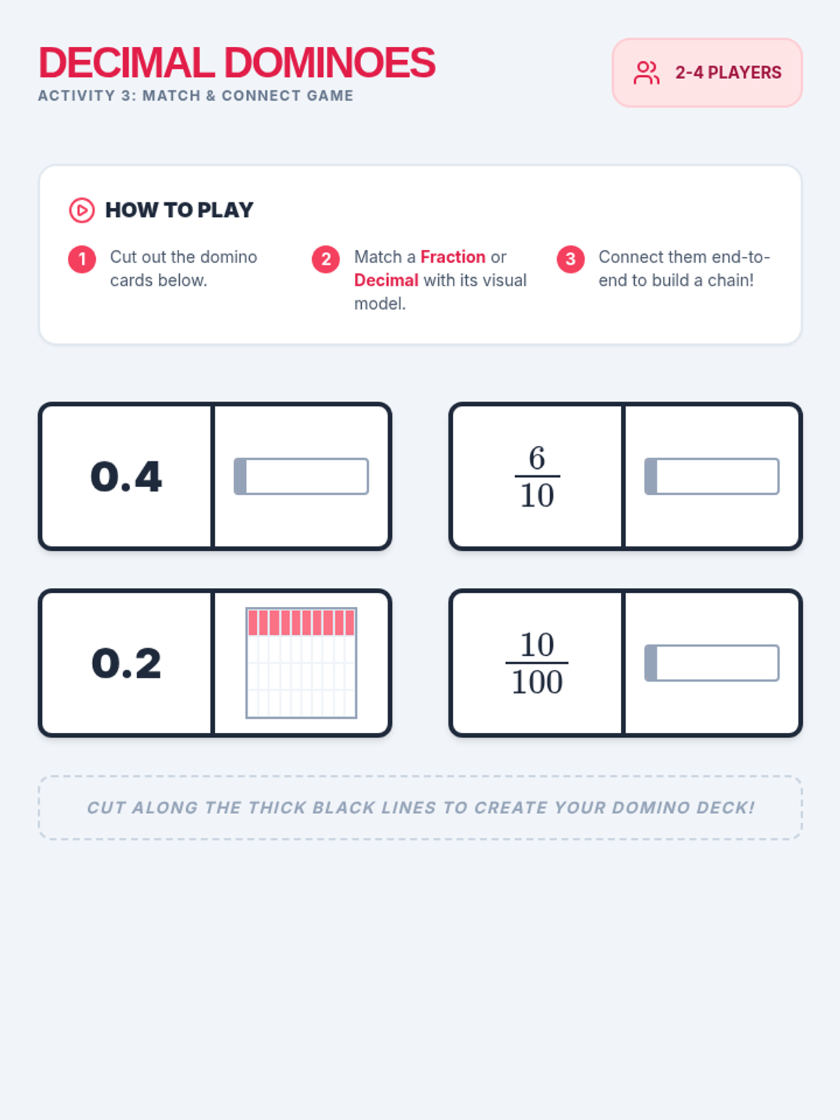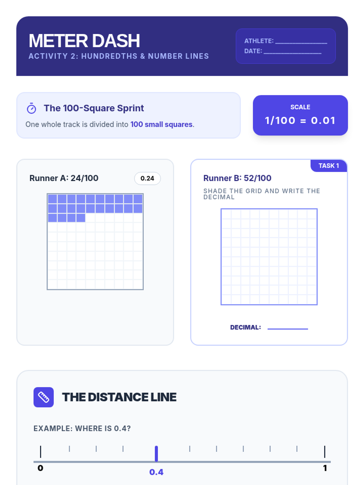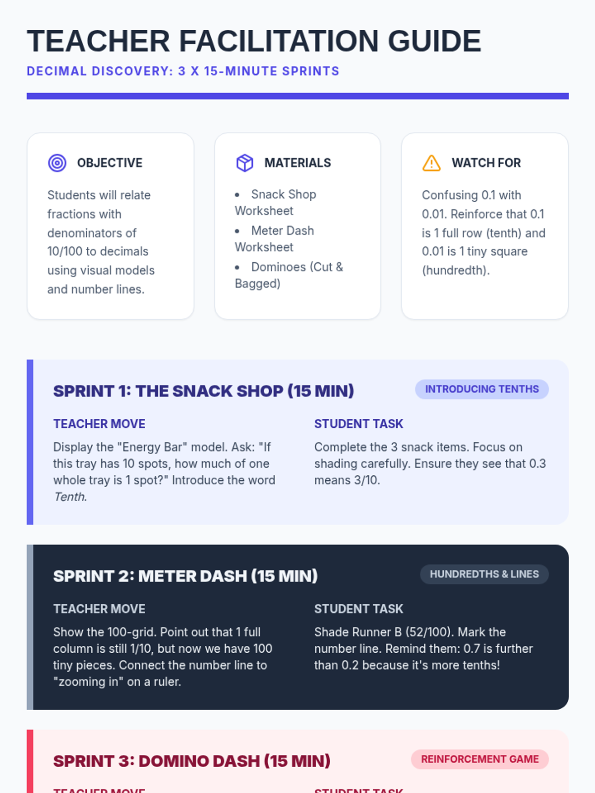 A three-part introductory lesson on decimals that uses visual models and real-world scenarios to connect fractions with denominators of 10 and 100 to their decimal forms.