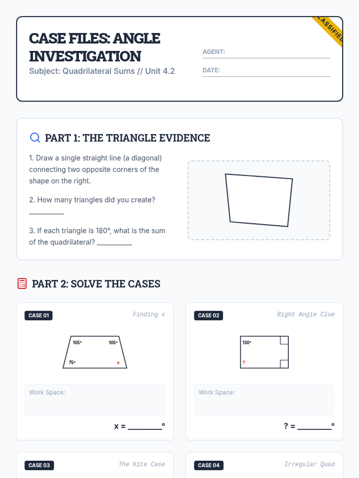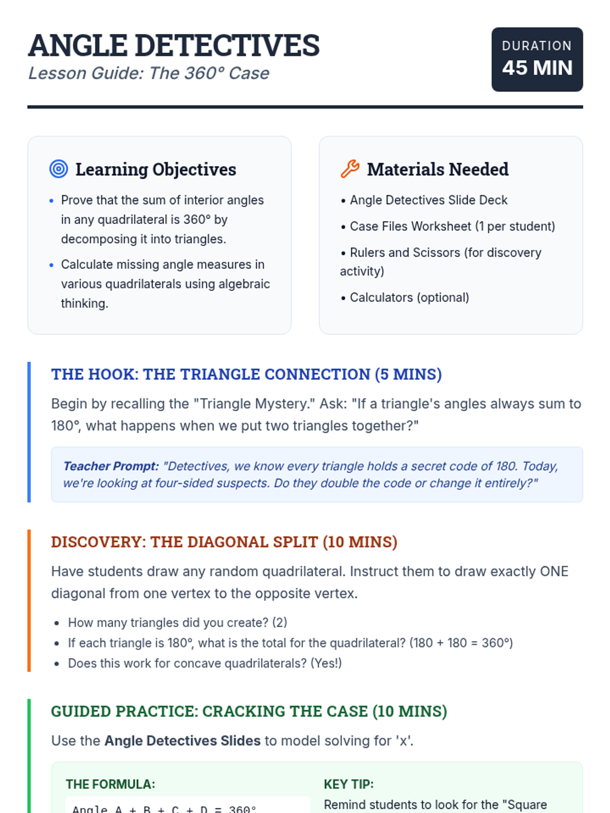 A 45-minute investigation into the interior angles of quadrilaterals, where students discover the 360-degree rule by dividing shapes into triangles and solve for missing 'clue' angles.