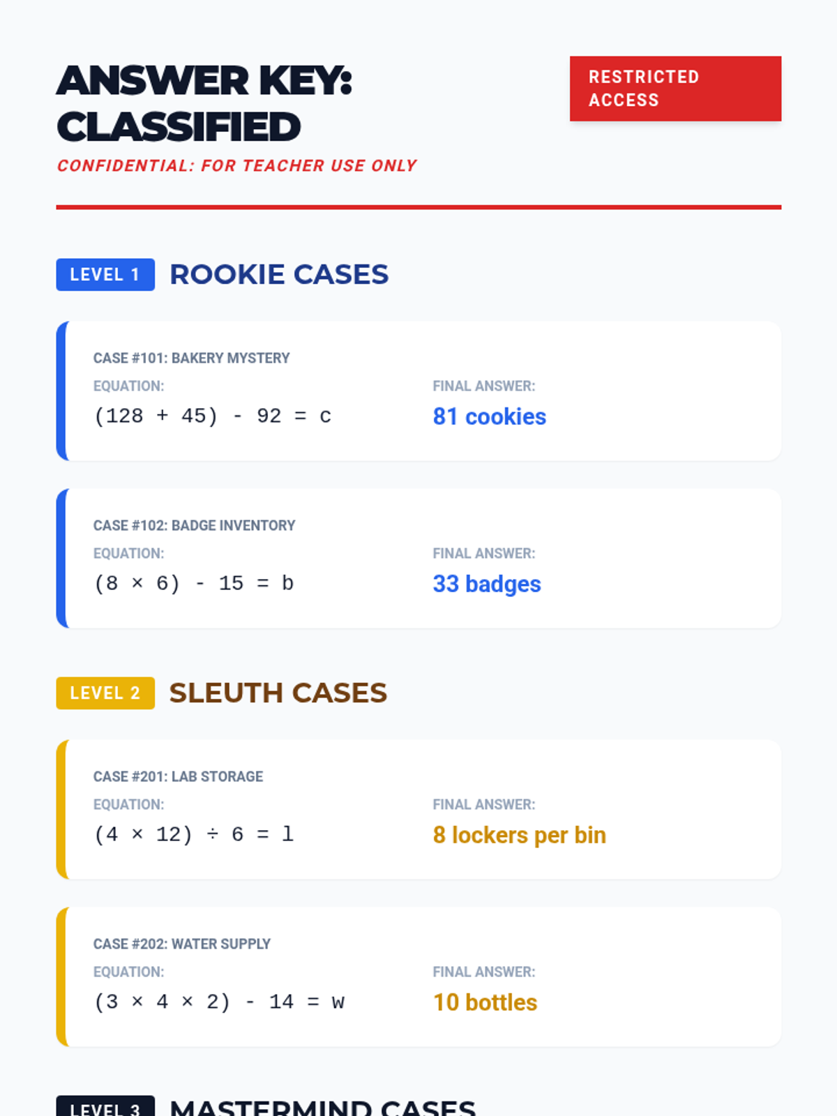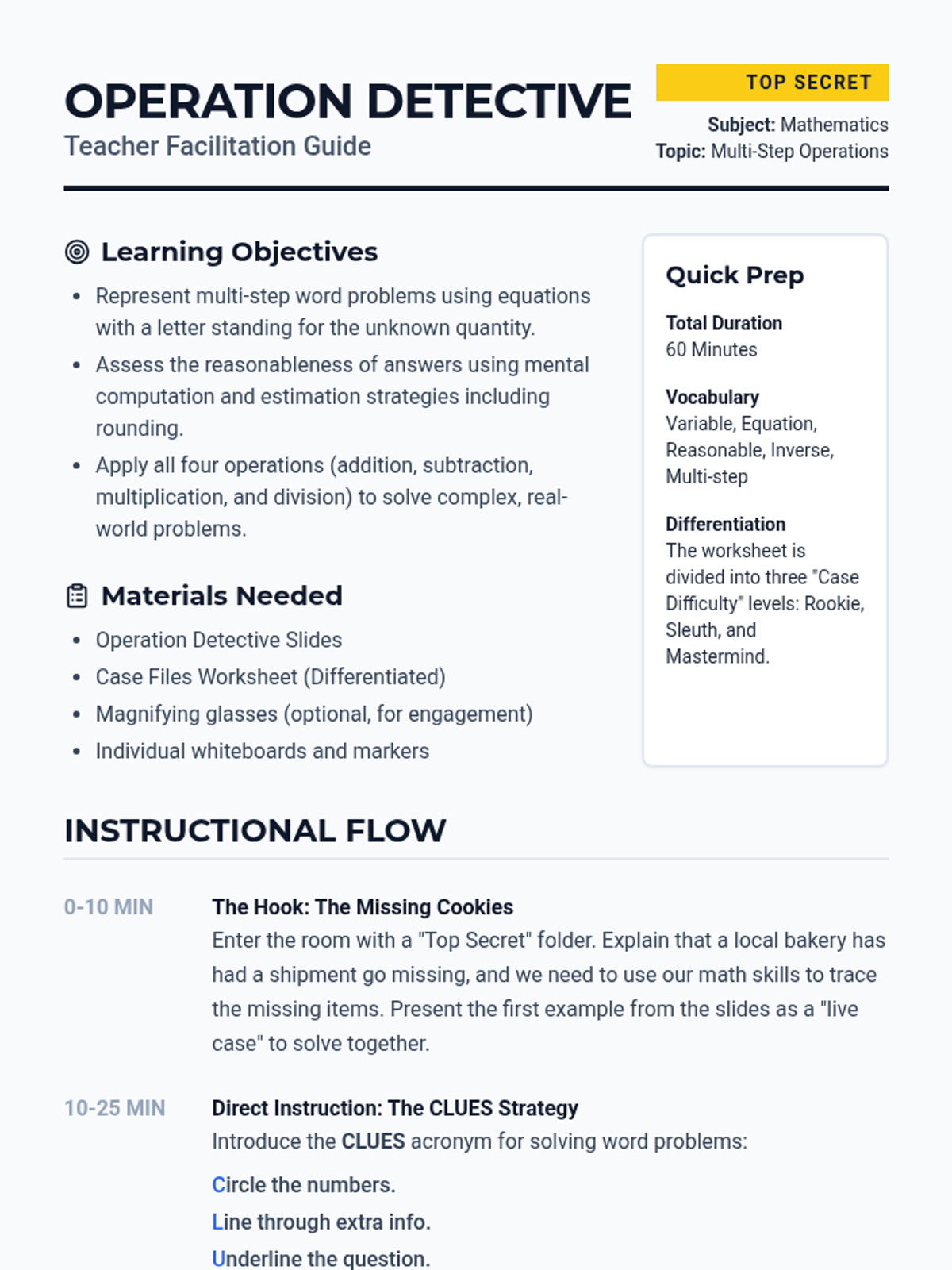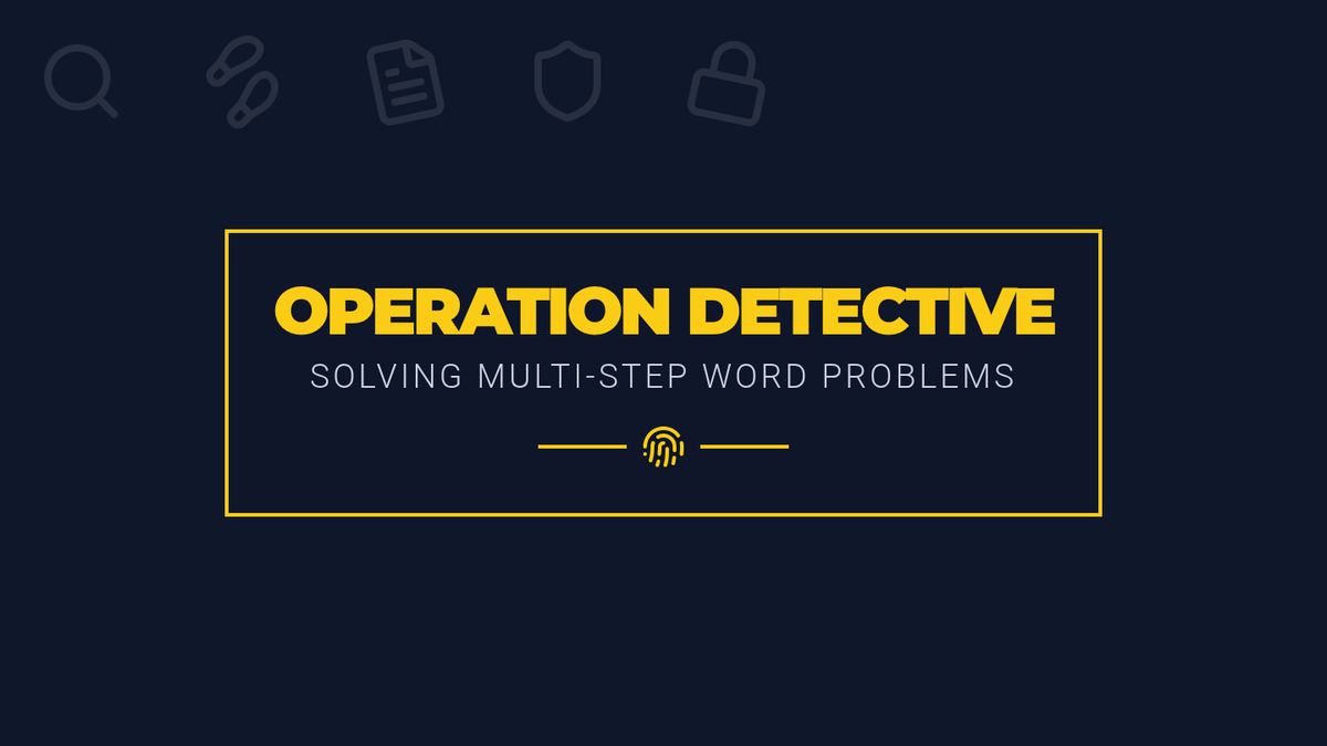 A lesson focused on decoding word problems using addition, subtraction, multiplication, and division facts through a detective-themed investigation. Students learn to identify key operations and solve tiered challenges of increasing complexity.