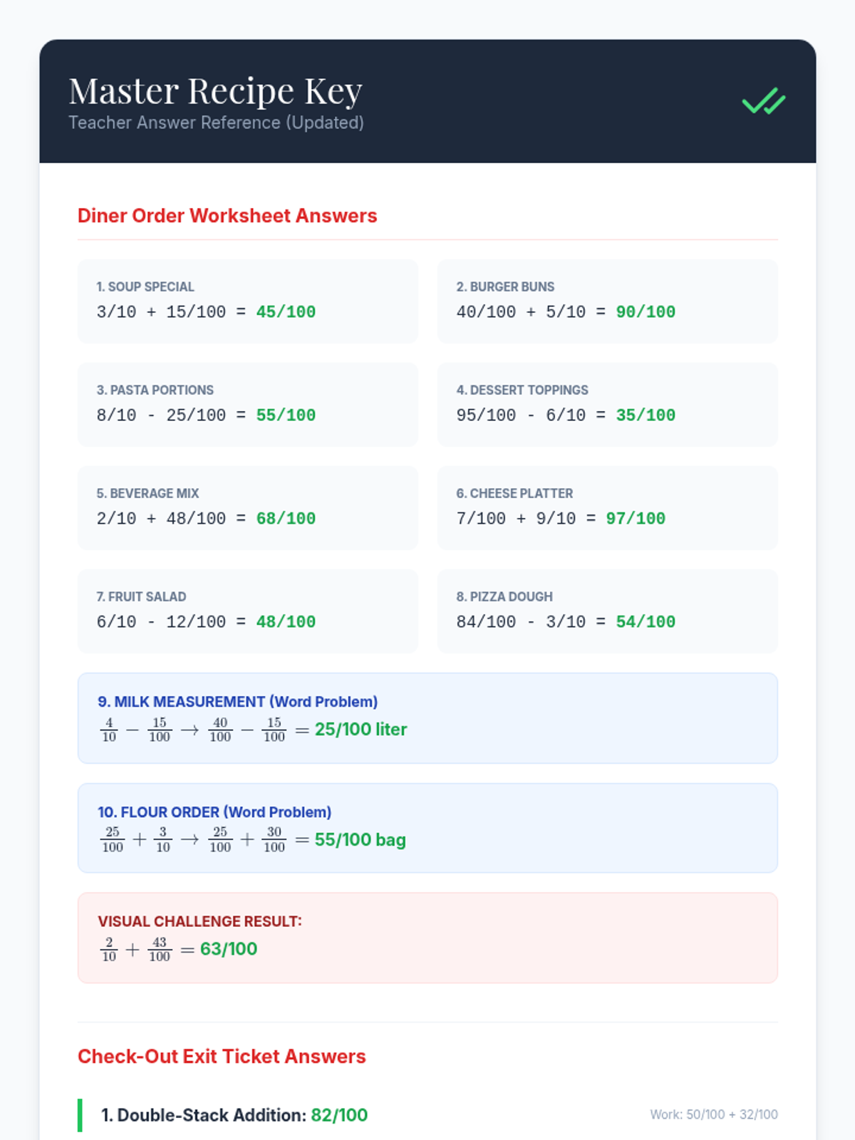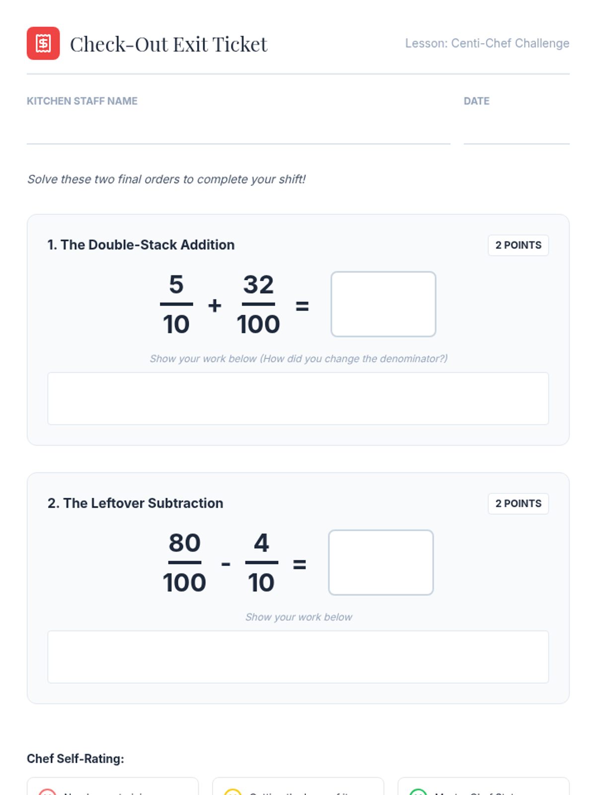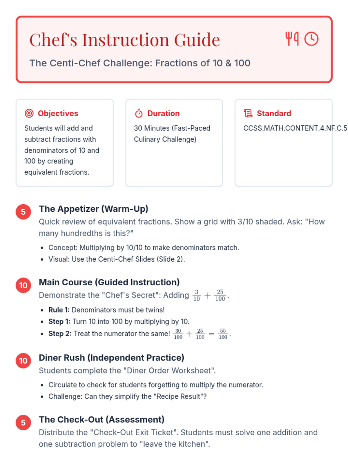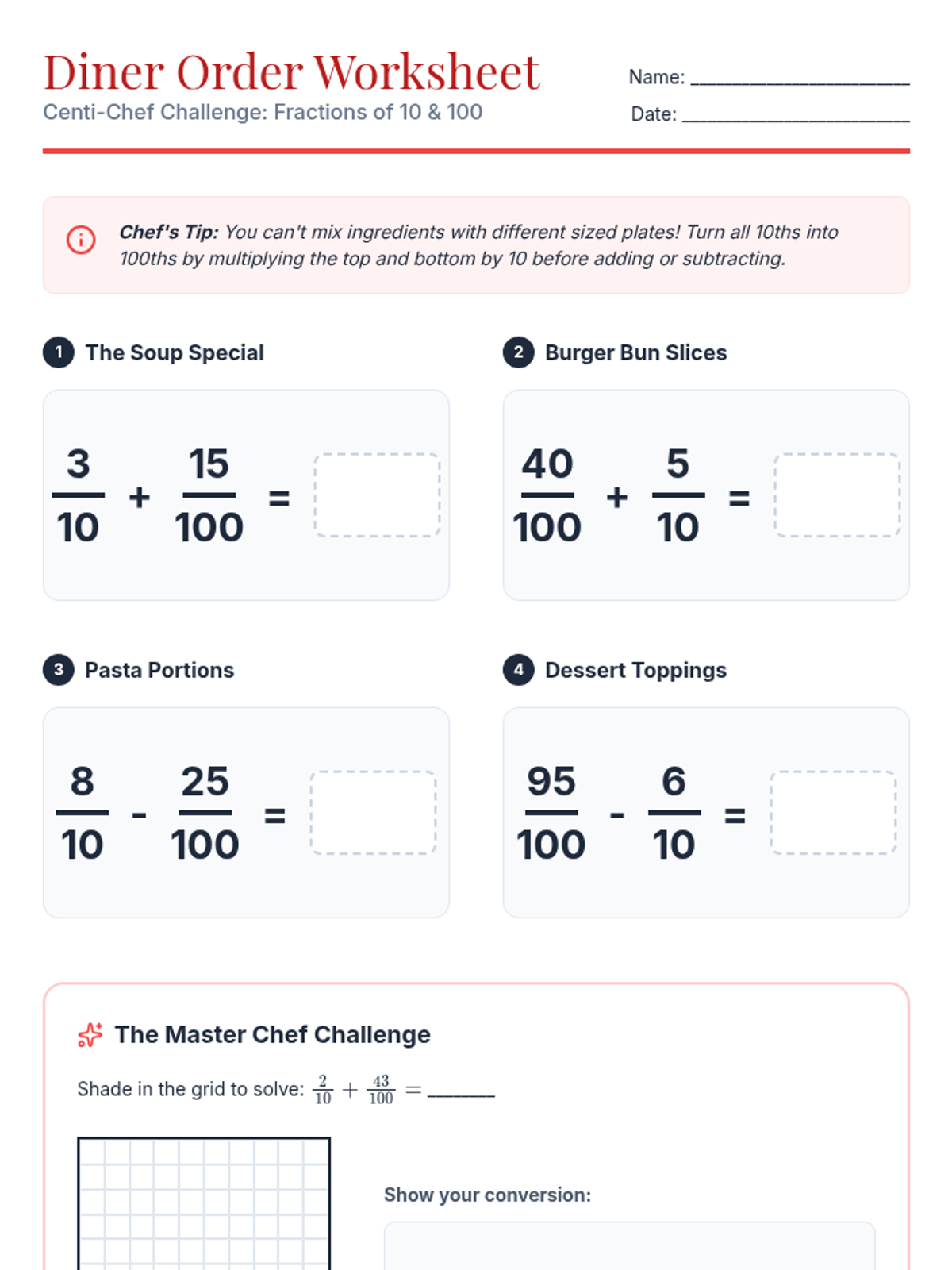 A fast-paced, culinary-themed lesson focusing on adding and subtracting fractions with denominators of 10 and 100 by converting tenths to hundredths.