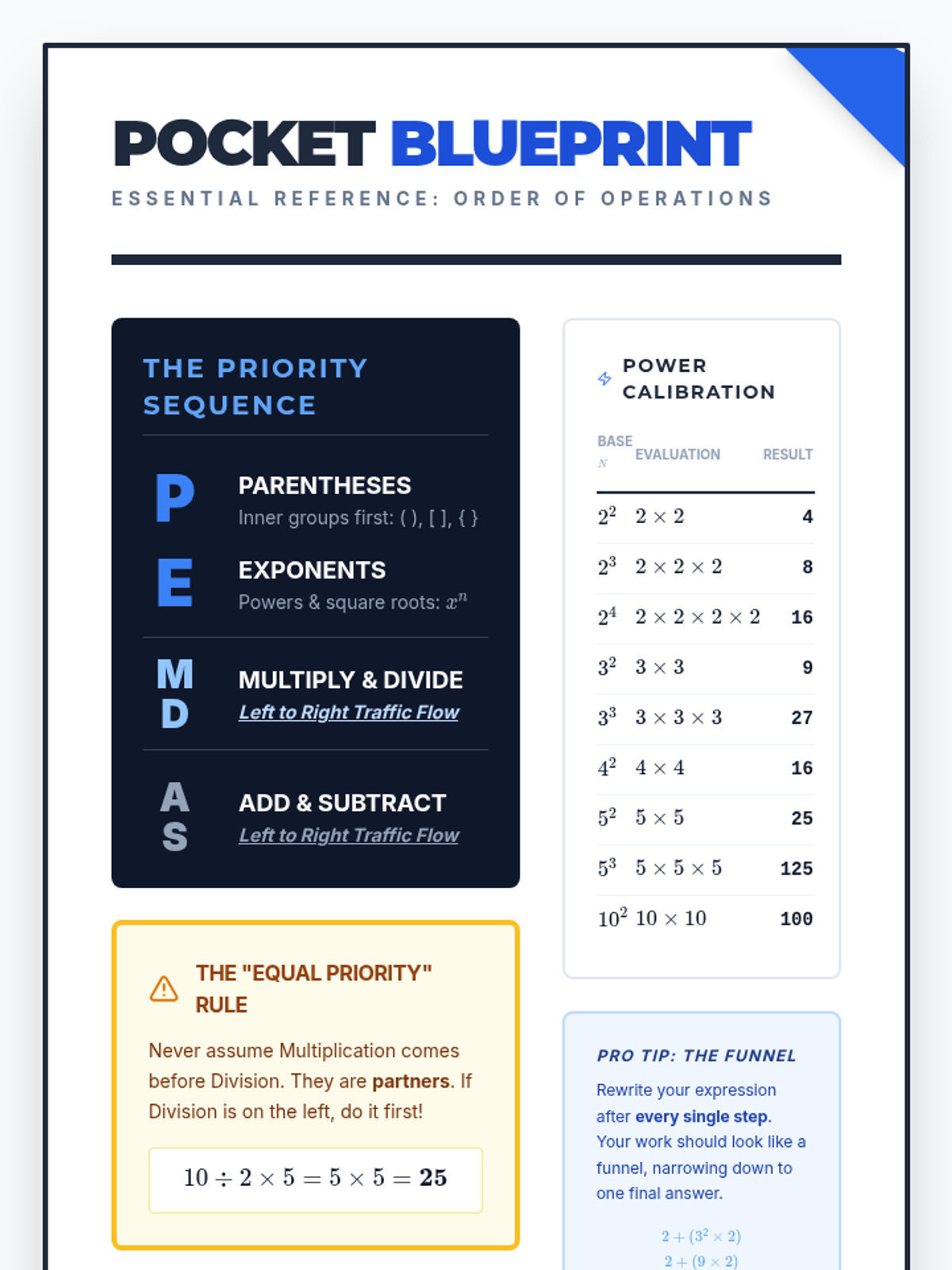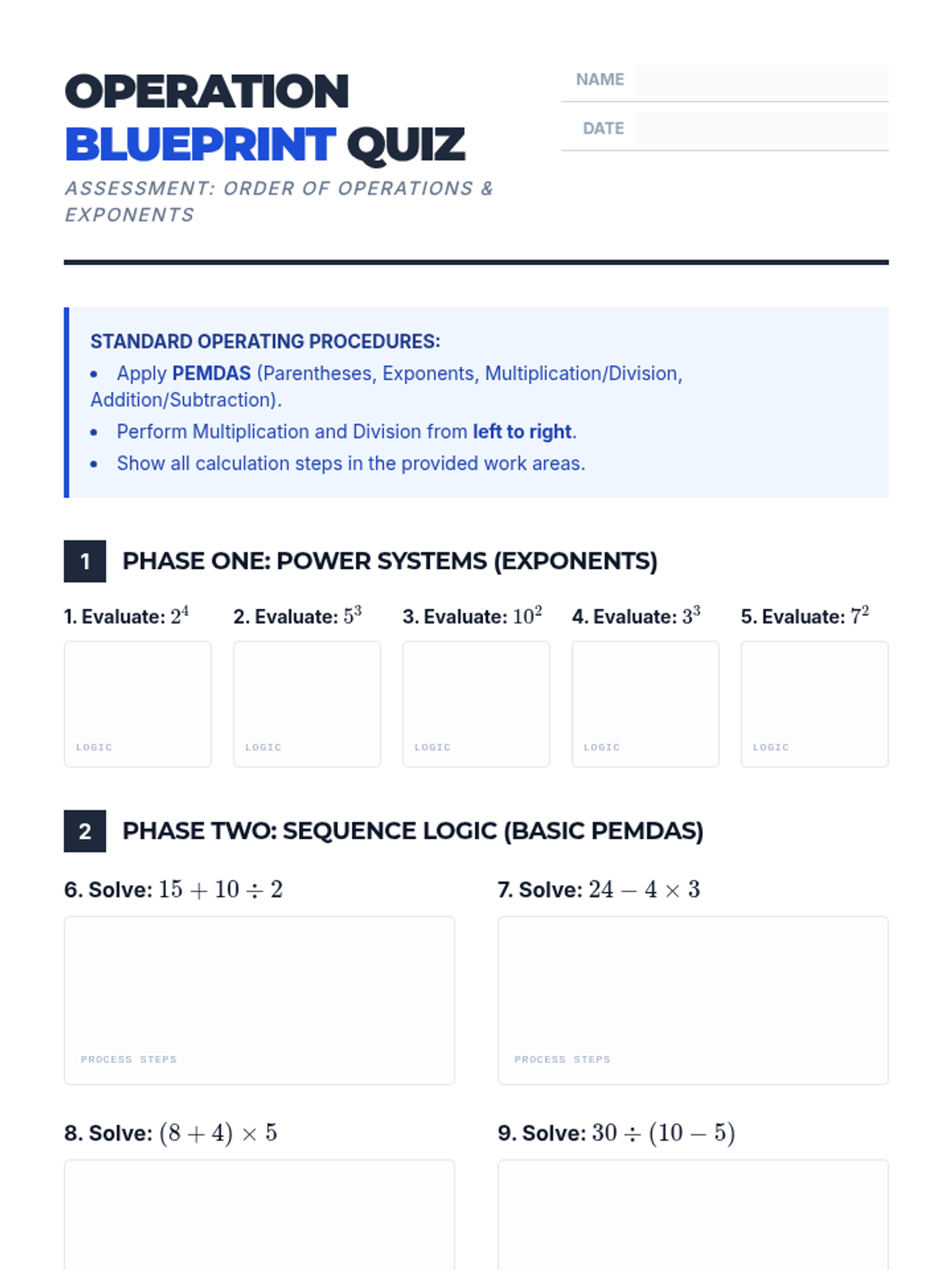 This lesson focuses on mastering the order of operations (PEMDAS) and evaluating numerical expressions with exponents. Students will practice applying rules systematically to solve multi-step problems without negative numbers.