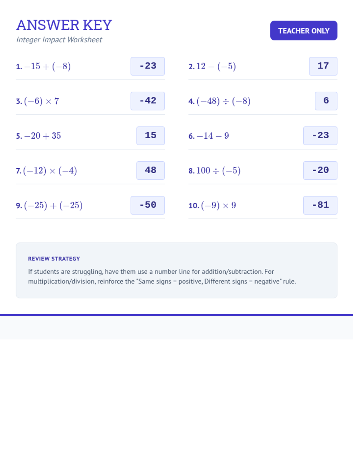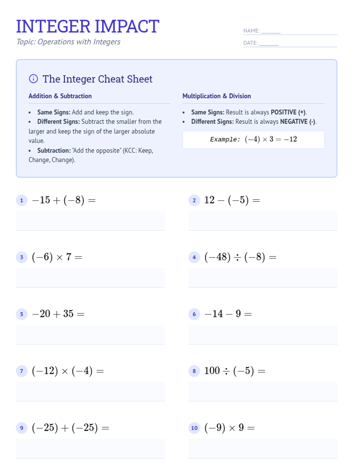 A foundational lesson on performing operations with positive and negative integers, featuring clear rules and visual aids for addition, subtraction, multiplication, and division.