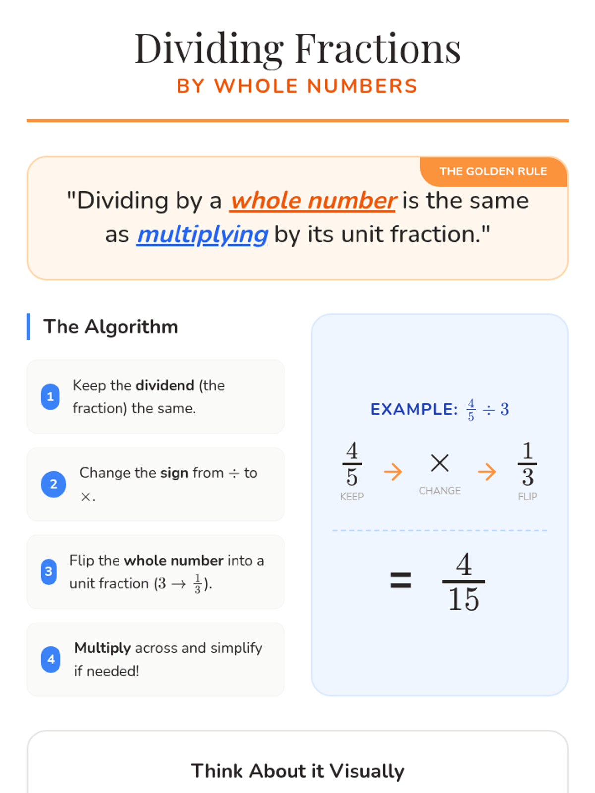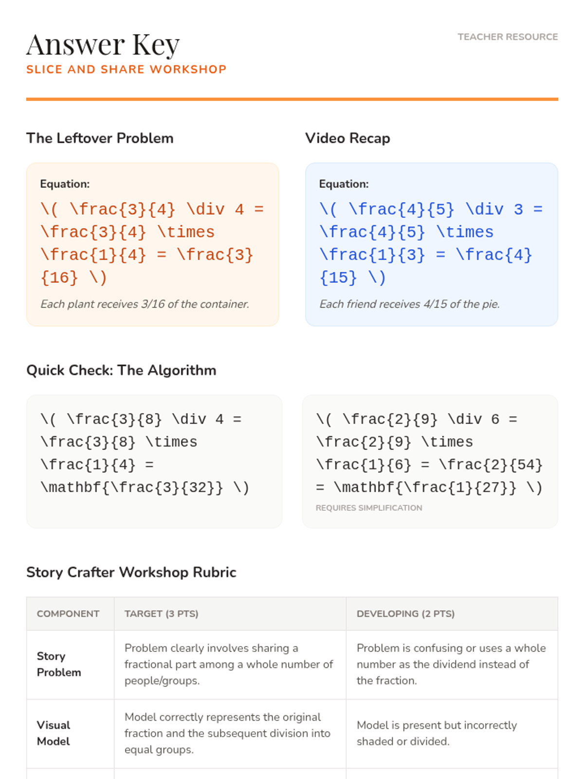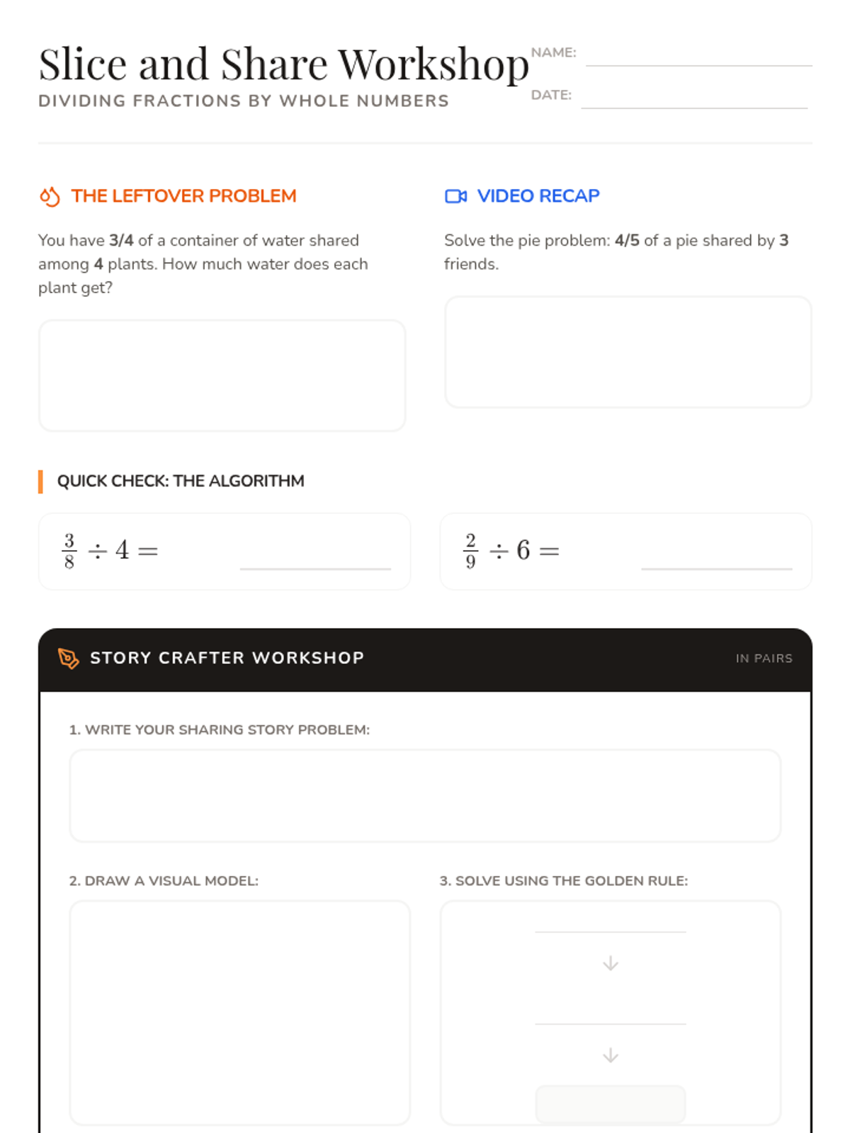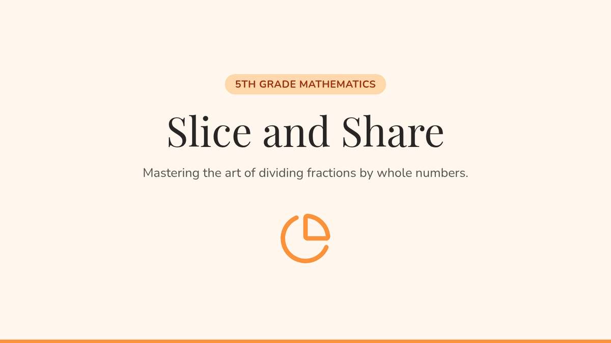 A 5th-grade math lesson focused on dividing fractions by whole numbers through real-world 'sharing' scenarios, using a concrete-pictorial-abstract approach.