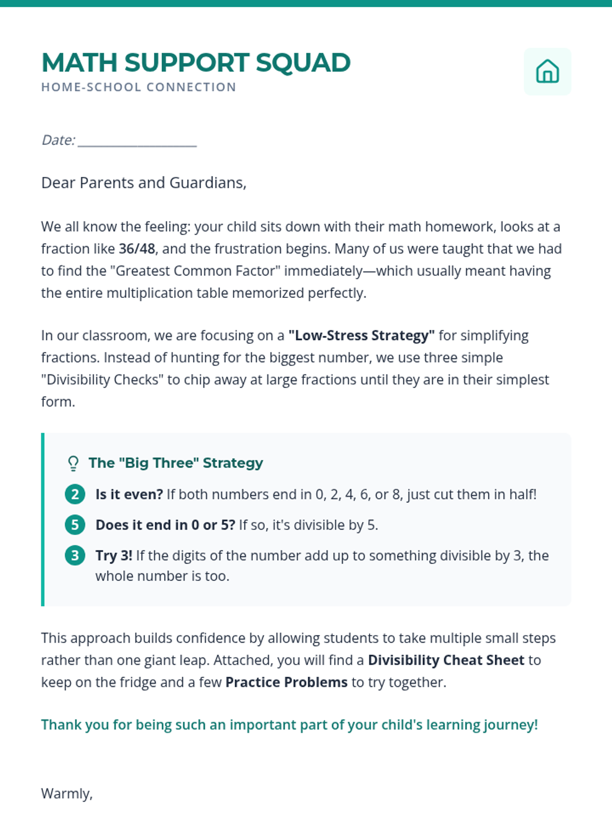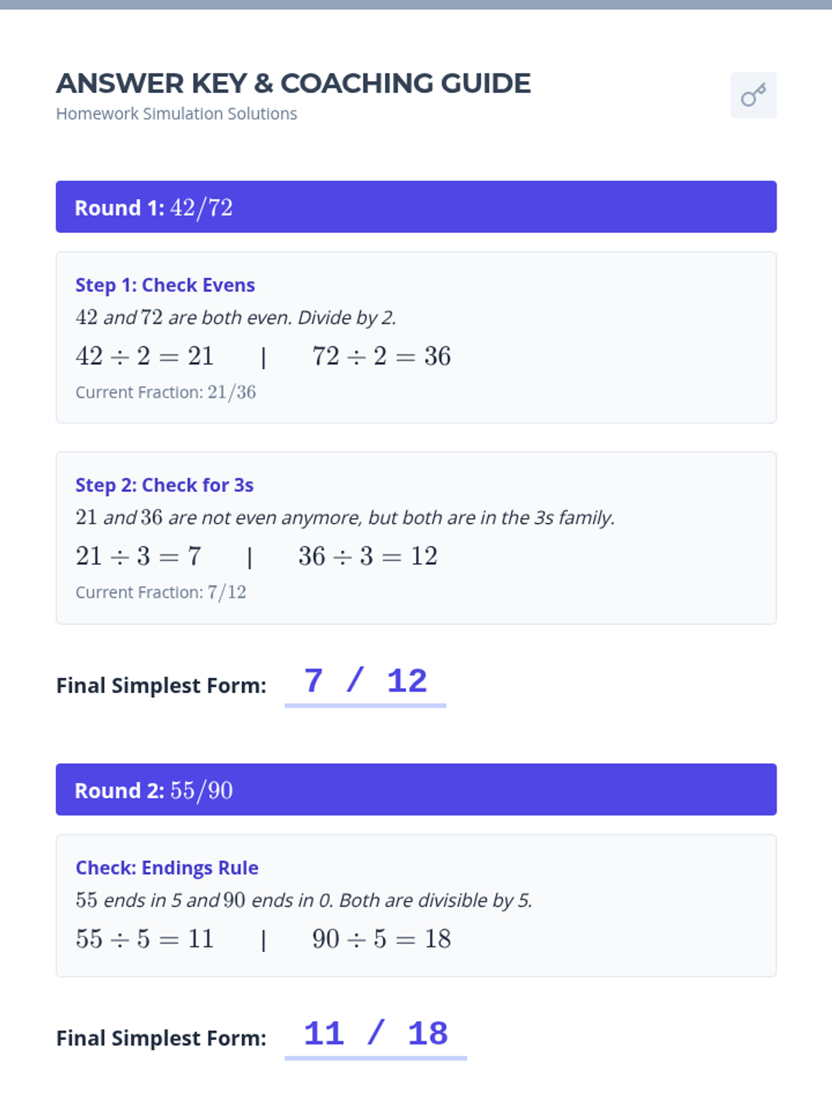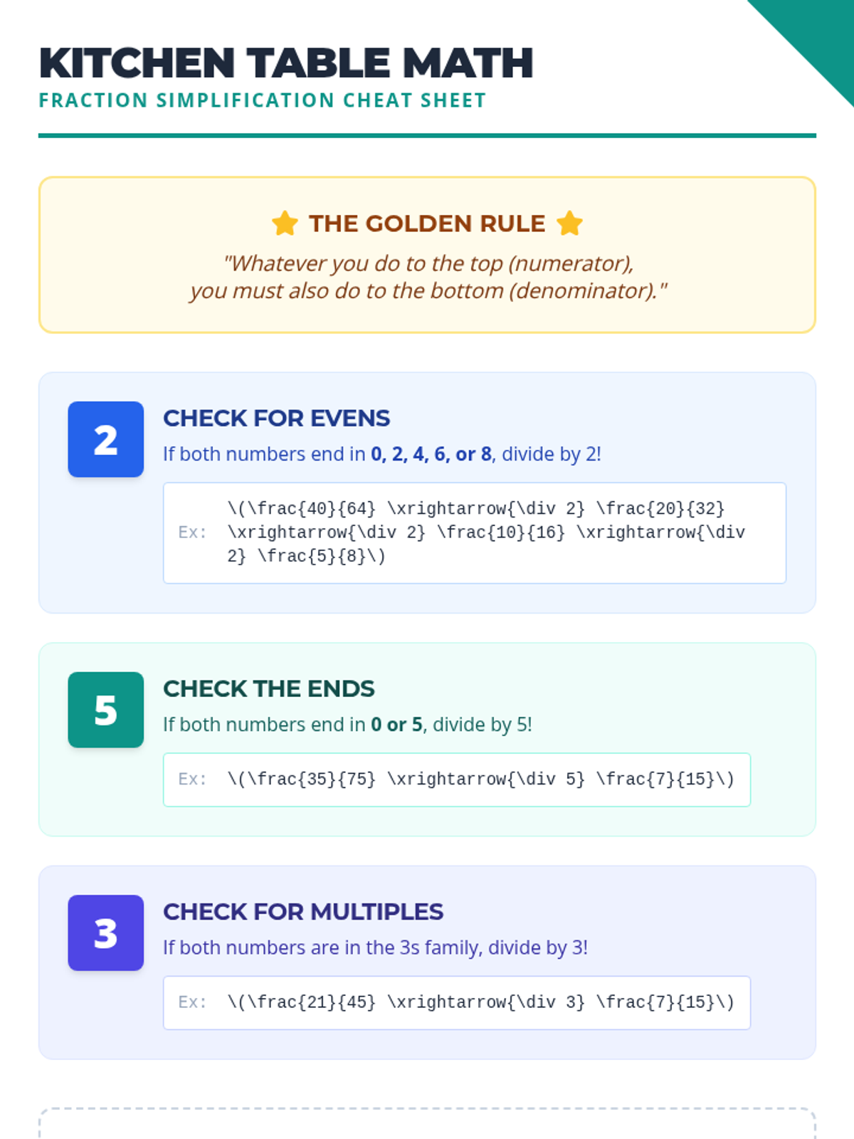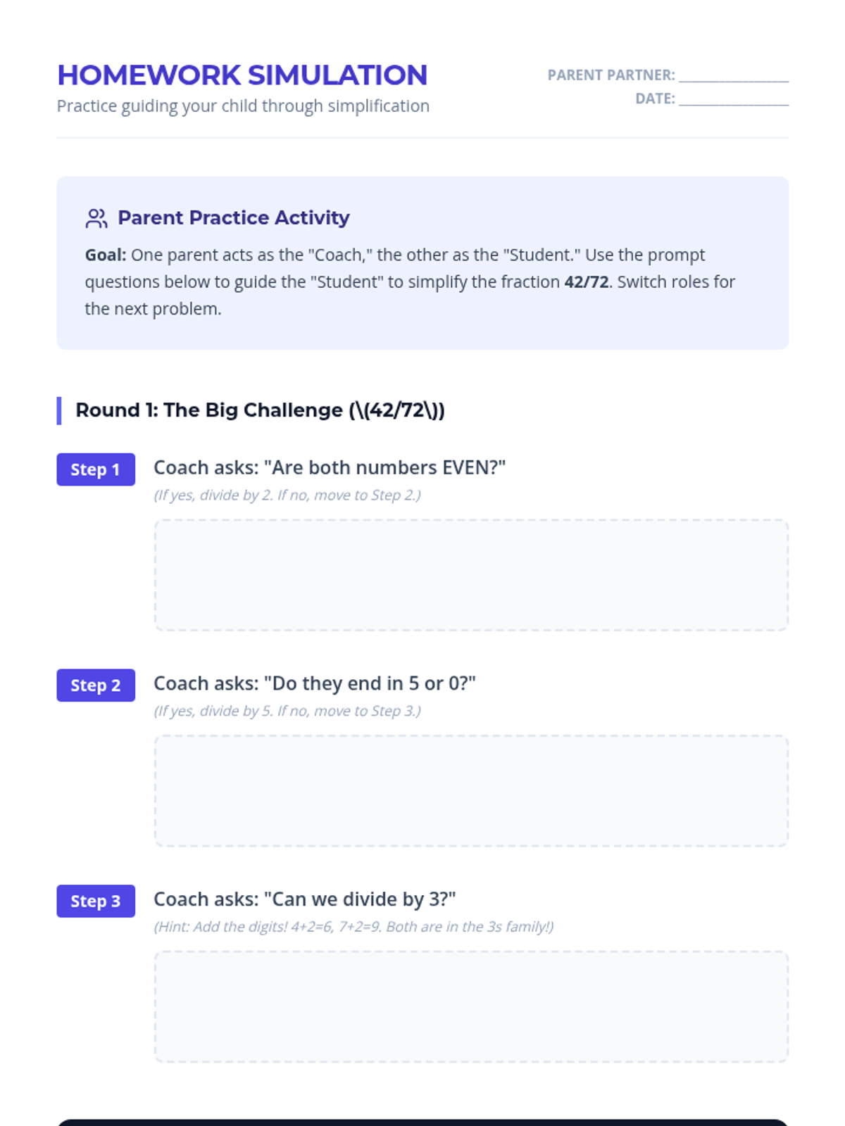 A guide for parents to help their children simplify fractions using simple divisibility rules (2, 3, and 5) rather than complex multiplication tables. The lesson focuses on reducing "math anxiety" and providing practical coaching strategies for the kitchen table.