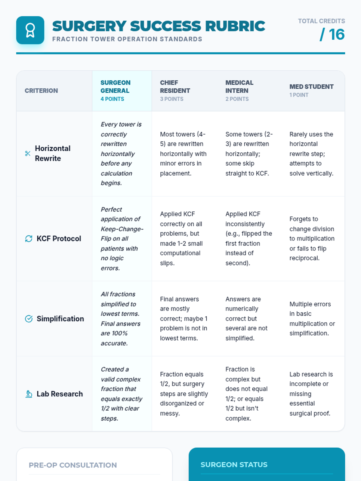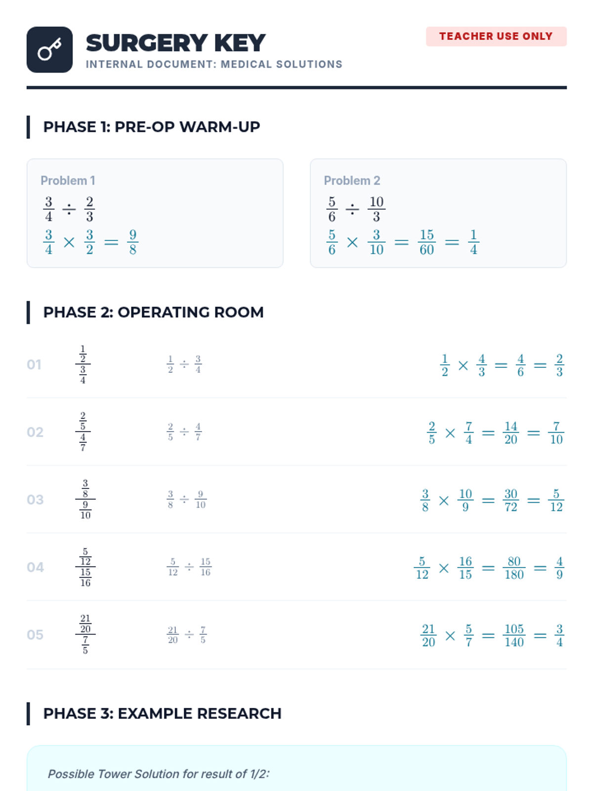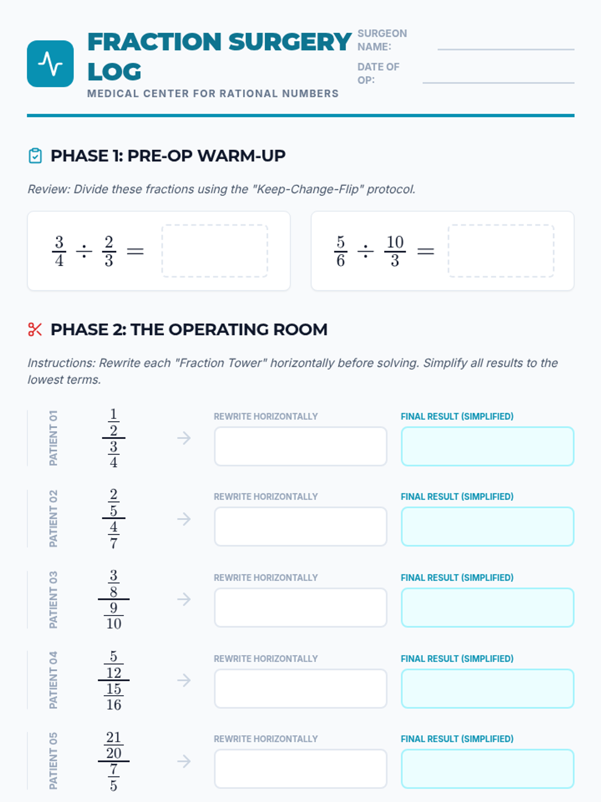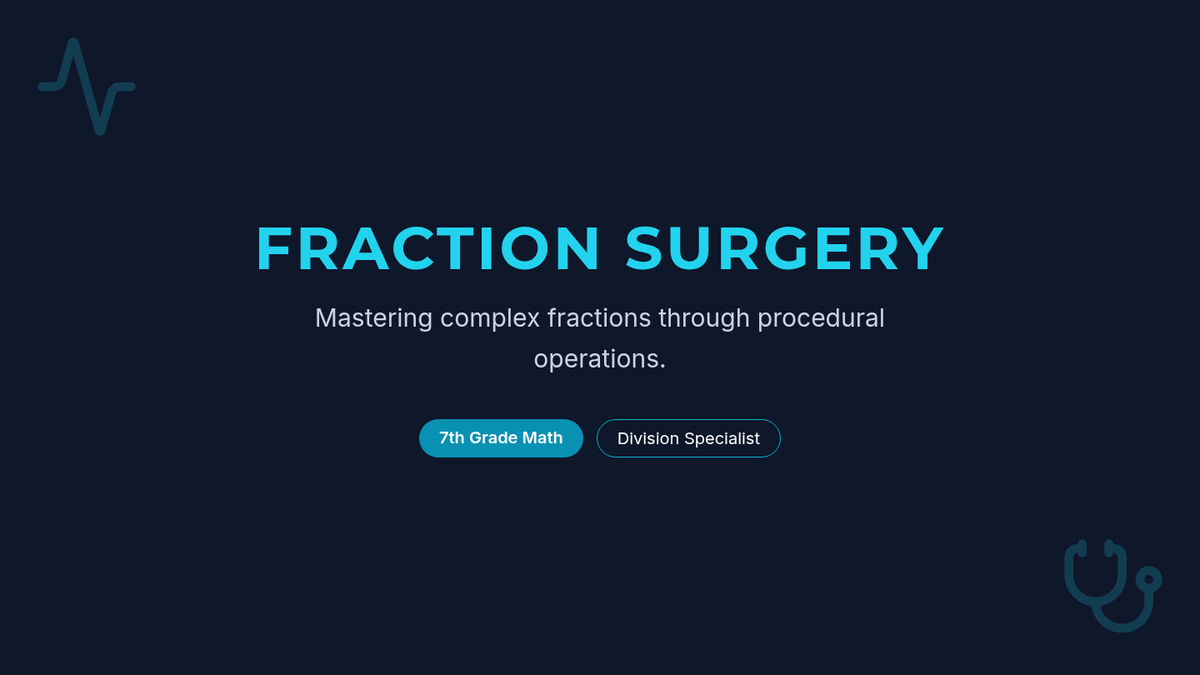 A 7th-grade math lesson focused on simplifying complex fractions (fraction towers) by rewriting them horizontally. Students 'perform surgery' on these complex expressions using division rules like Keep-Change-Flip.