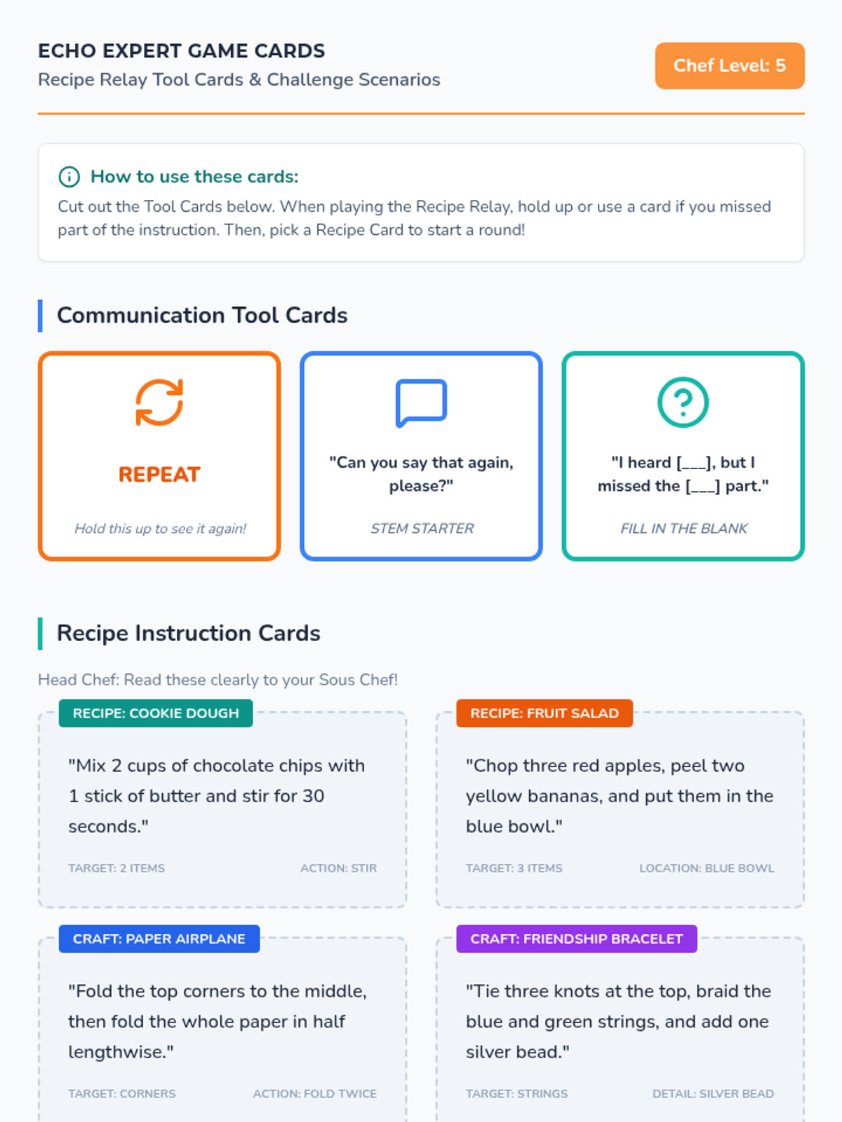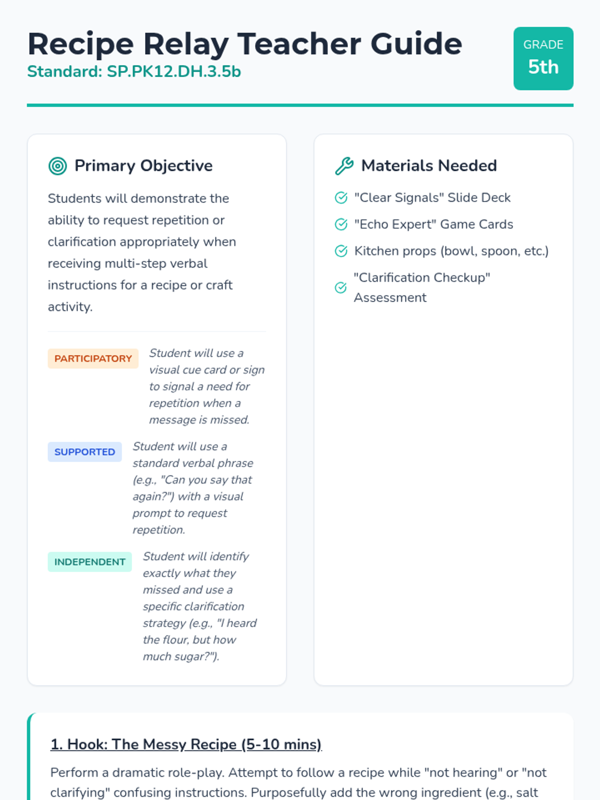 A lesson designed for 5th-grade students who are Hard of Hearing, focusing on the essential life skill of requesting repetition and clarification. It features a modified 'Telephone' game based on kitchen instructions and provides differentiated pathways for varying levels of independence.