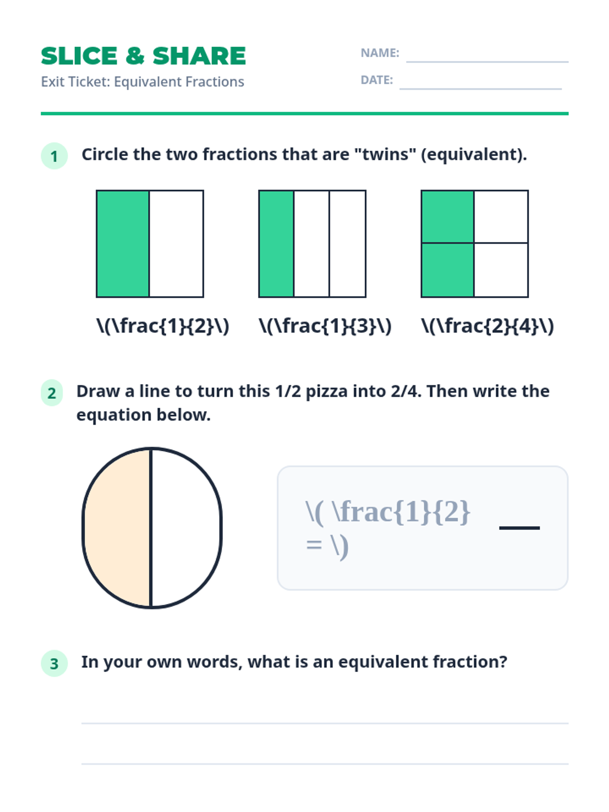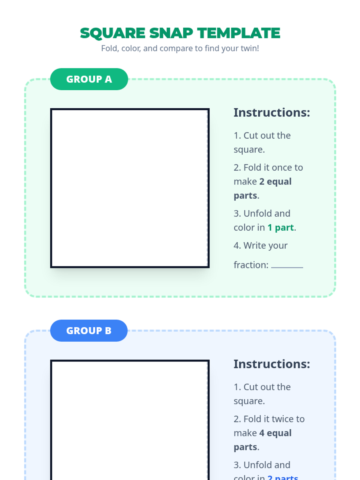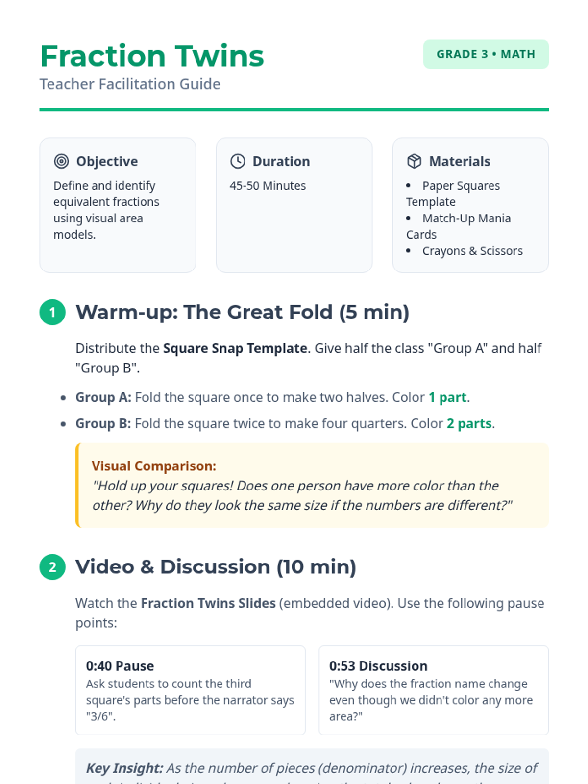 A hands-on introductory lesson on equivalent fractions for 3rd graders, using paper folding, a conceptual video, and a movement-based matching activity. Students will discover that fractions with different names can represent the same physical area.