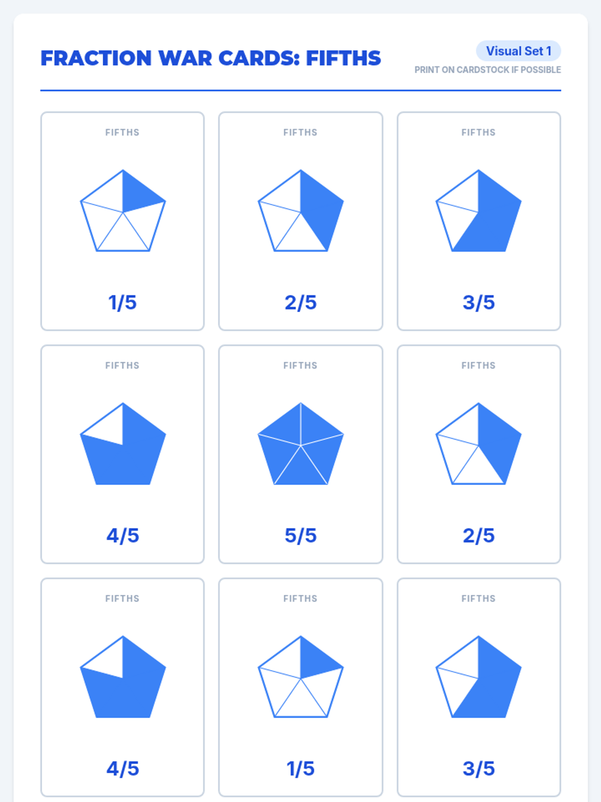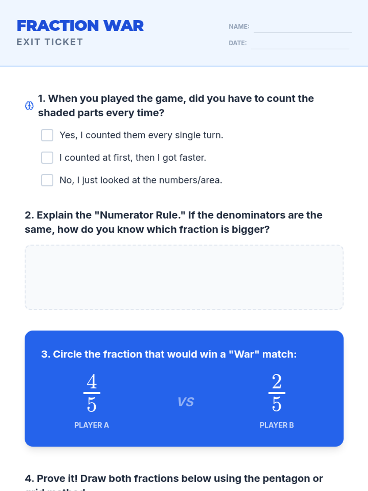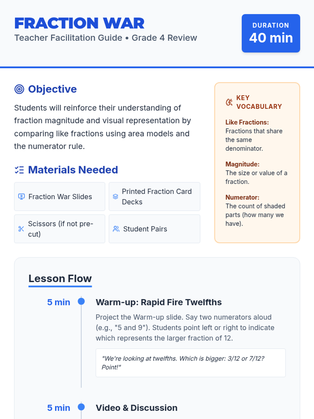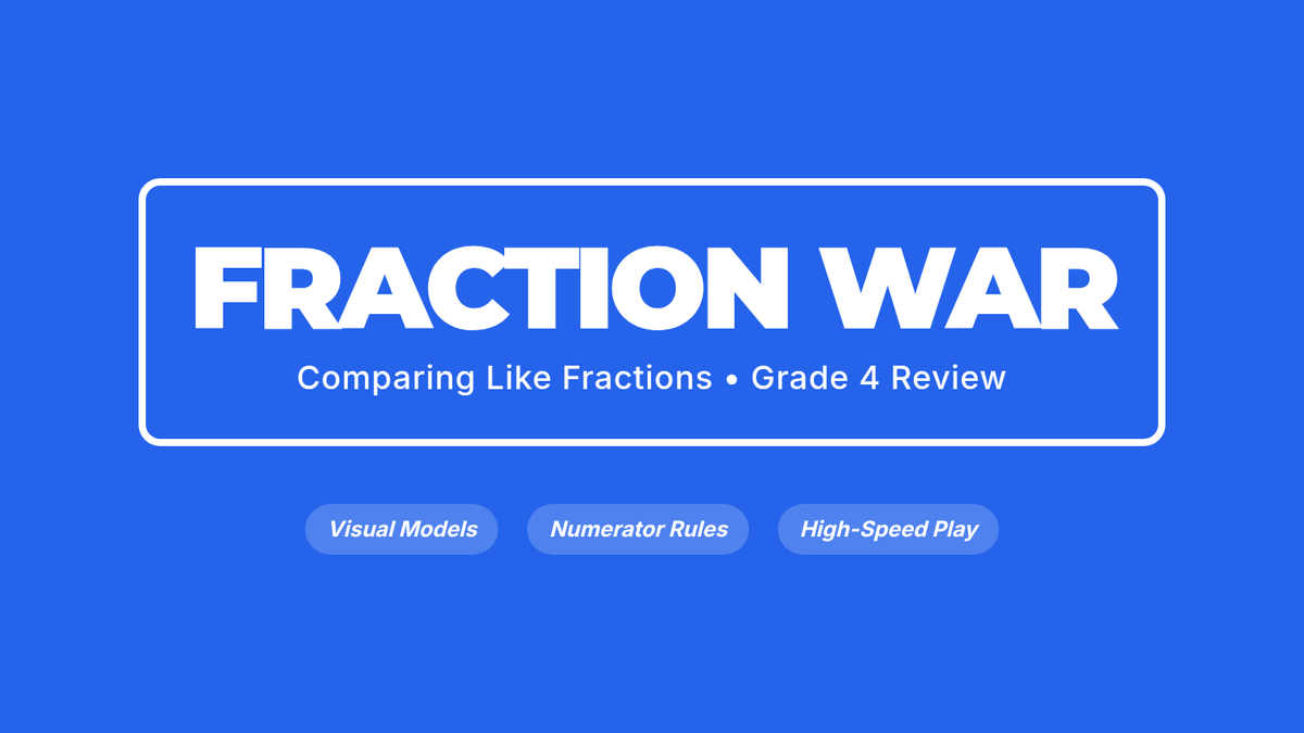 A 4th-grade review lesson focused on comparing fractions with like denominators using visual models and a 'War' style card game. Students will progress from visual intuition to understanding the rule of comparing numerators.