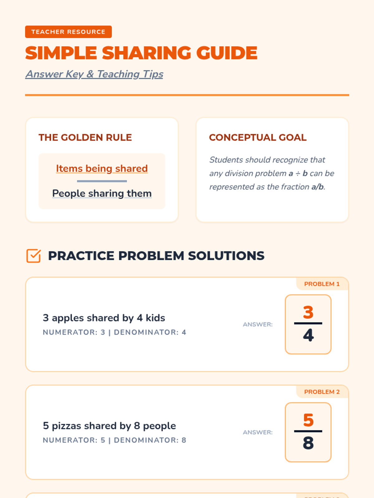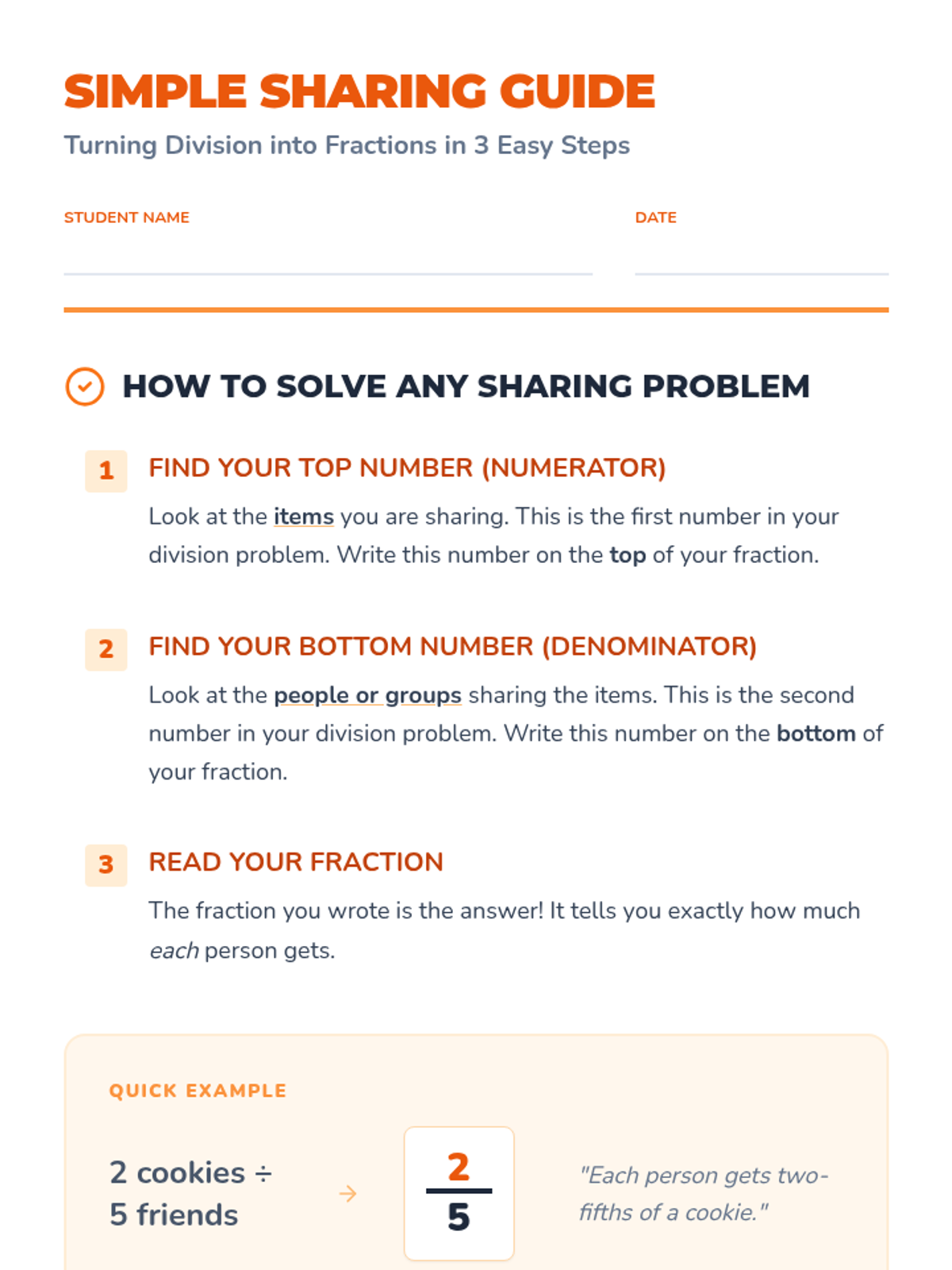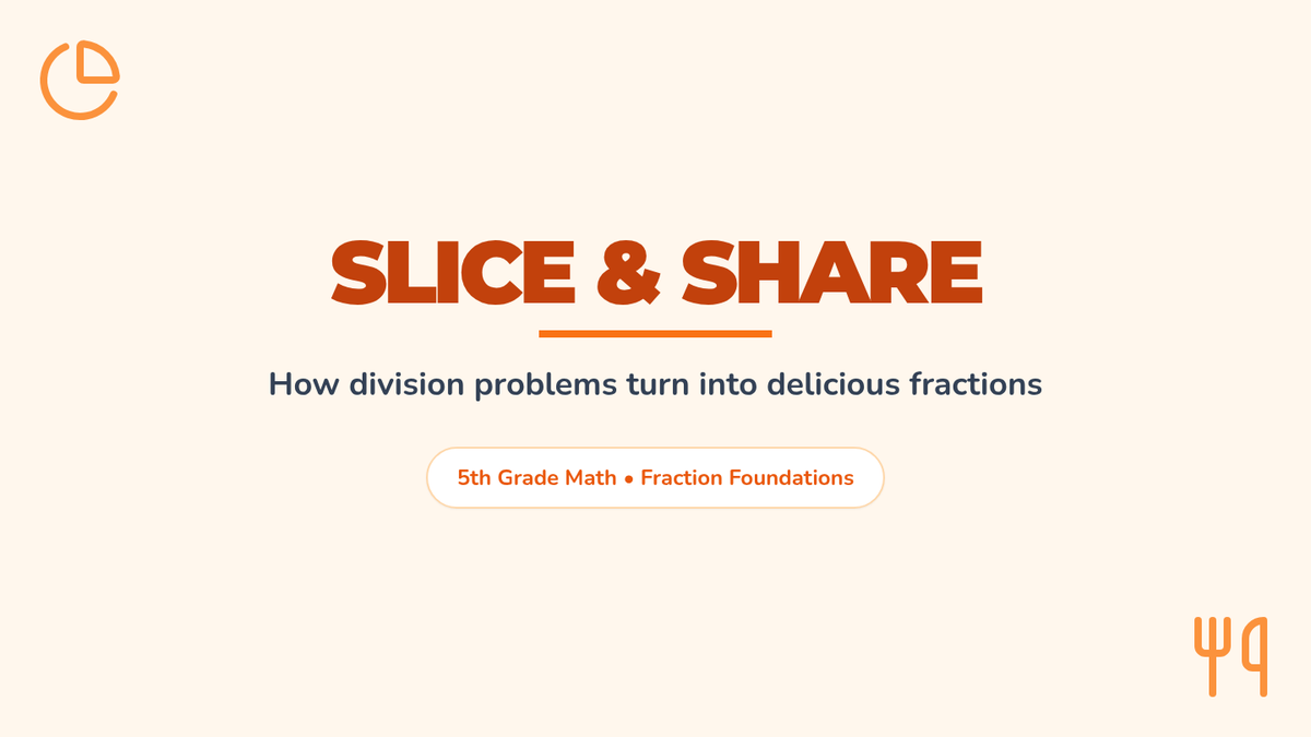 This lesson introduces 5th-grade students to the concept of fractions as division, using real-world sharing scenarios to bridge the gap between dividing whole numbers and creating fractional parts. Students will learn to interpret the division sign as a fraction bar and vice versa.