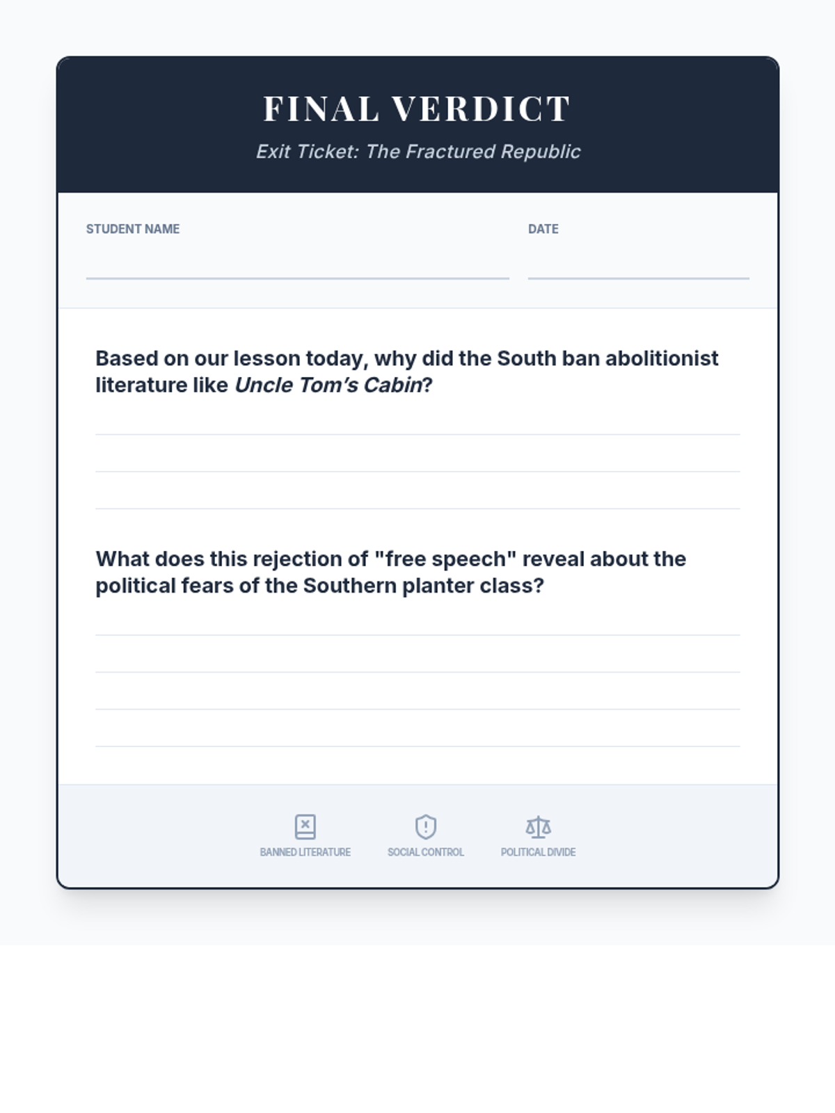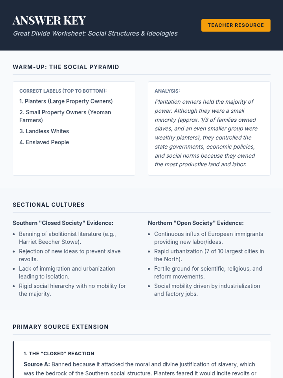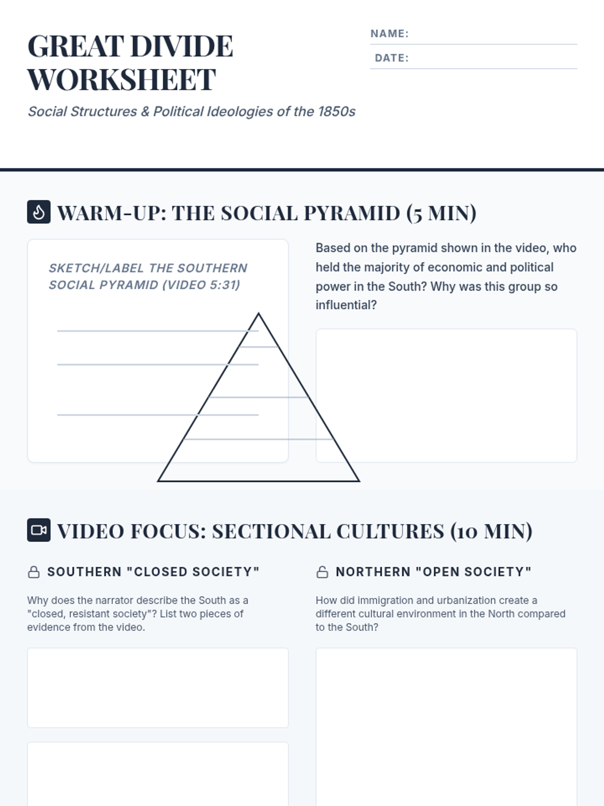 This lesson explores the profound social and cultural divisions between the North and South in the 1850s. Students will analyze how rigid social hierarchies versus urban social mobility shaped conflicting political ideologies, leading to the breakdown of national unity.