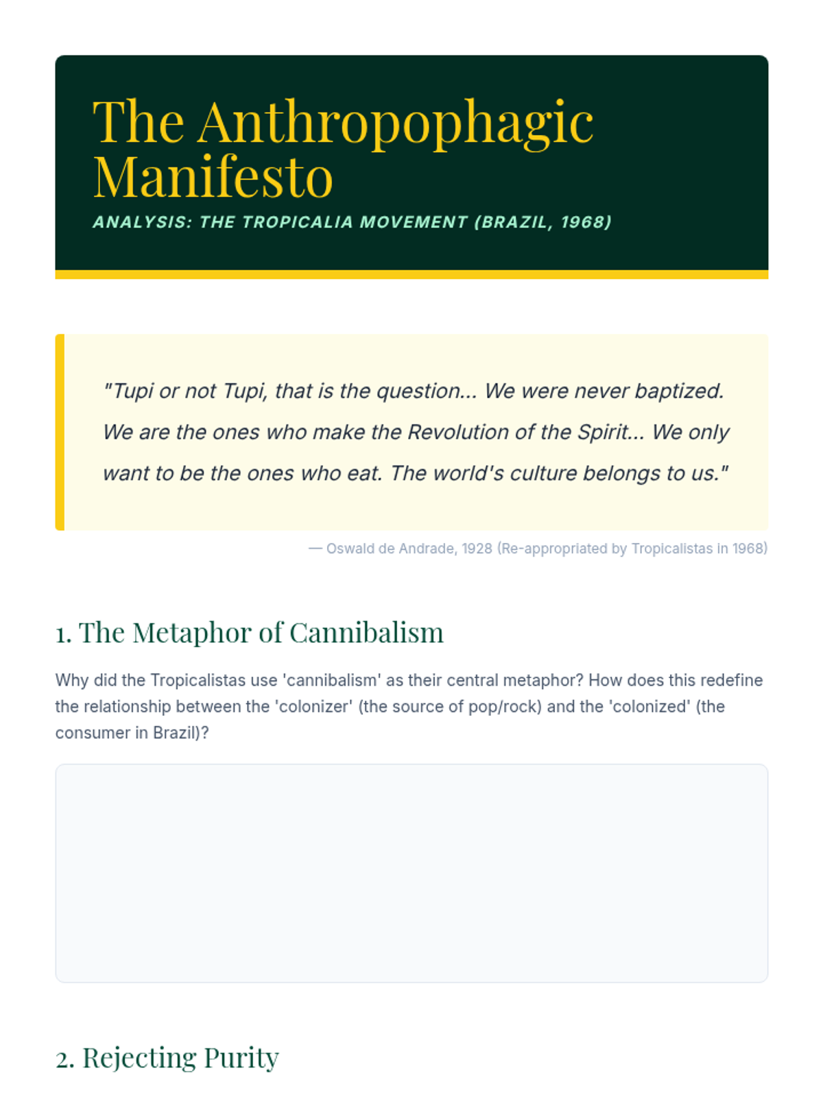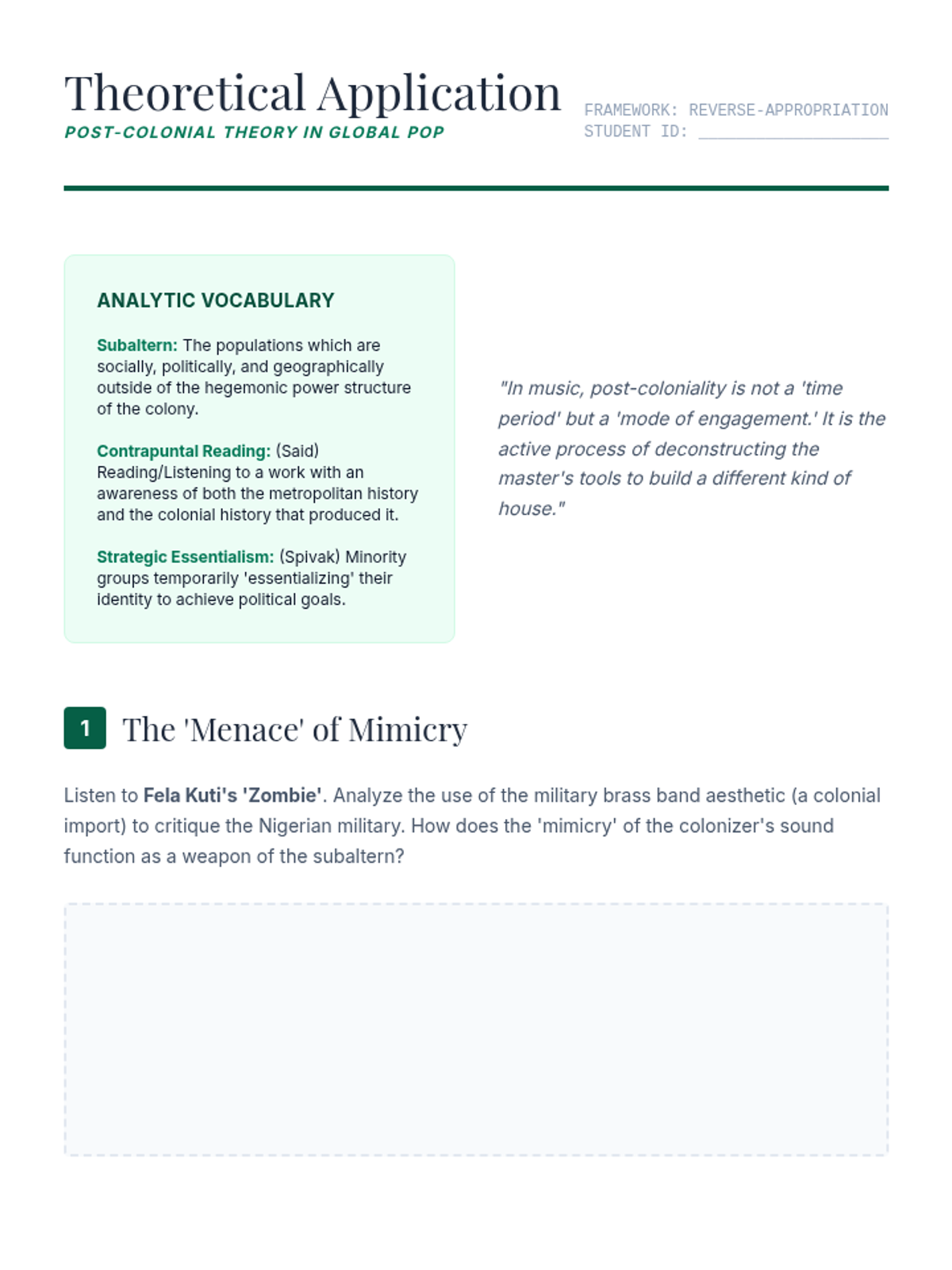 Applying post-colonial theory to late 20th-century global pop, exploring how formerly colonized nations reclaimed and remixed colonial instruments to assert cultural identity.