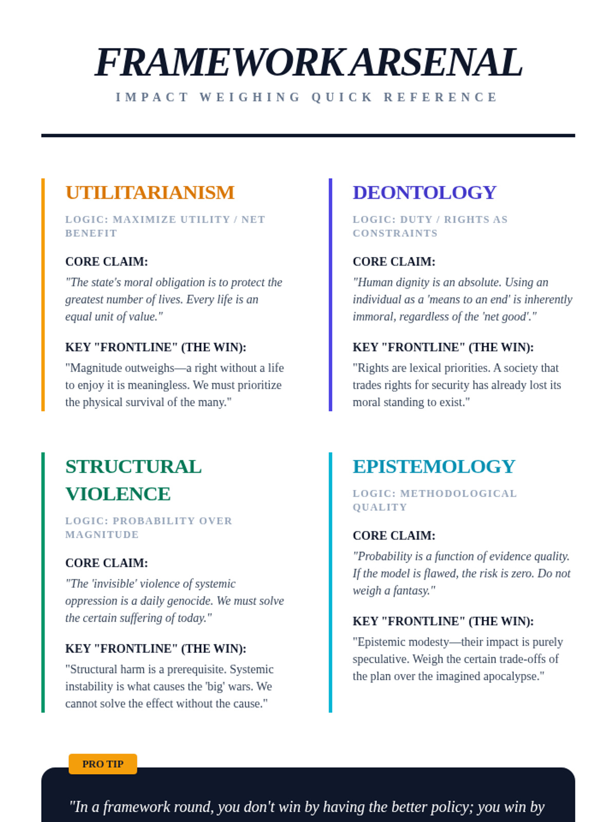 Students participate in debates where the primary conflict is not the policy, but the weighing mechanism itself. One side argues for utilitarianism, the other for human rights, and the winner is determined by who establishes their framework.
