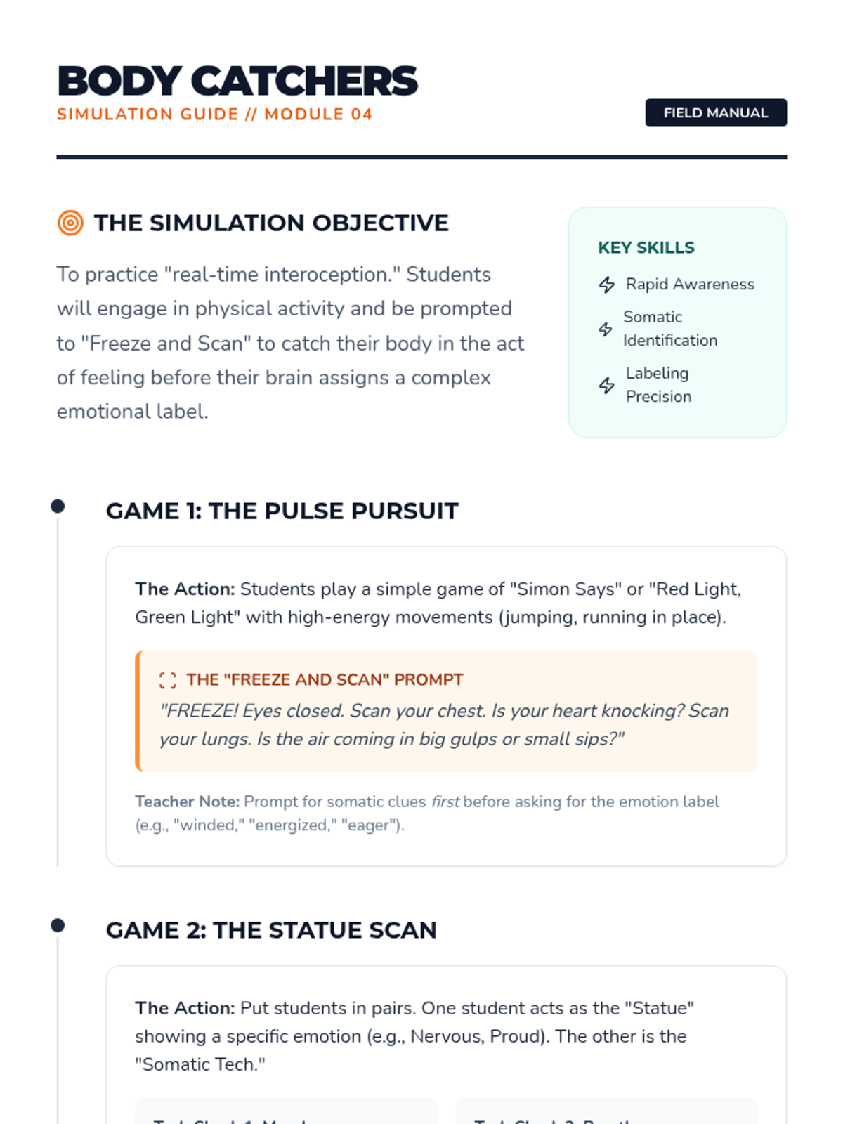A game-based simulation where students practice real-time monitoring of their physical state to identify emotions during activity.