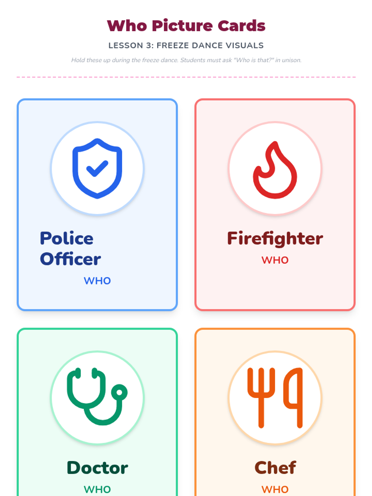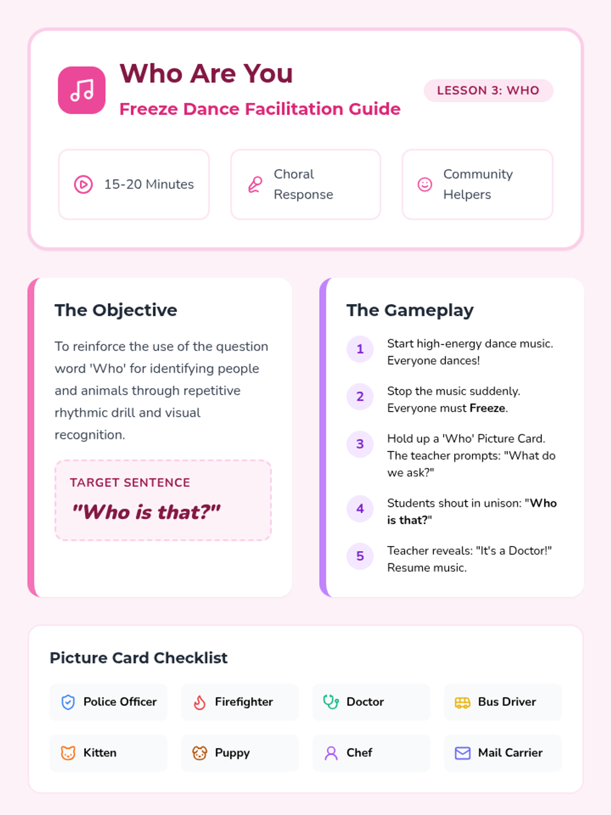 An active music-based game where students identify 'Who' characters (community helpers and animals) during freeze-dance pauses.