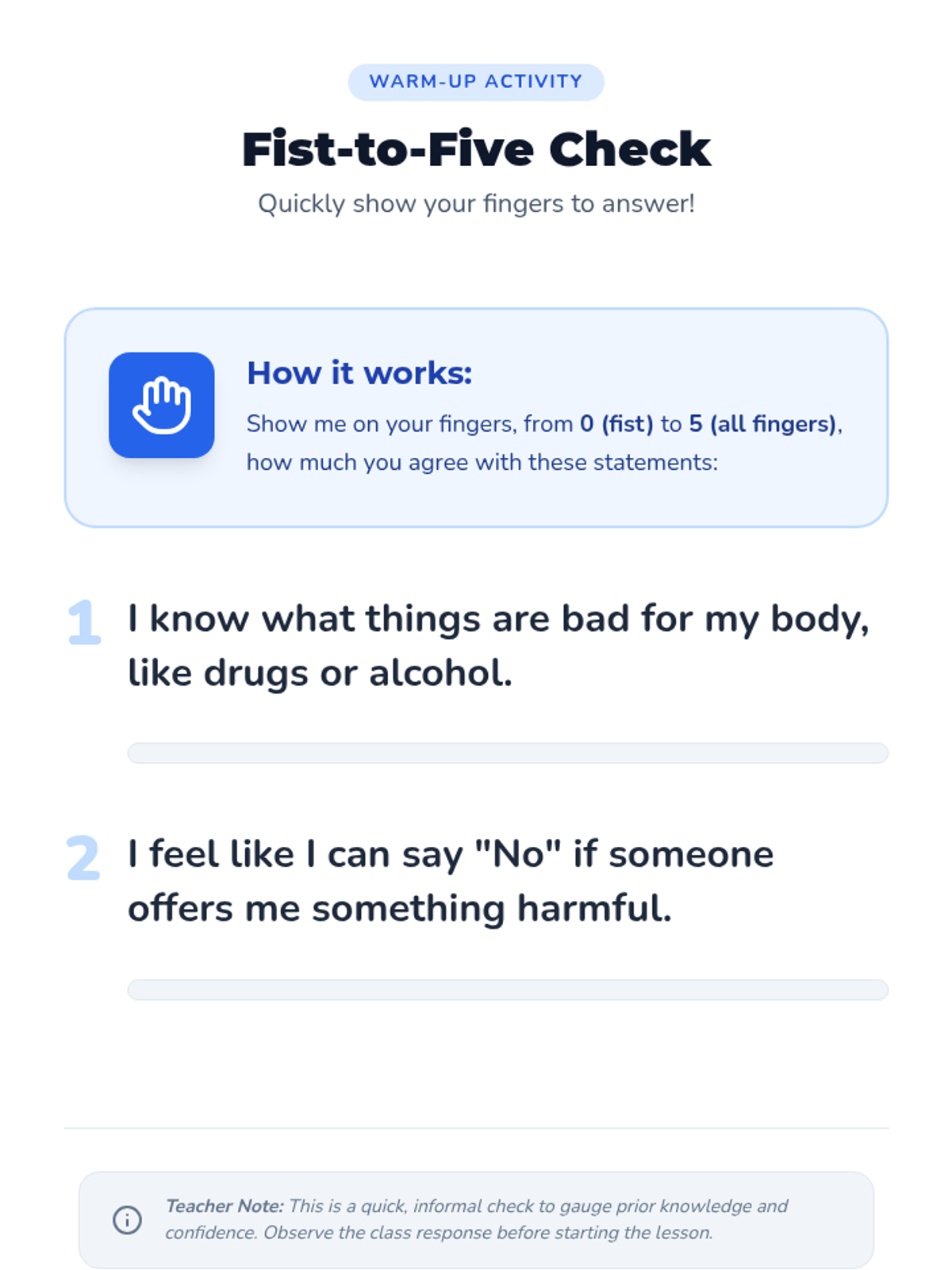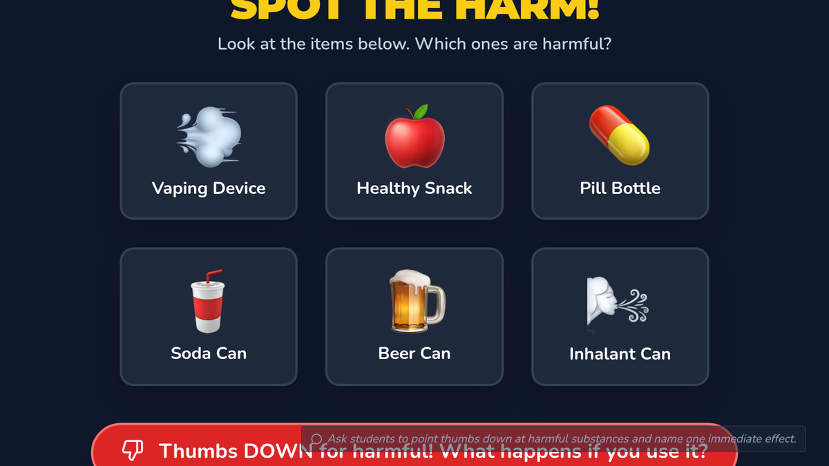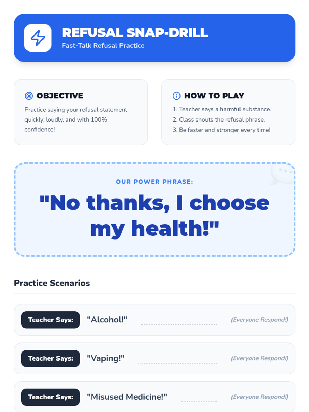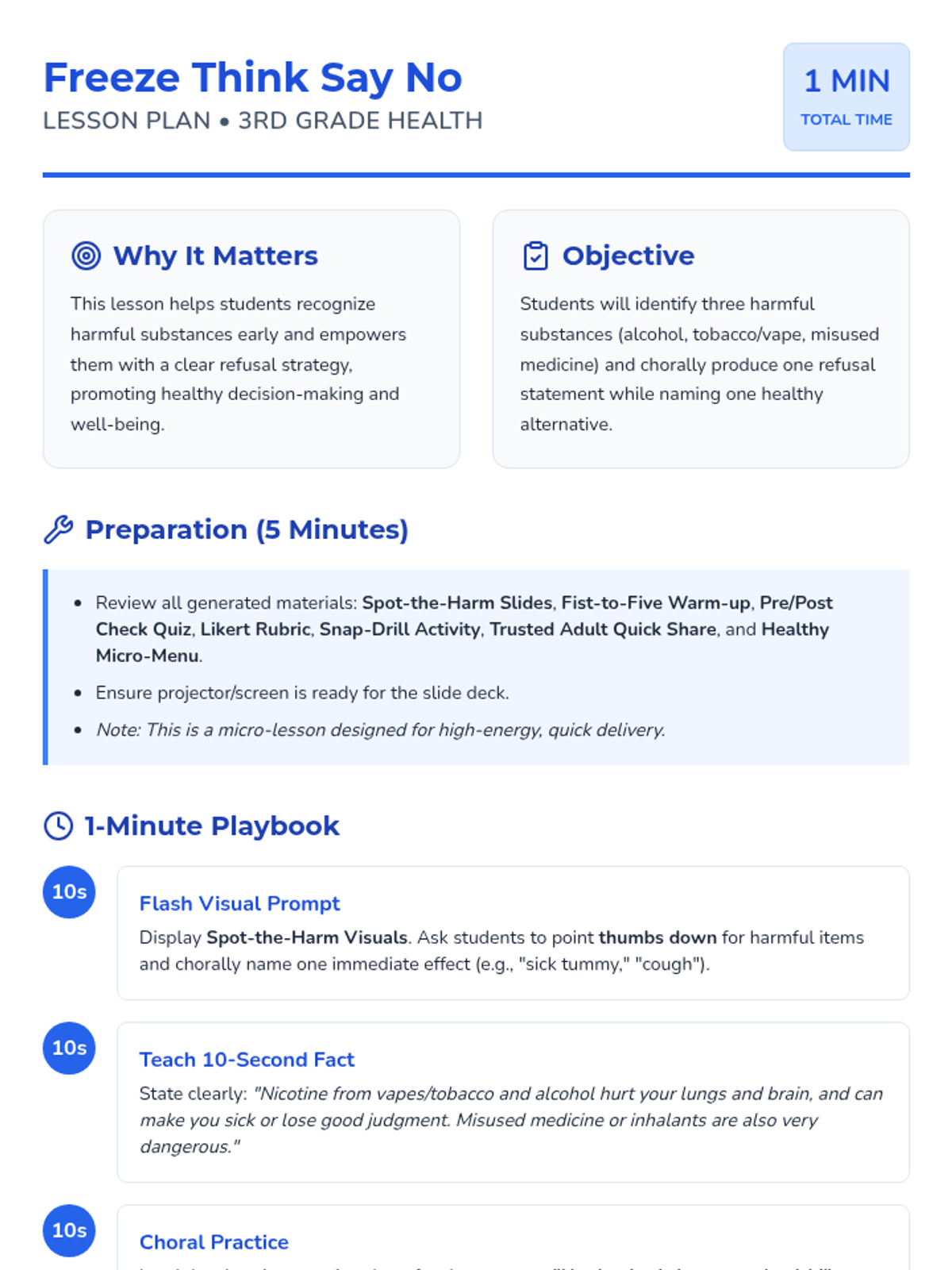 A fast-paced, one-minute micro-lesson designed for 3rd graders to identify harmful substances, practice refusal skills, and choose healthy alternatives. Students build confidence through choral practice and peer sharing.