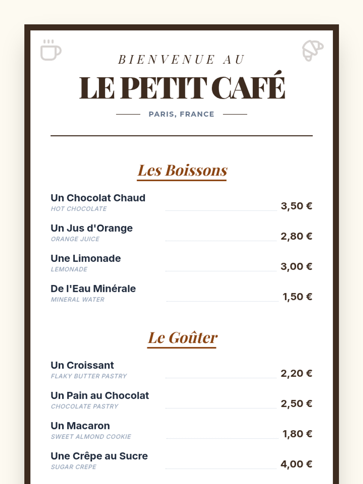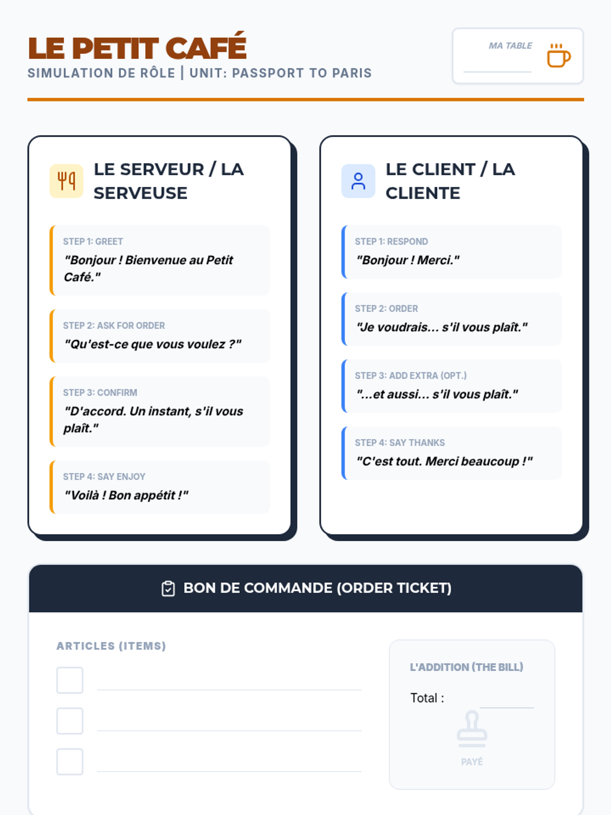 Participating in a classroom café simulation to practice ordering and social transactions.