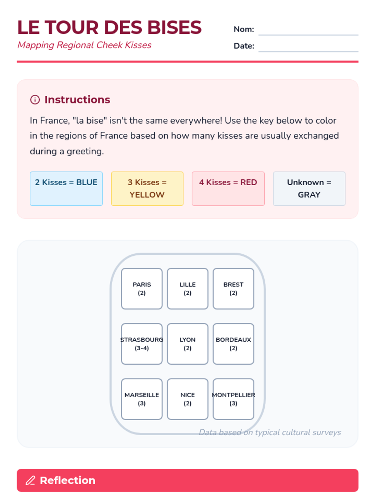 Students learn about 'la bise' and French handshakes, exploring regional differences in non-verbal greetings across France.