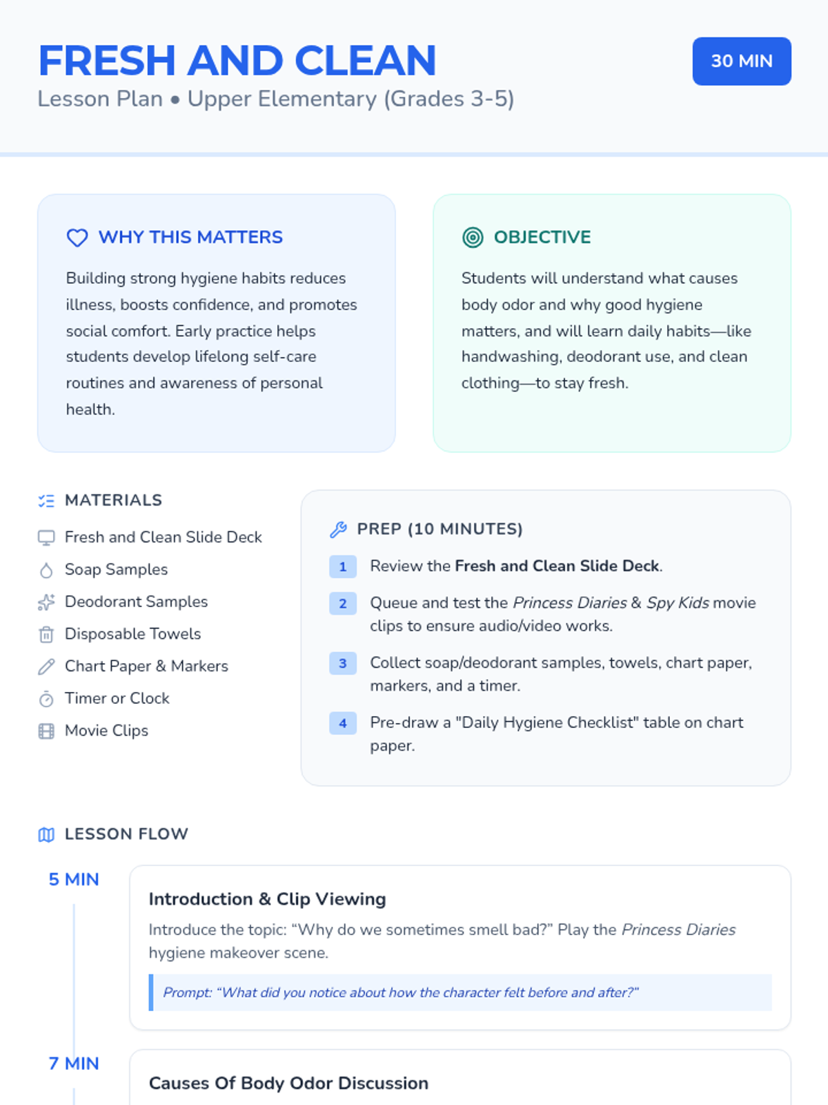 A 30-minute session for upper elementary students exploring the causes of body odor and the importance of daily hygiene through movie clips, hands-on practice, and habit tracking.