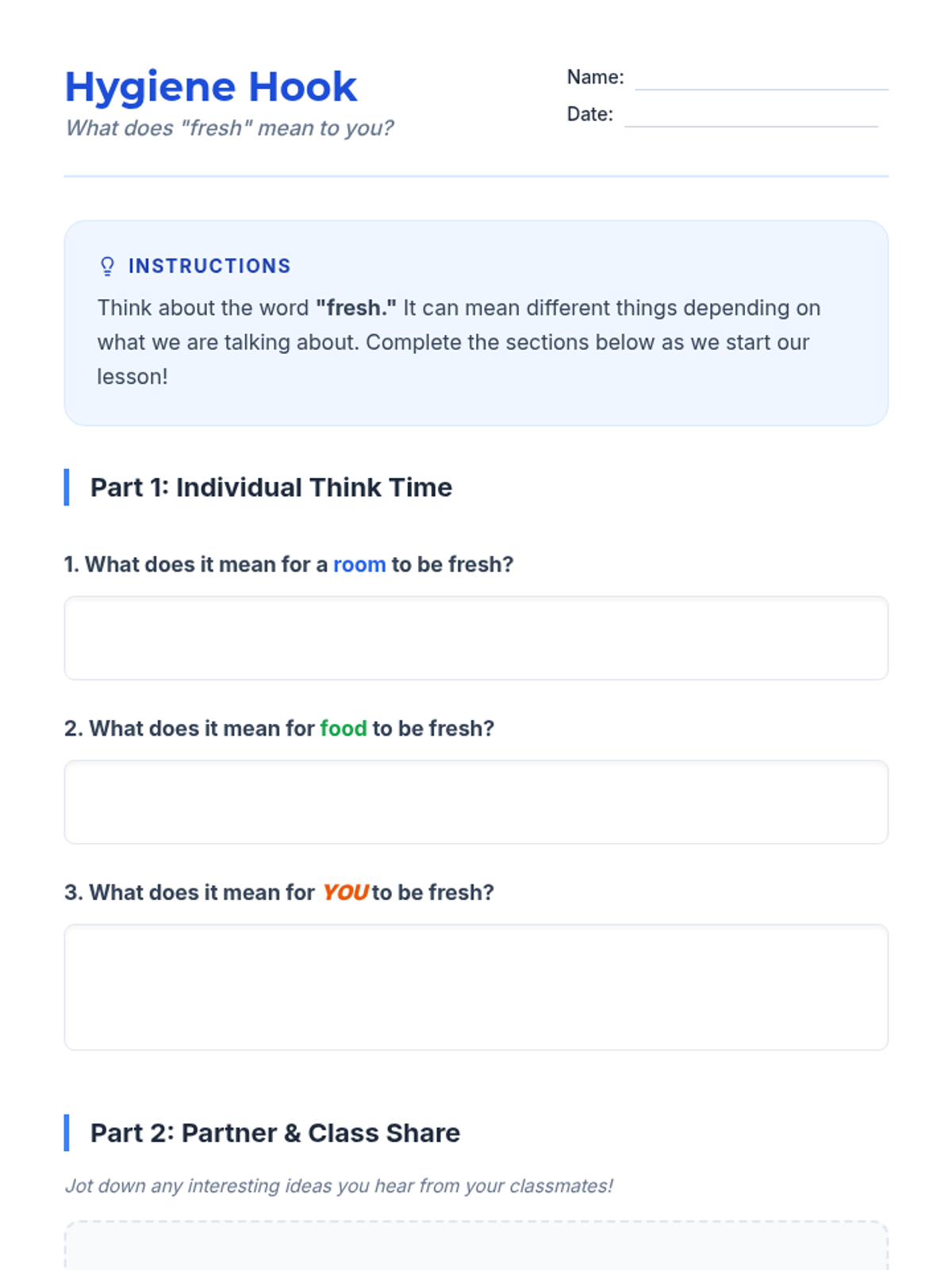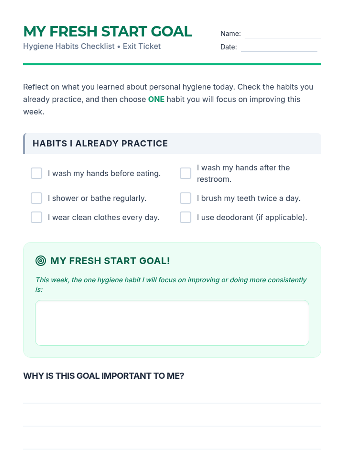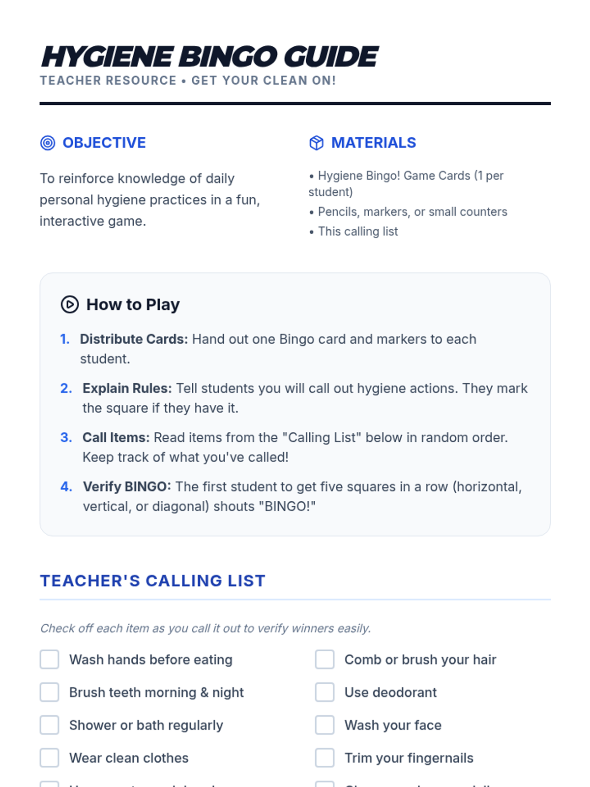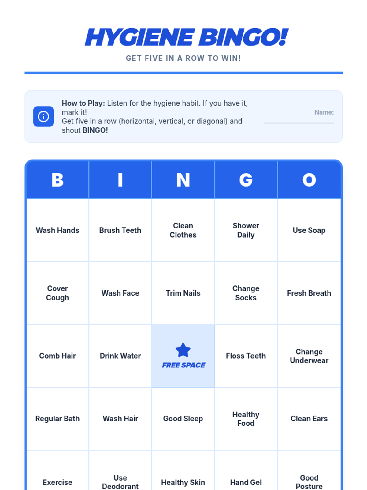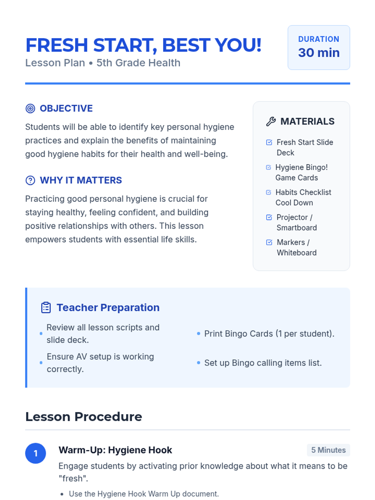 This lesson helps 5th-grade students understand the importance of personal hygiene for their health, confidence, and social interactions through interactive discussion and a fun Bingo game.