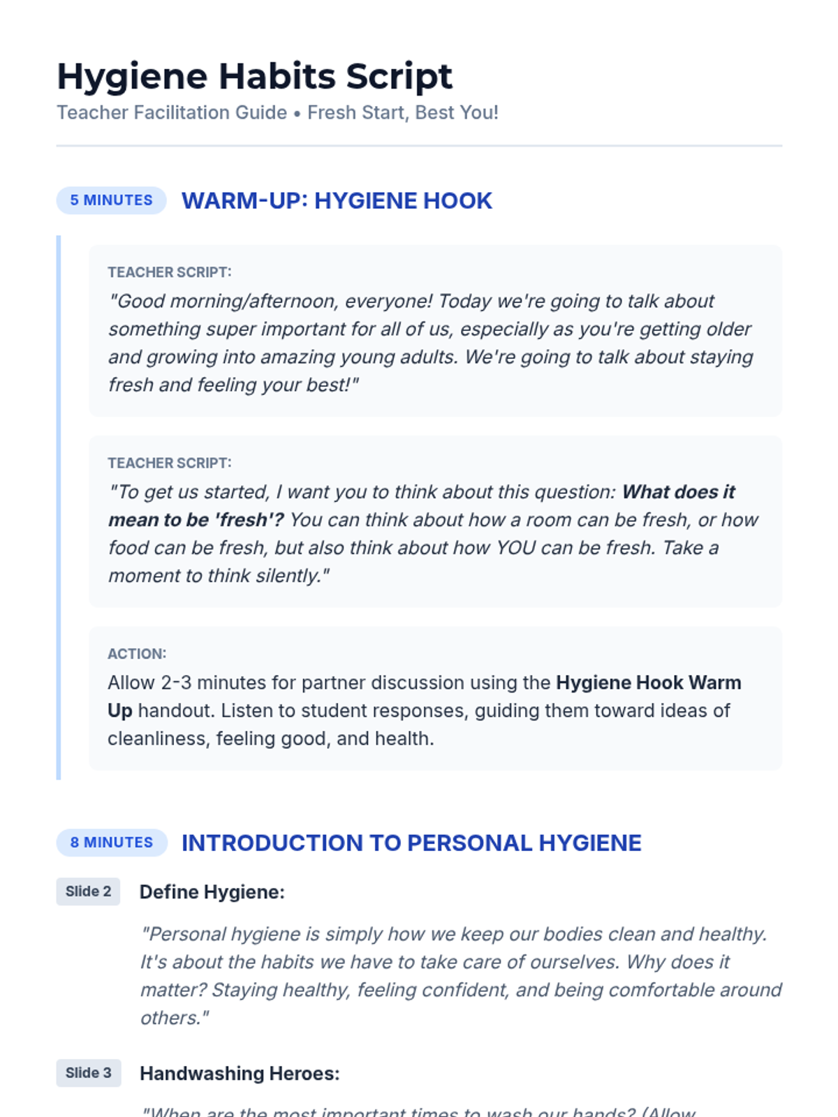 A collection of hygiene reference postcards tailored for elementary, middle school, high school, and adults. Each double-sided card provides empathetic, age-appropriate guidance on essential daily routines to support health and confidence.