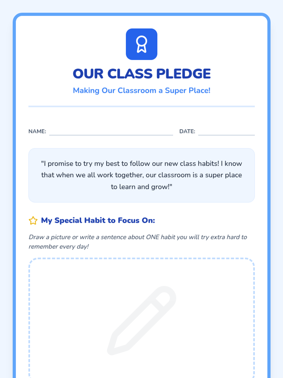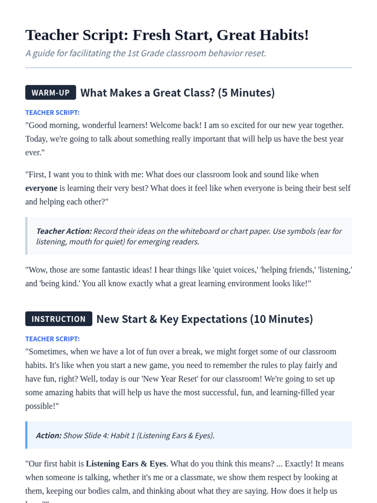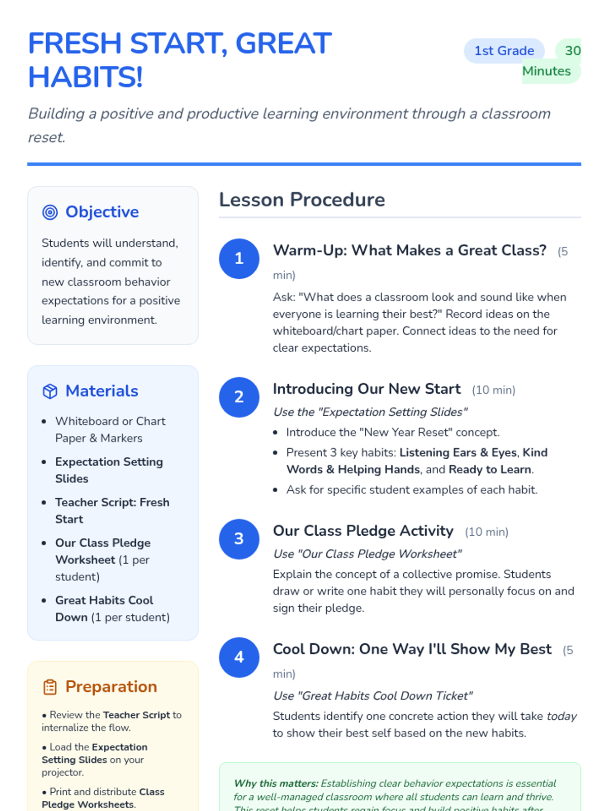 A 1st-grade lesson focused on resetting classroom behavior expectations through interactive discussion, visual aids, and a commitment activity to foster a positive learning environment.