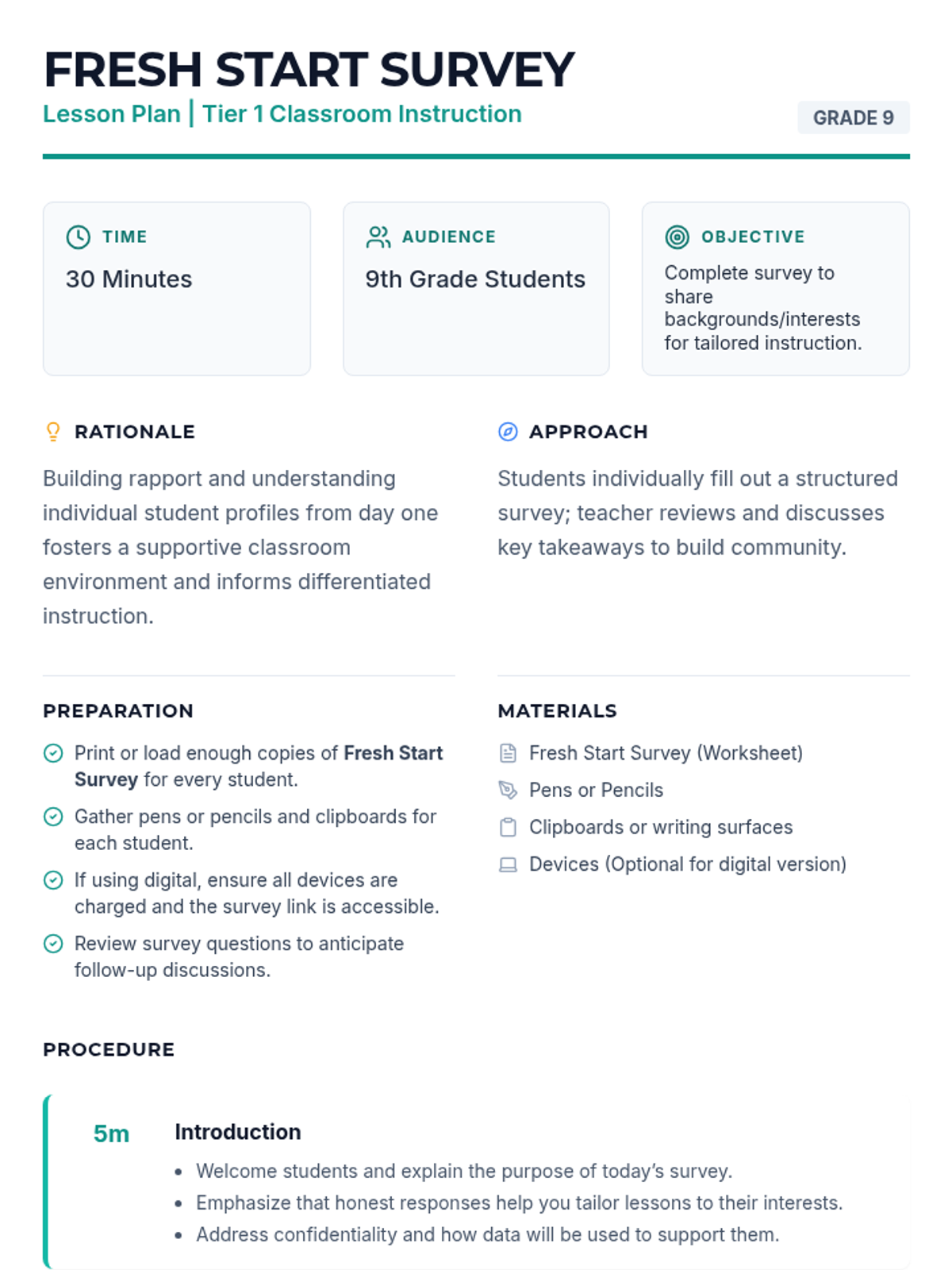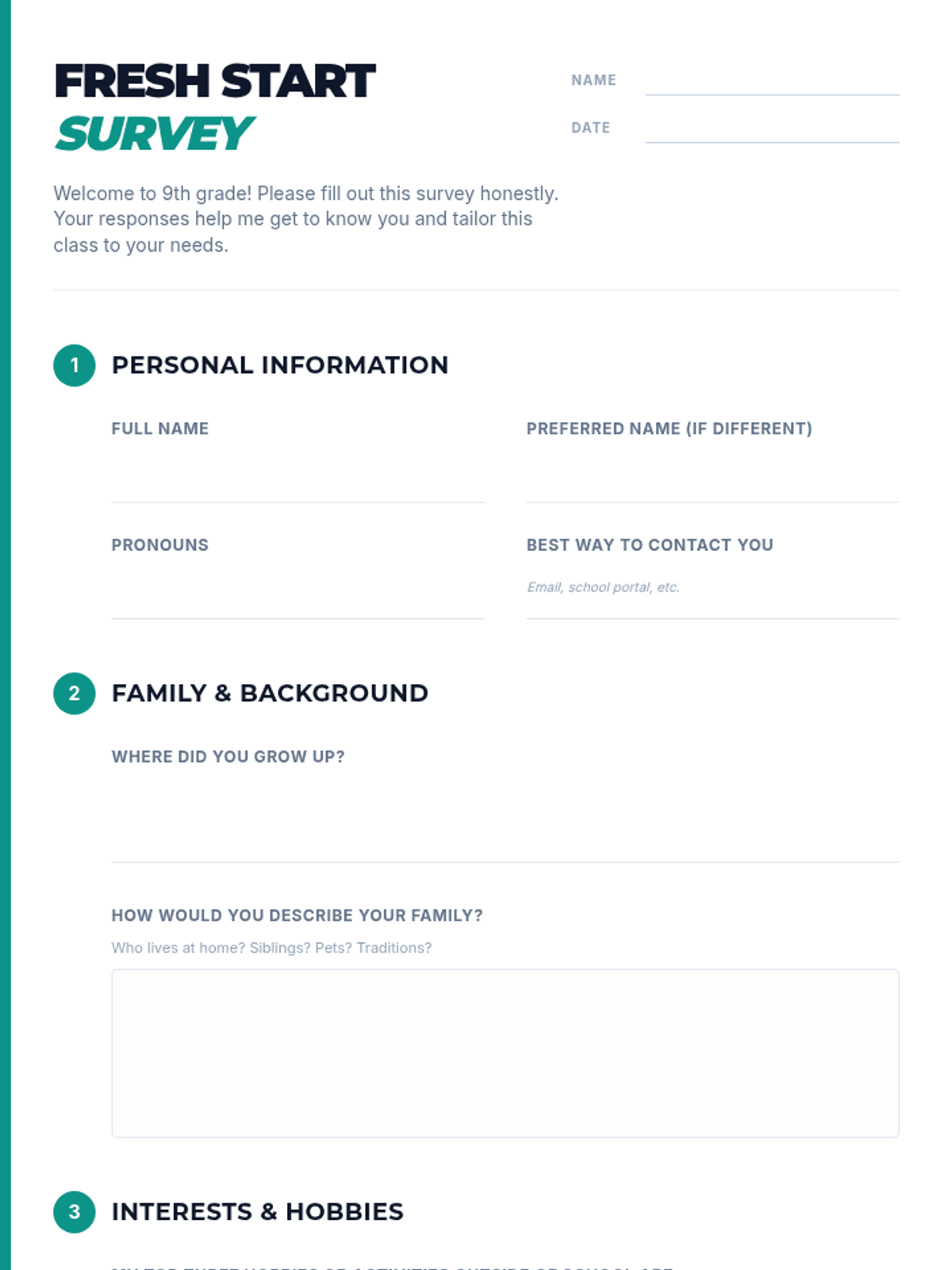 A fun, 30-minute introductory survey for 9th graders to share their backgrounds, interests, and learning preferences, helping teachers build rapport and personalize instruction.