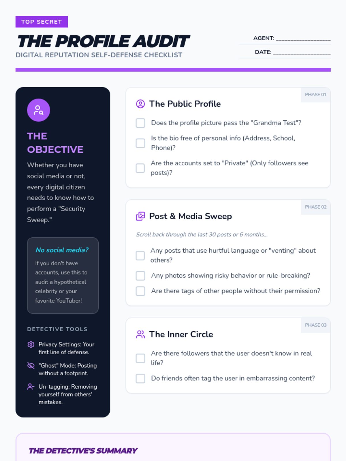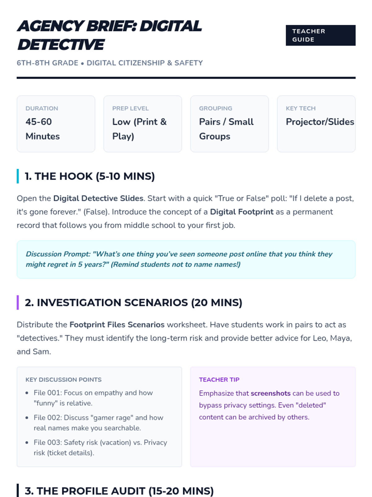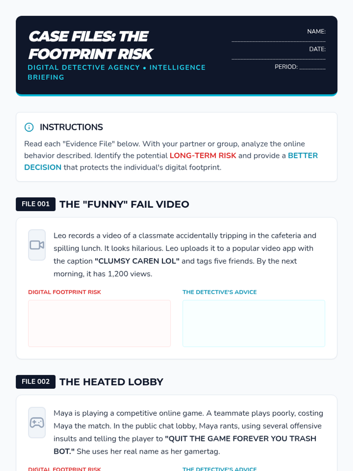 A comprehensive lesson for middle schoolers on navigating the digital world safely, focusing on the permanence of digital footprints and managing online reputations. Students act as 'Digital Detectives' to analyze scenarios and audit social media habits.