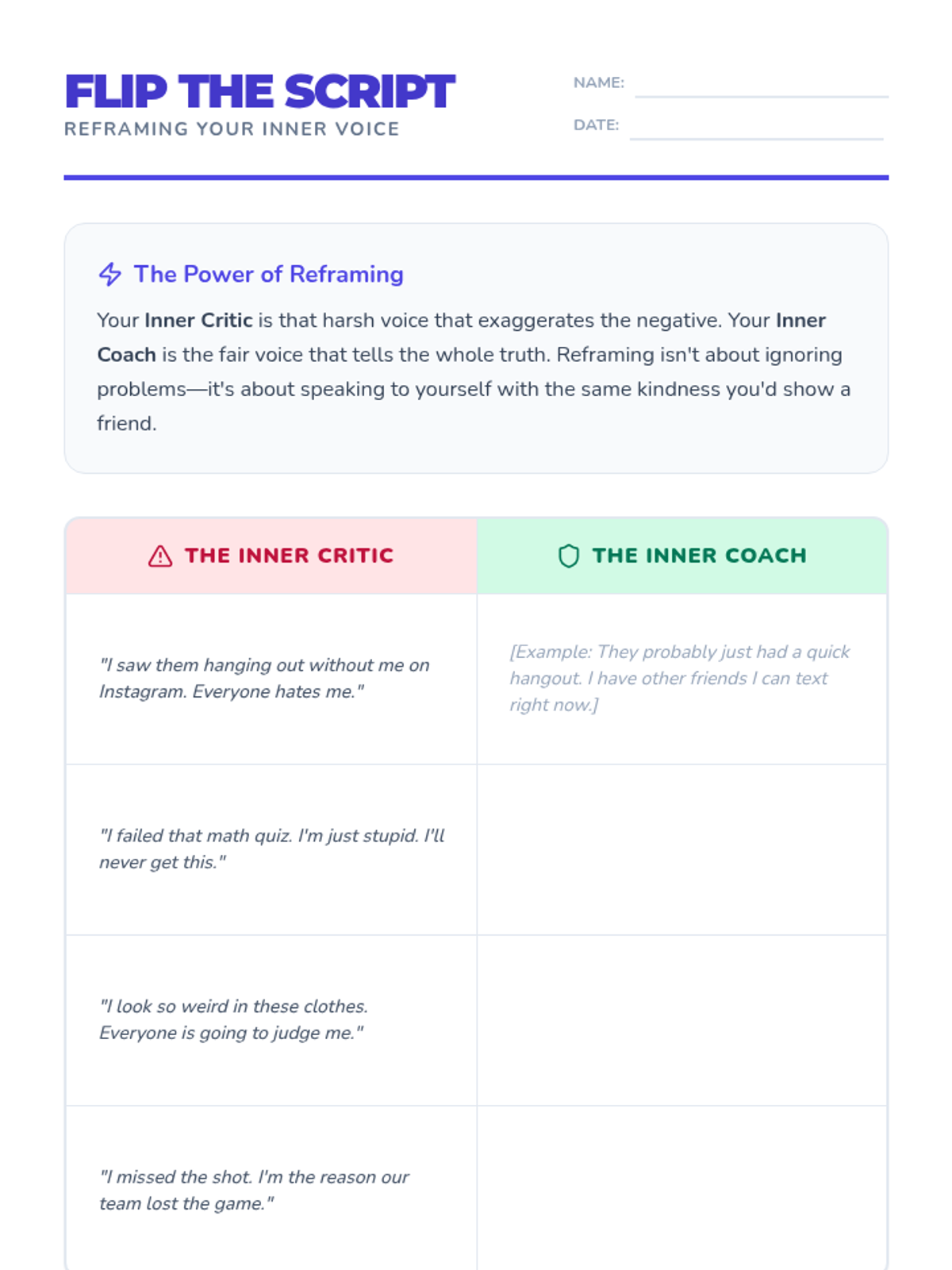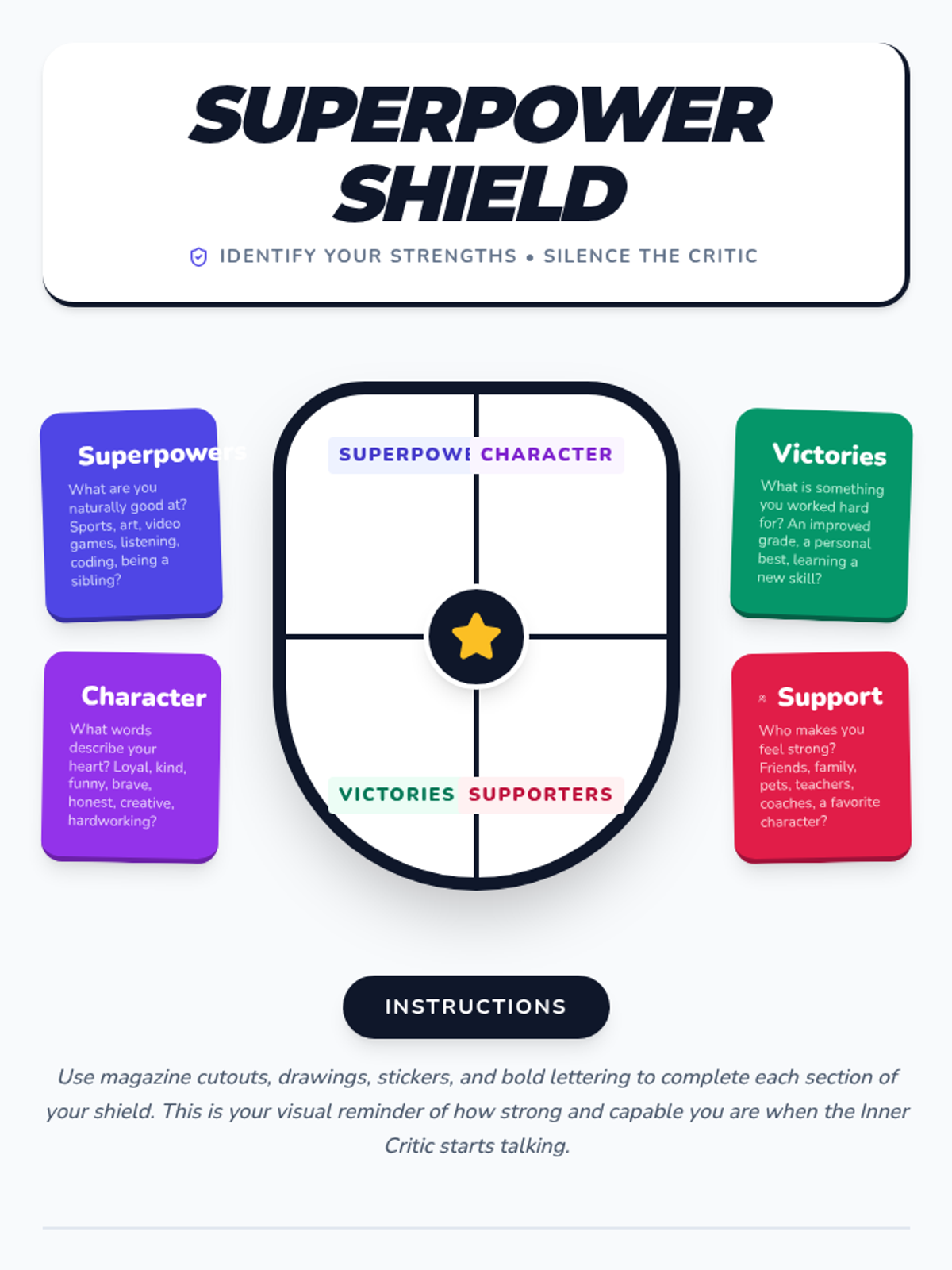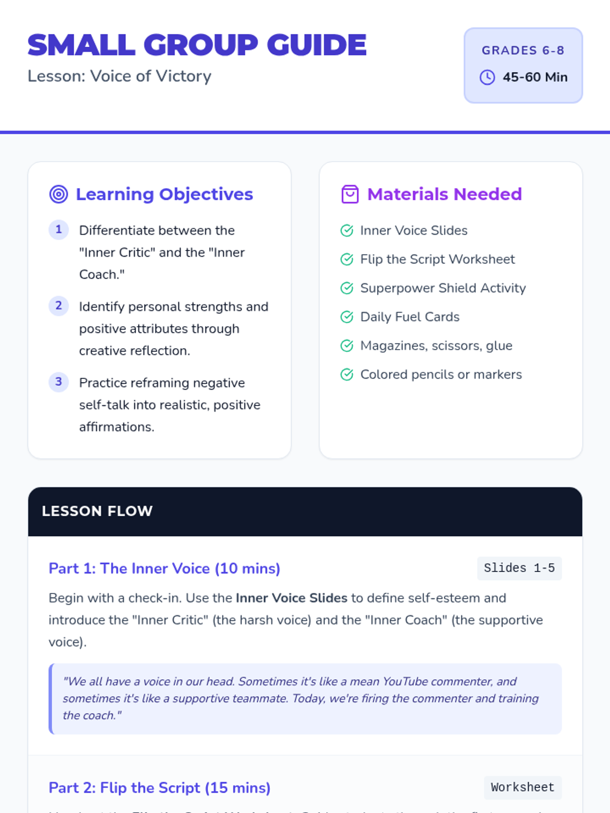 A middle school small group counseling lesson focused on identifying the 'Inner Critic,' practicing thought reframing, and celebrating personal strengths through affirmations and creative activities.