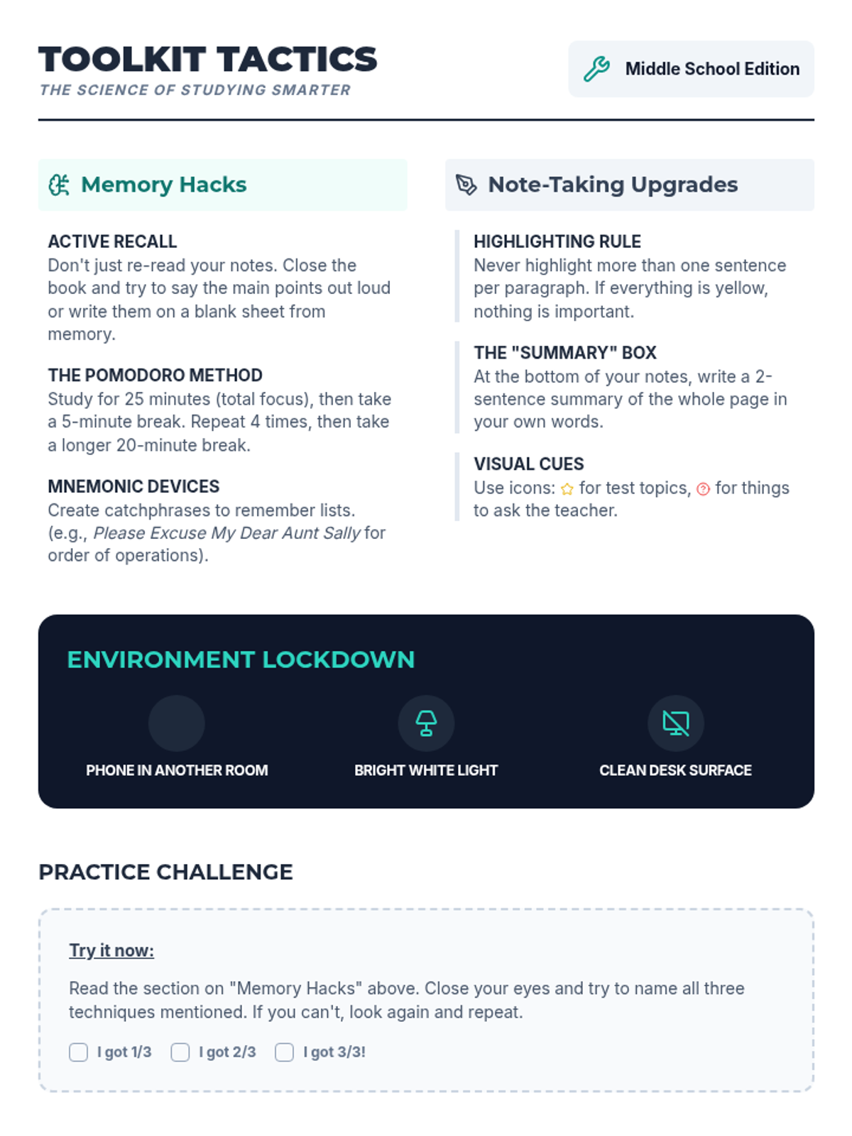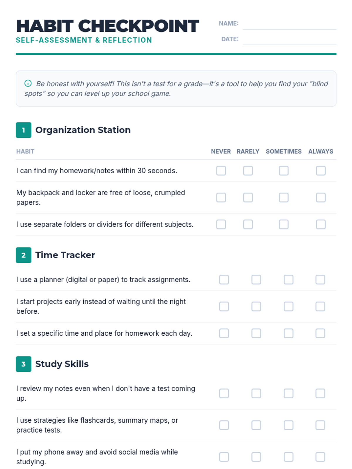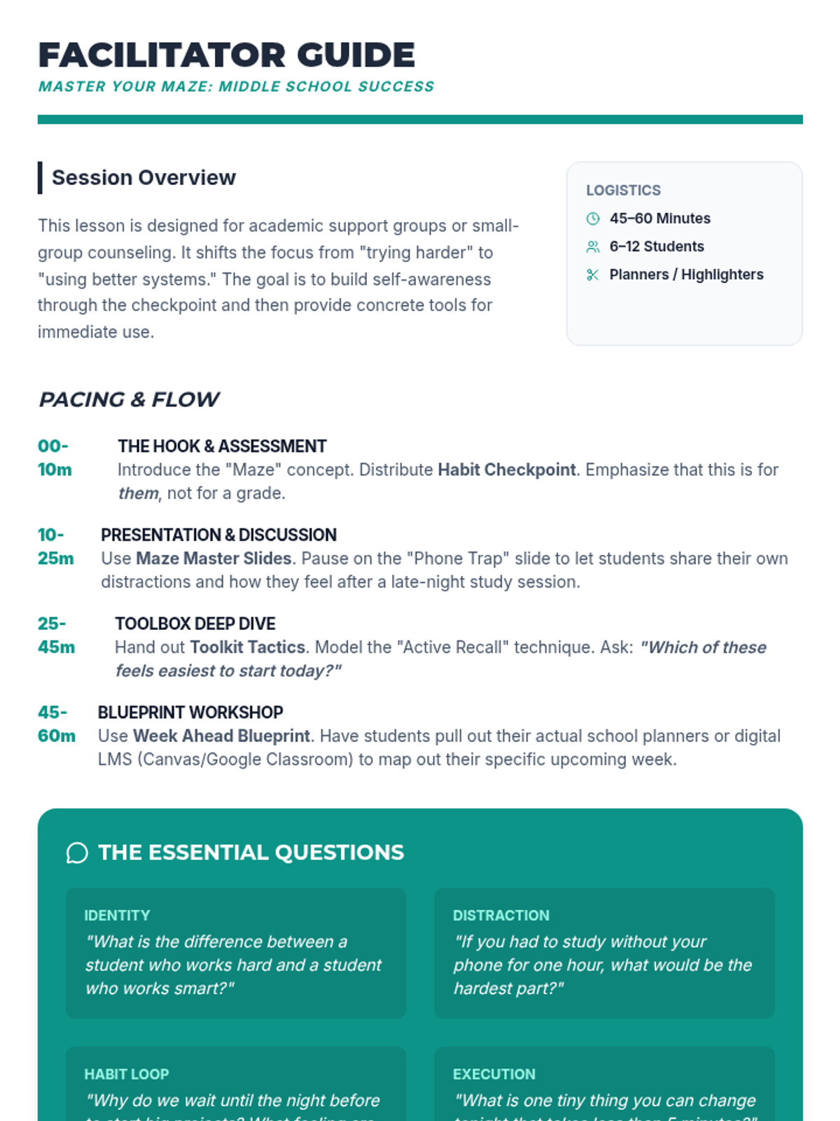 A comprehensive counseling lesson designed for middle school academic support groups, focusing on self-awareness of habits, time management through planning, and building a versatile study toolkit.