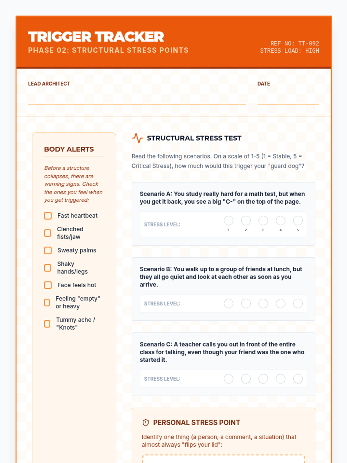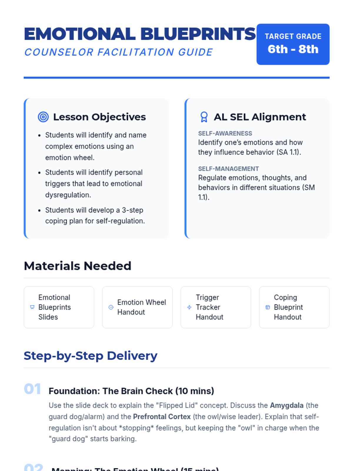 A comprehensive middle school counseling lesson focused on emotional literacy and self-regulation strategies using a 'blueprint' theme. Students will explore brain science, identify personal triggers, and construct a customized coping plan.