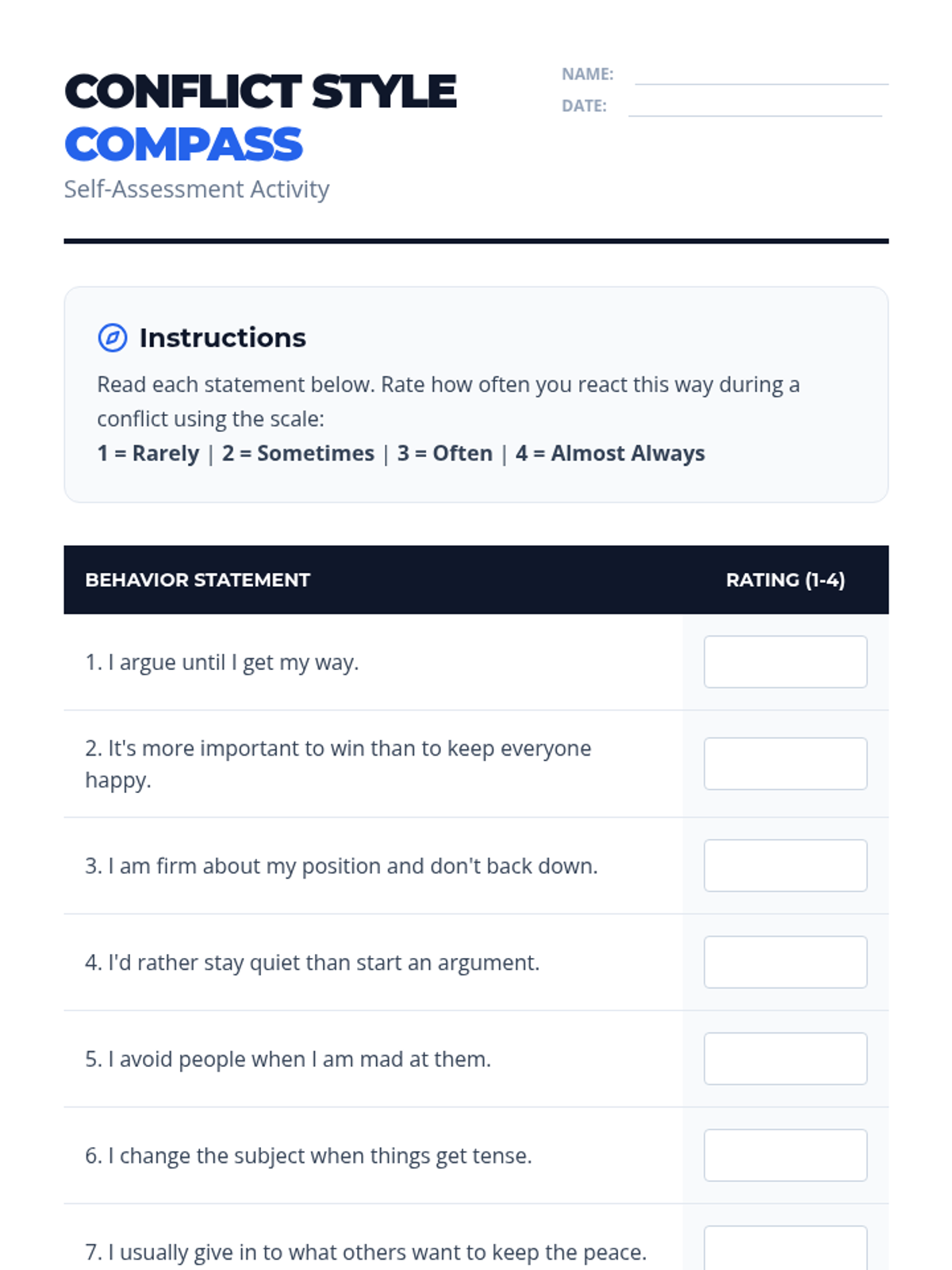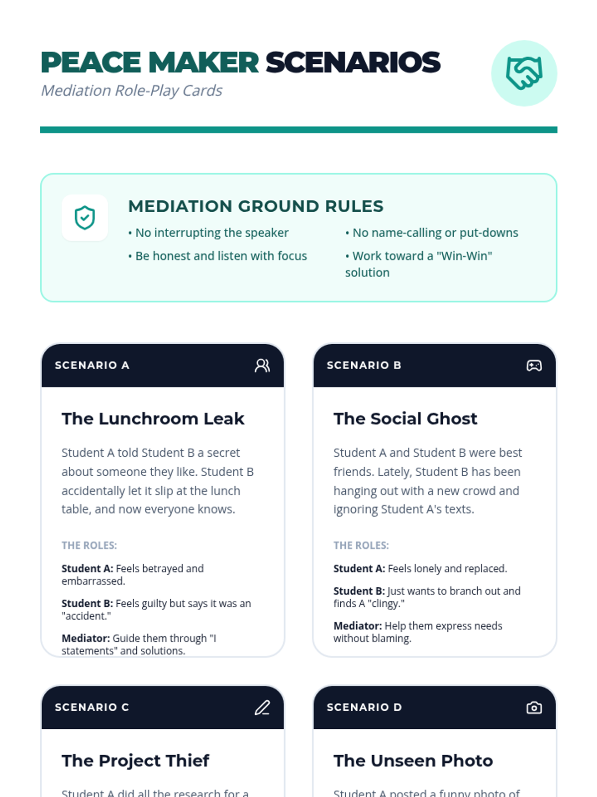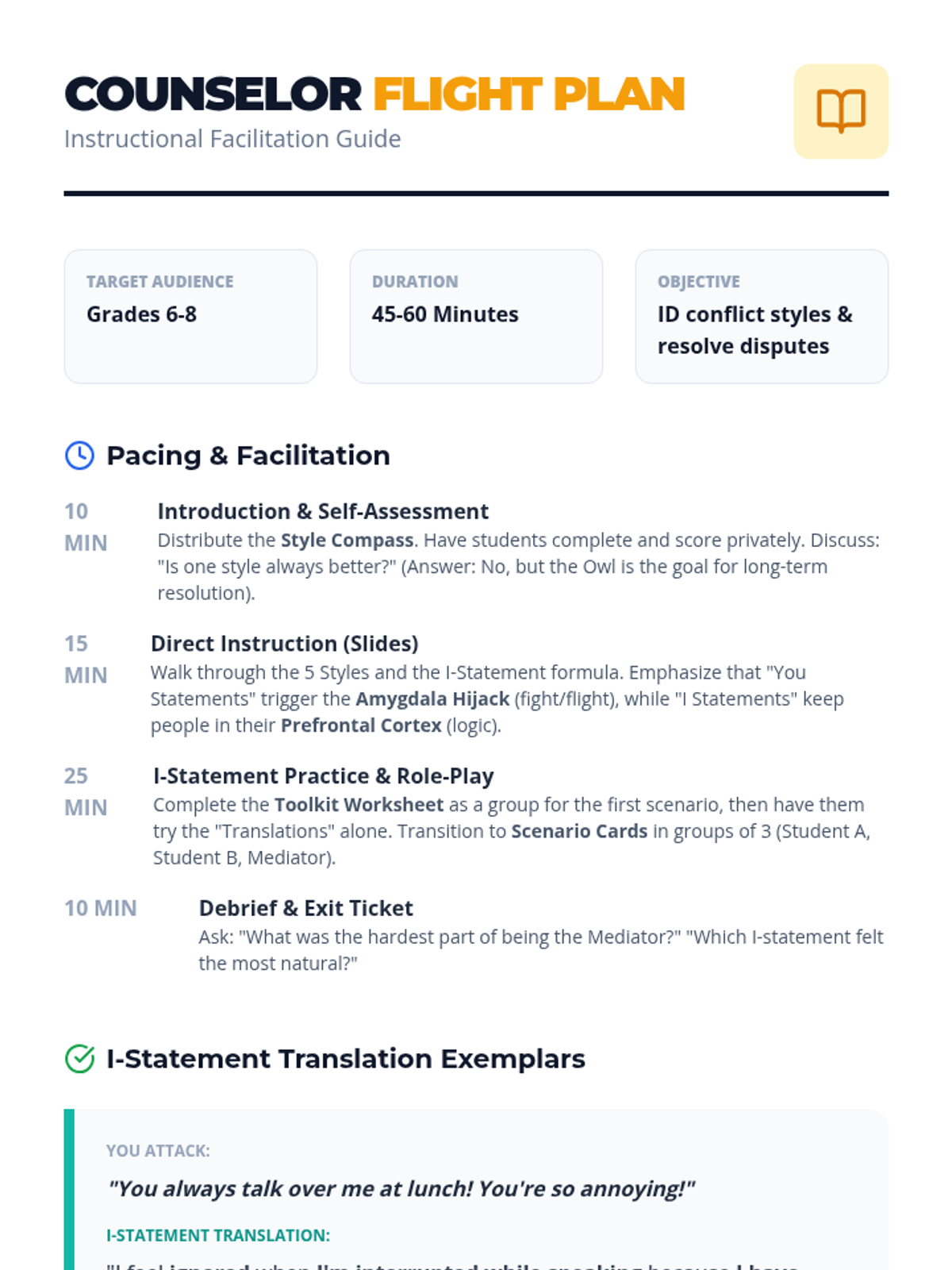 A middle school counseling lesson focused on navigating interpersonal conflicts using the 5 conflict styles, 'I statements', and peer mediation techniques. Students will identify their personal conflict style and practice active communication strategies.