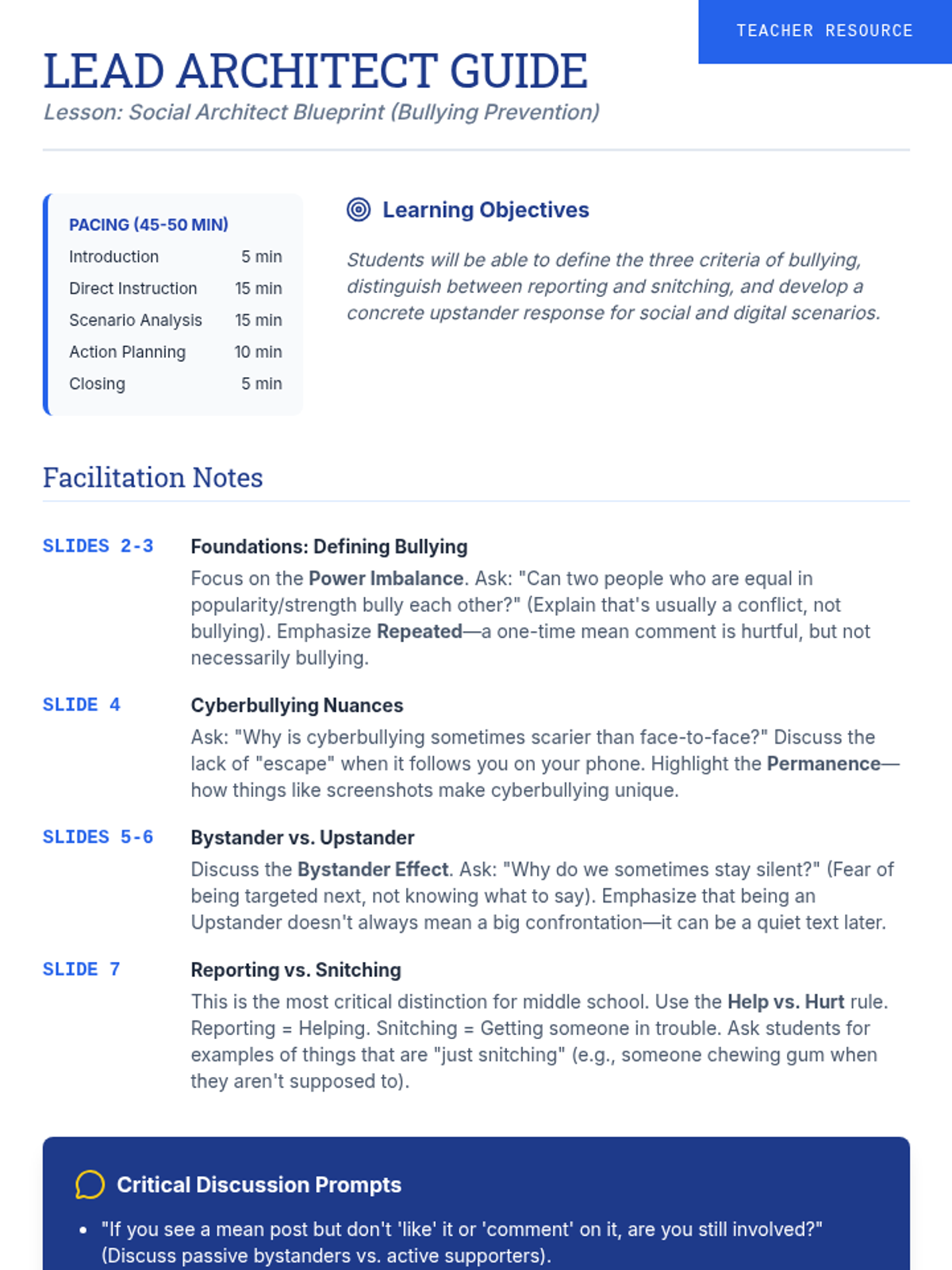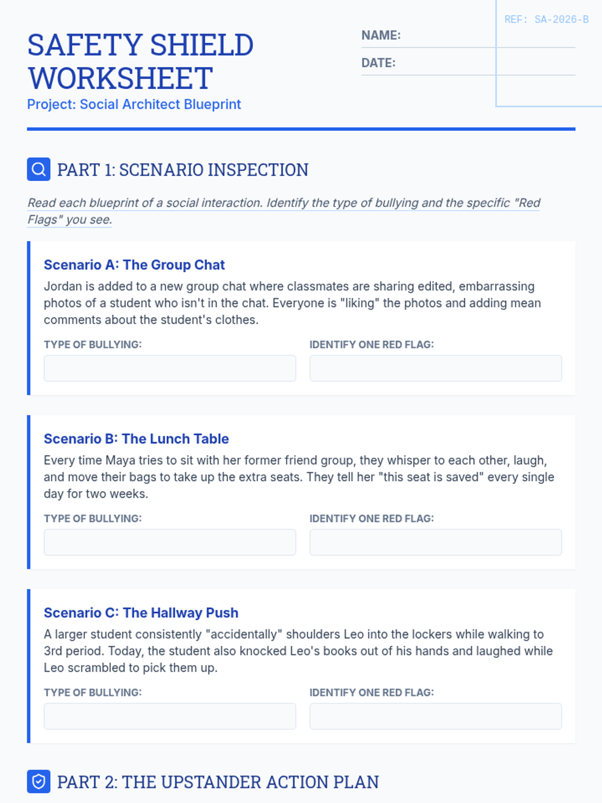A comprehensive middle school counseling lesson focused on identifying bullying and cyberbullying, empowering students to become upstanders, and establishing clear reporting pathways. Students will analyze real-world scenarios and develop a personal action plan for fostering a safe school environment.