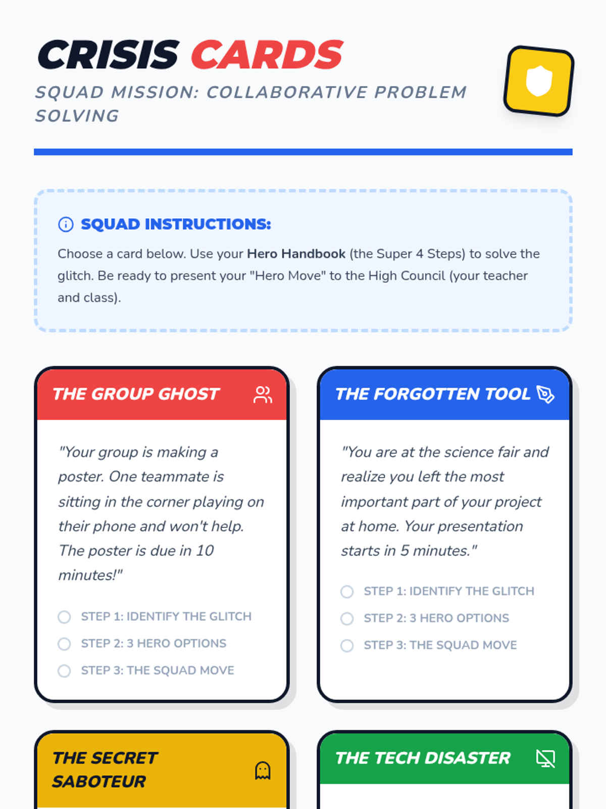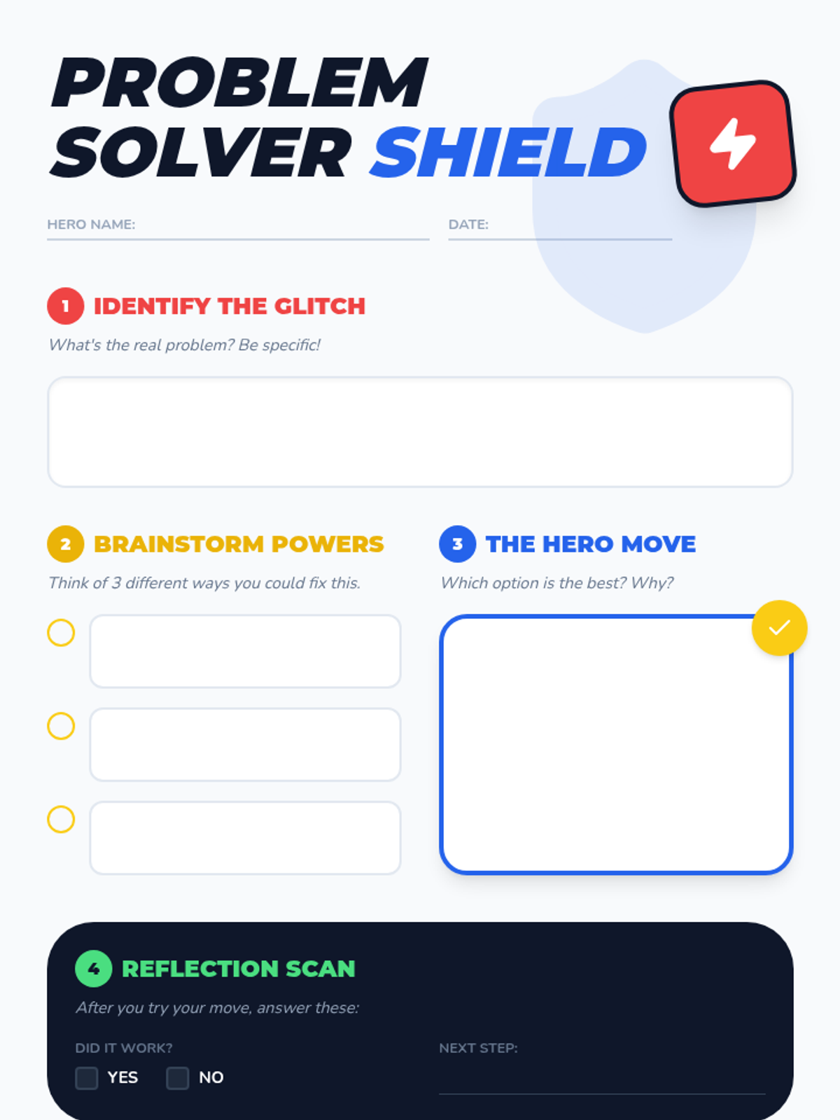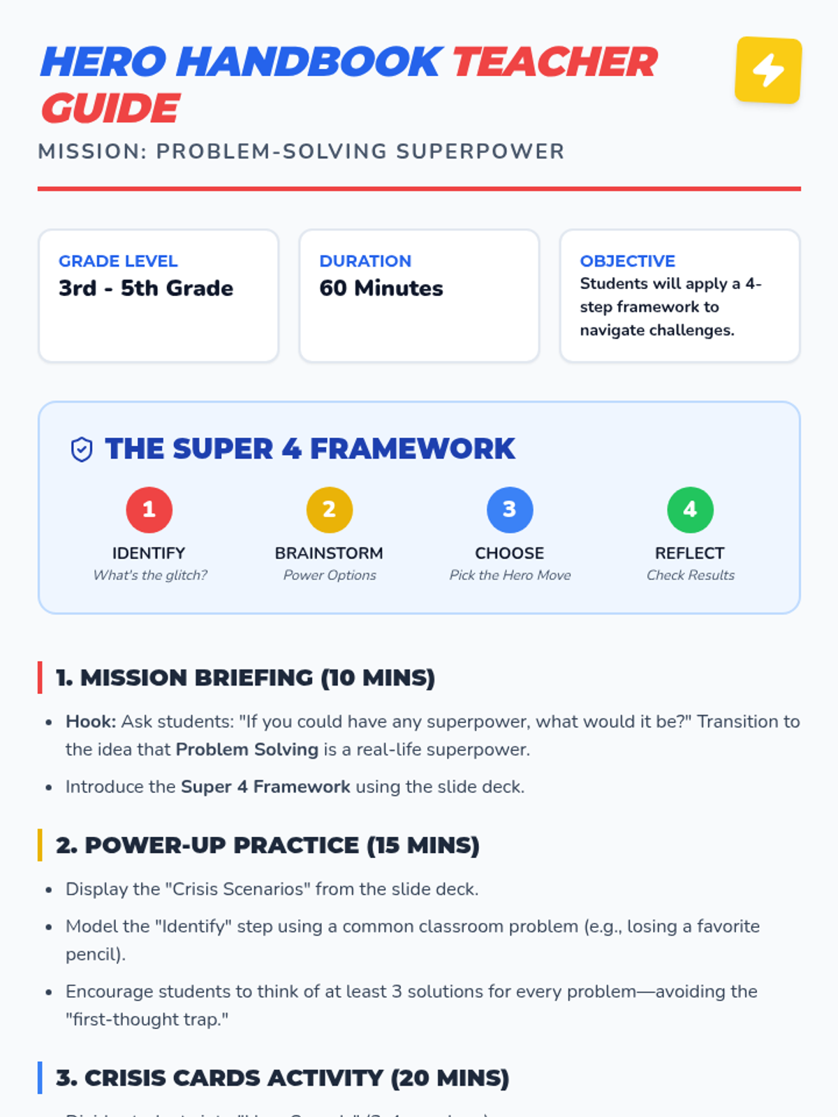 A dynamic lesson that transforms problem-solving into a 'superpower' for 3rd-5th graders. Students master a 4-step framework (Identify, Brainstorm, Choose, Reflect) through comic-book themed scenarios and collaborative challenges.